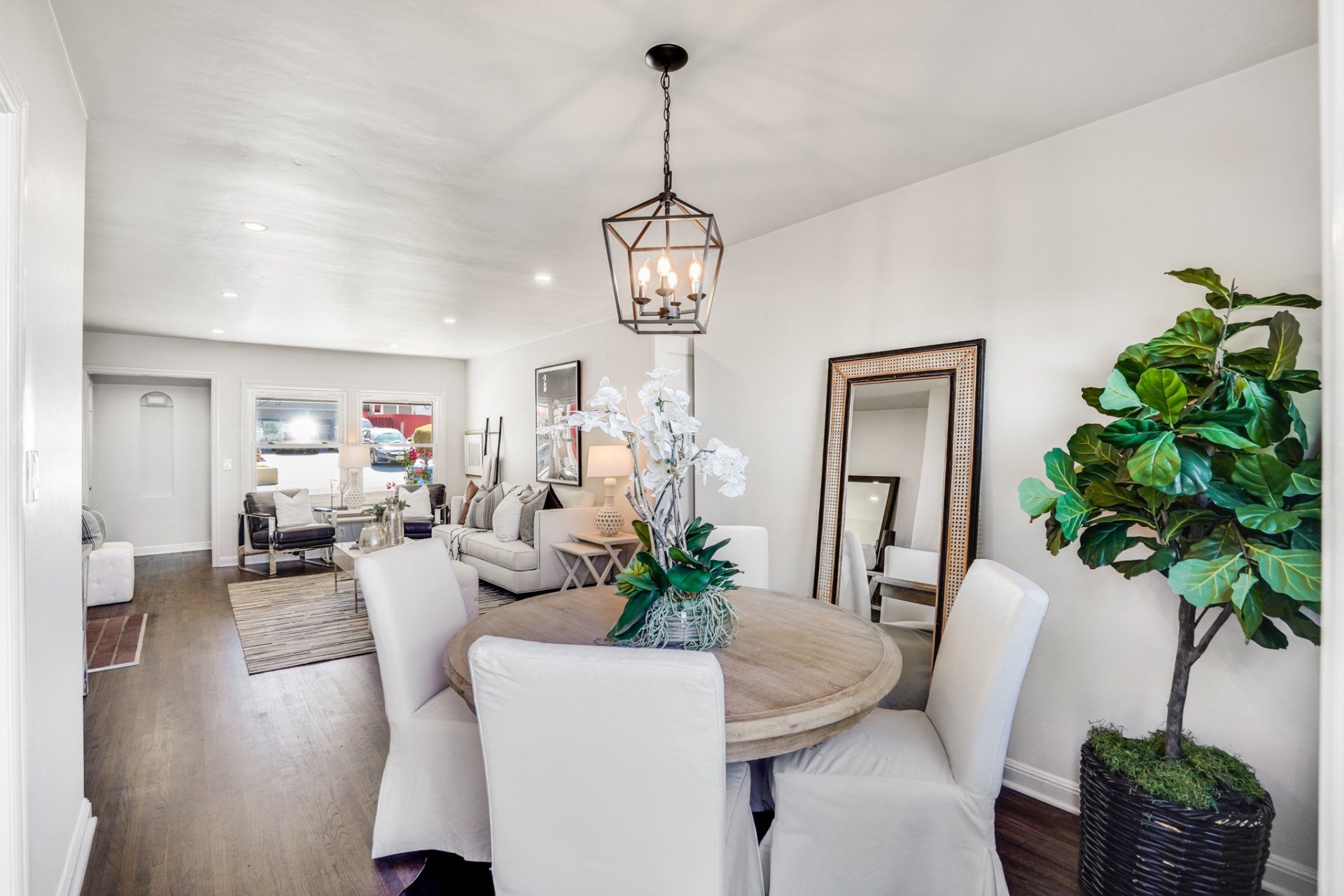 From the street, tall mature trees anchor the corners of this home and provide shade for the grassy front lawn. A cute walkway leads to a wide front porch and extends a warm welcome to this charming bungalow home. Stepping inside, you’ll be greeted by newly refinished hardwood floors running throughout the house. The open living area receives natural light from a double set of windows, and a wood-burning fireplace lends a cozy touch for crisp evenings. The adjacent dining area is anchored by a new chandelier, with more natural light entering from a large window and a wood and glass-paneled door which provides access to the patio and backyard.