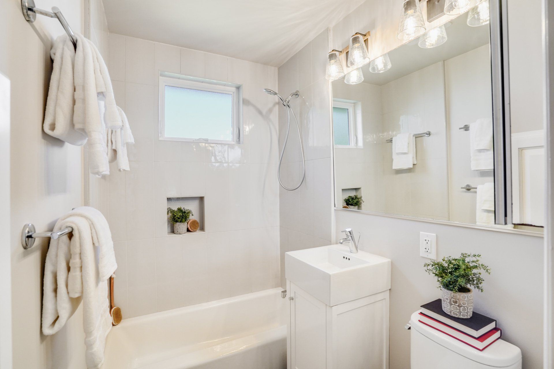 Private quarters are on the left side of the house with two bedrooms, one with a front-facing window and the other with corner windows overlooking the rear yard. The updated hallway bath has a stylish cabinet-mounted vessel sink, new lighting, a combo tub/shower with a large format tile surround, and a window to provide natural light and ventilation.