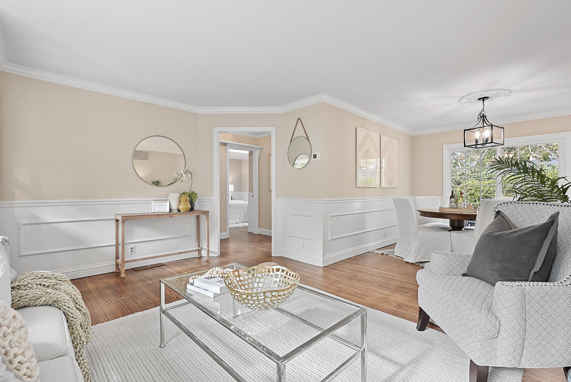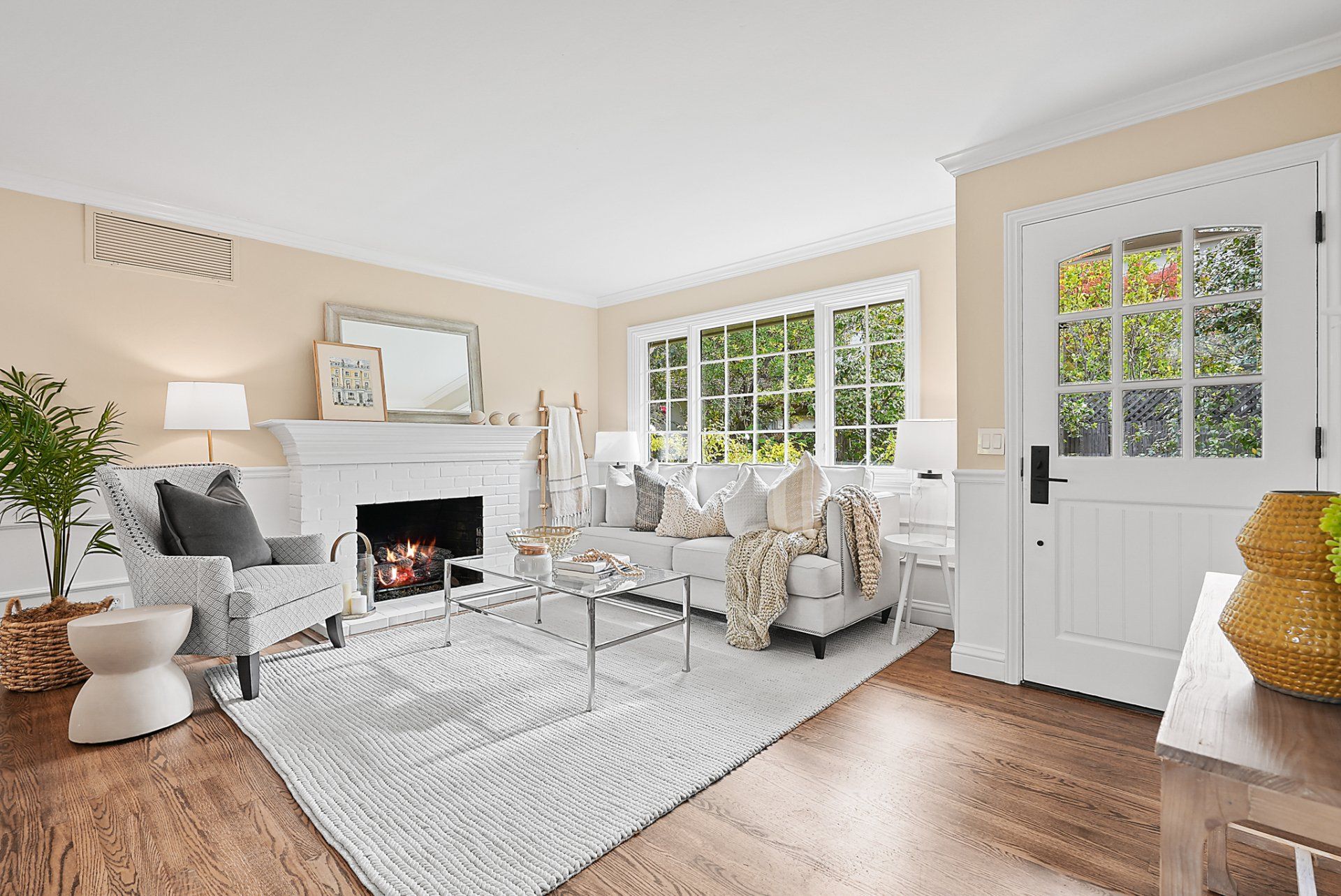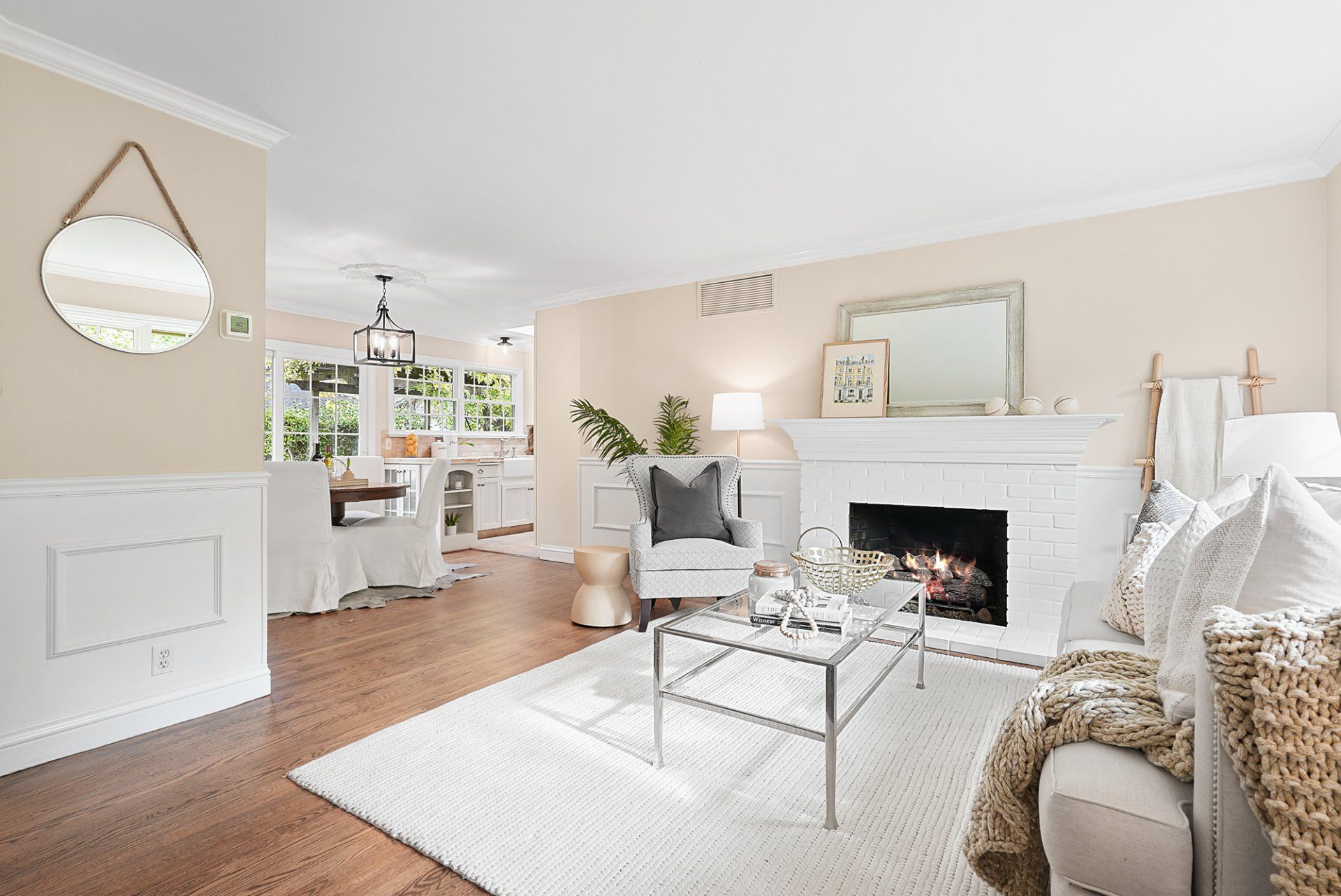 - Cozy, well-lit living room with elegant wainscoting and a gas-insert fireplace.