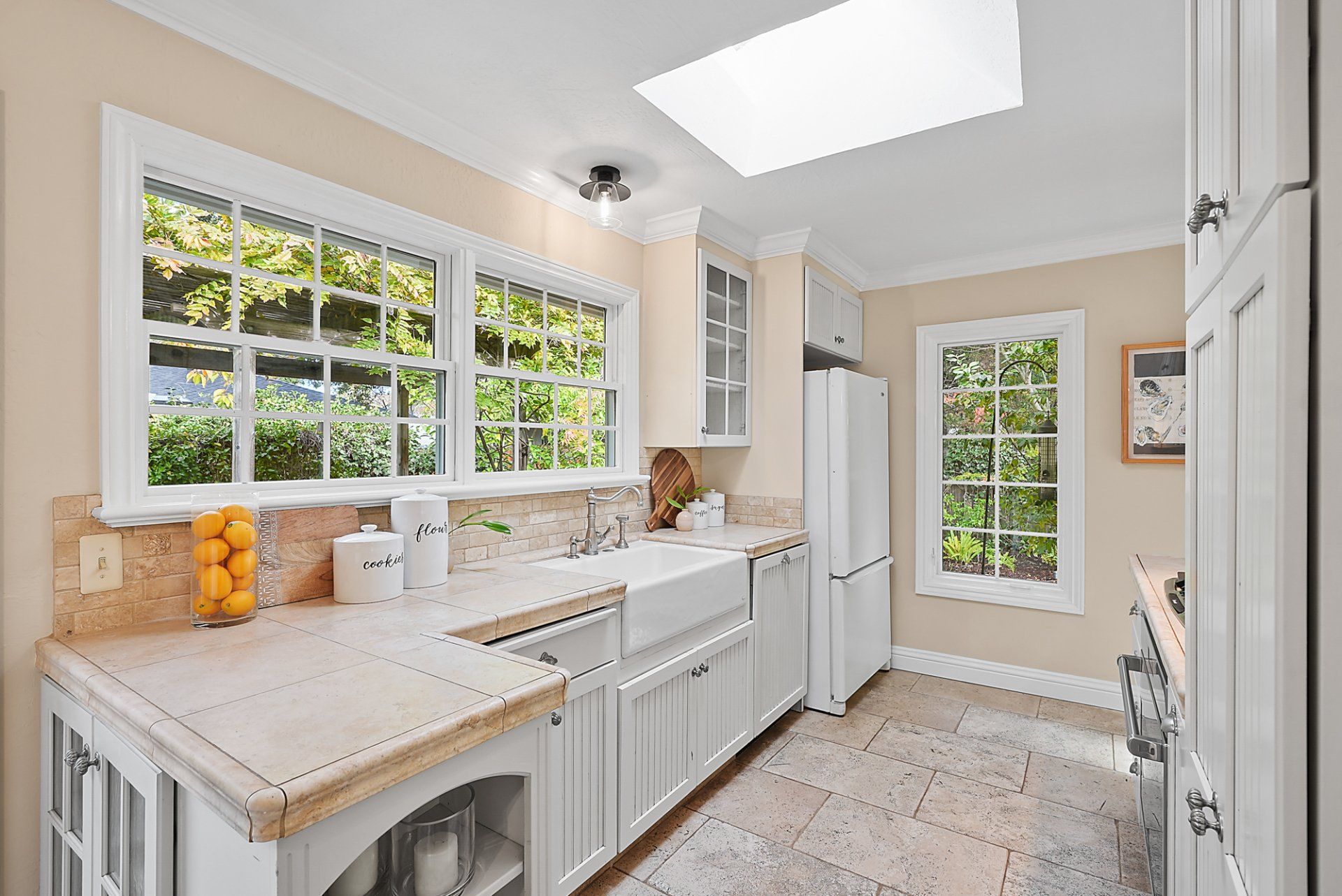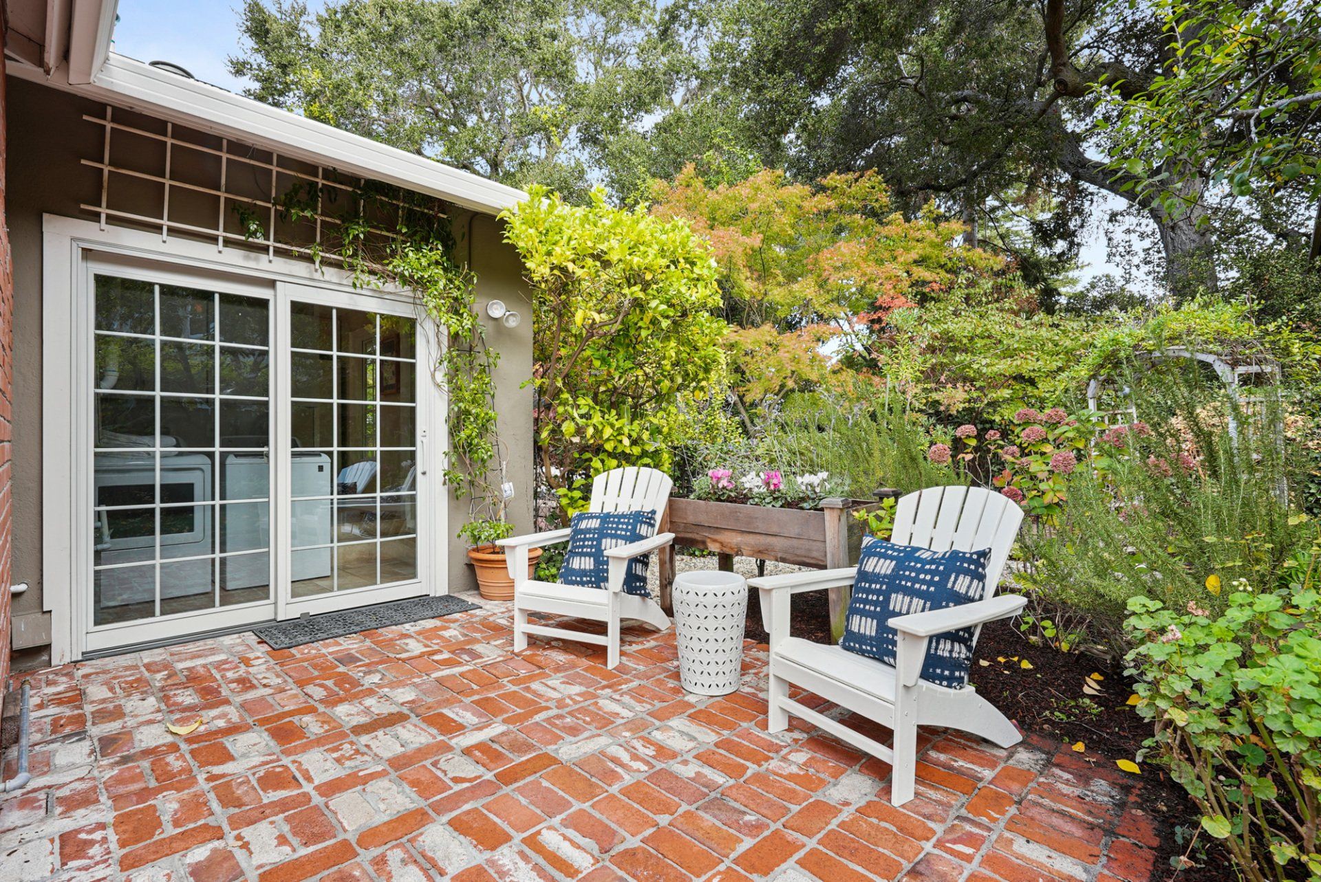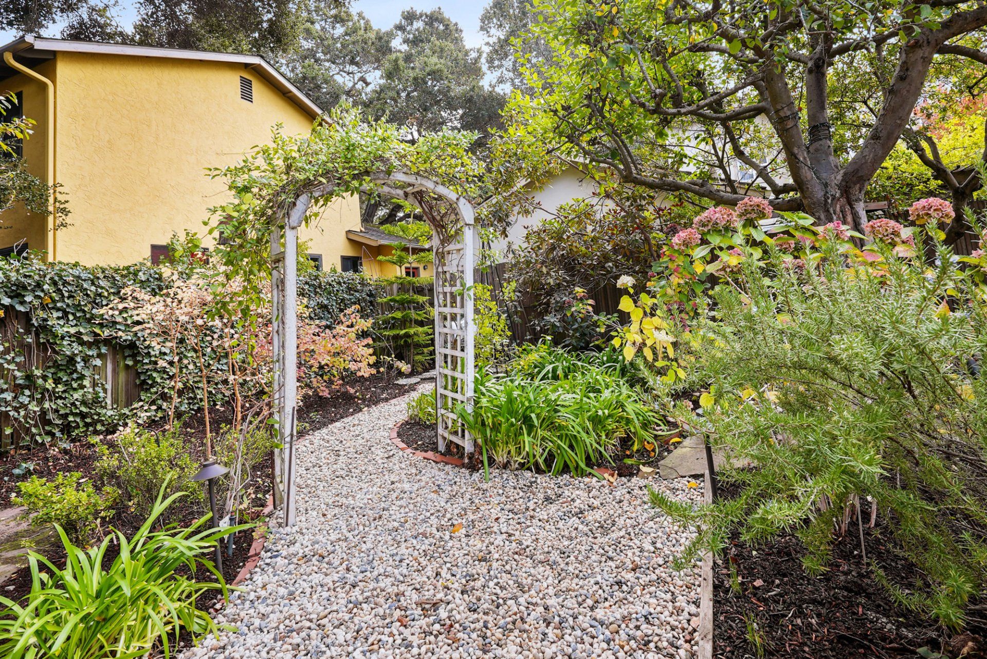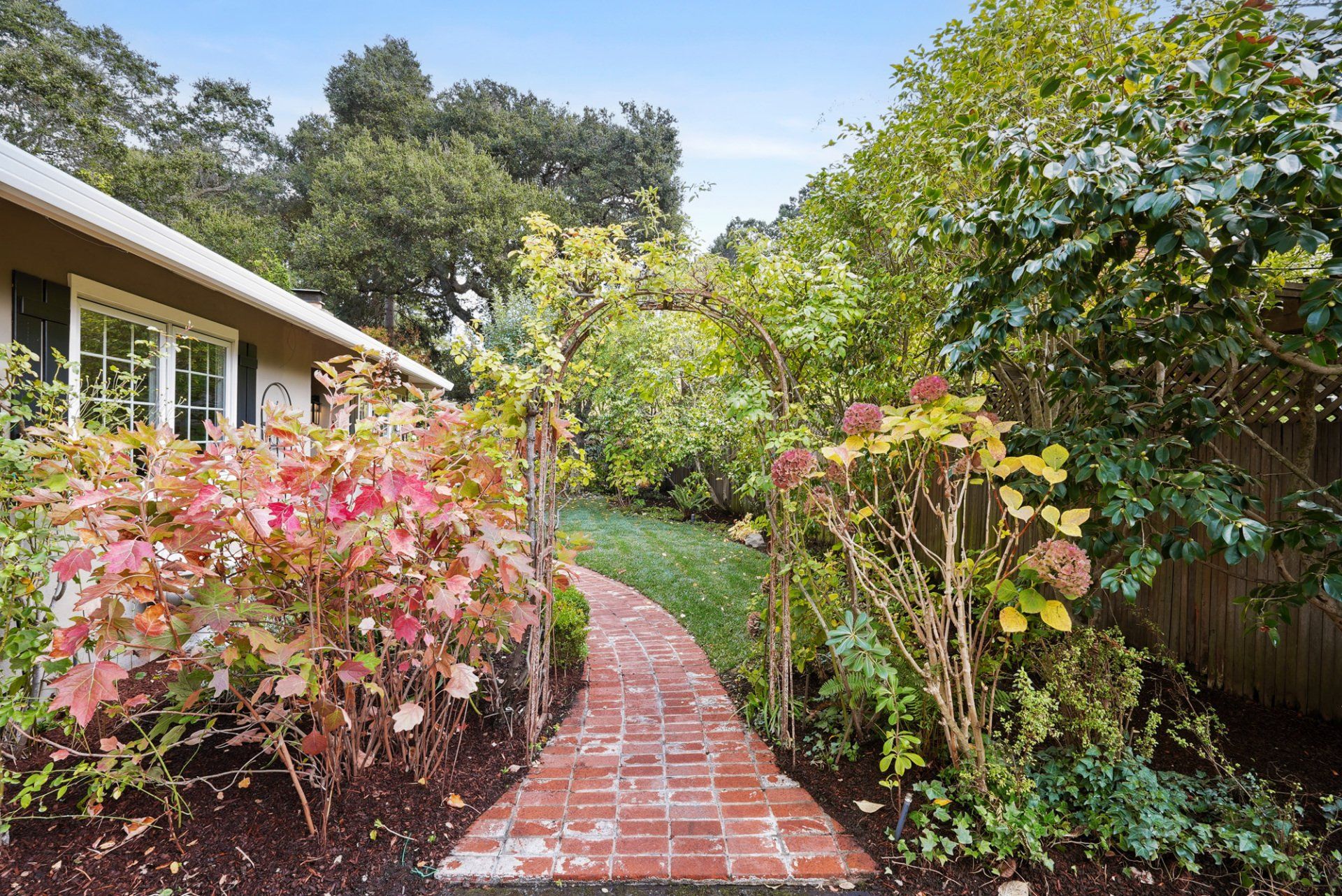 Charming cottage-style home | Secluded flag lot | Gated entry | Enchanting wrap-around gardens | Gravel walking paths | Attached garage | Off-street parking | Brick sidewalk | Hardwood Flooring | Wainscoting | Gas-insert fireplace | Multiple skylights | Ample natural light | Glass enclosed shower | Pedestal sink | Tub | Stylish Wallpaper | Sliding glass doors | Farmhouse sink | Thermador gas cooktop | Dedicated laundry room | Deck | Pergola | Multiple brick patios
