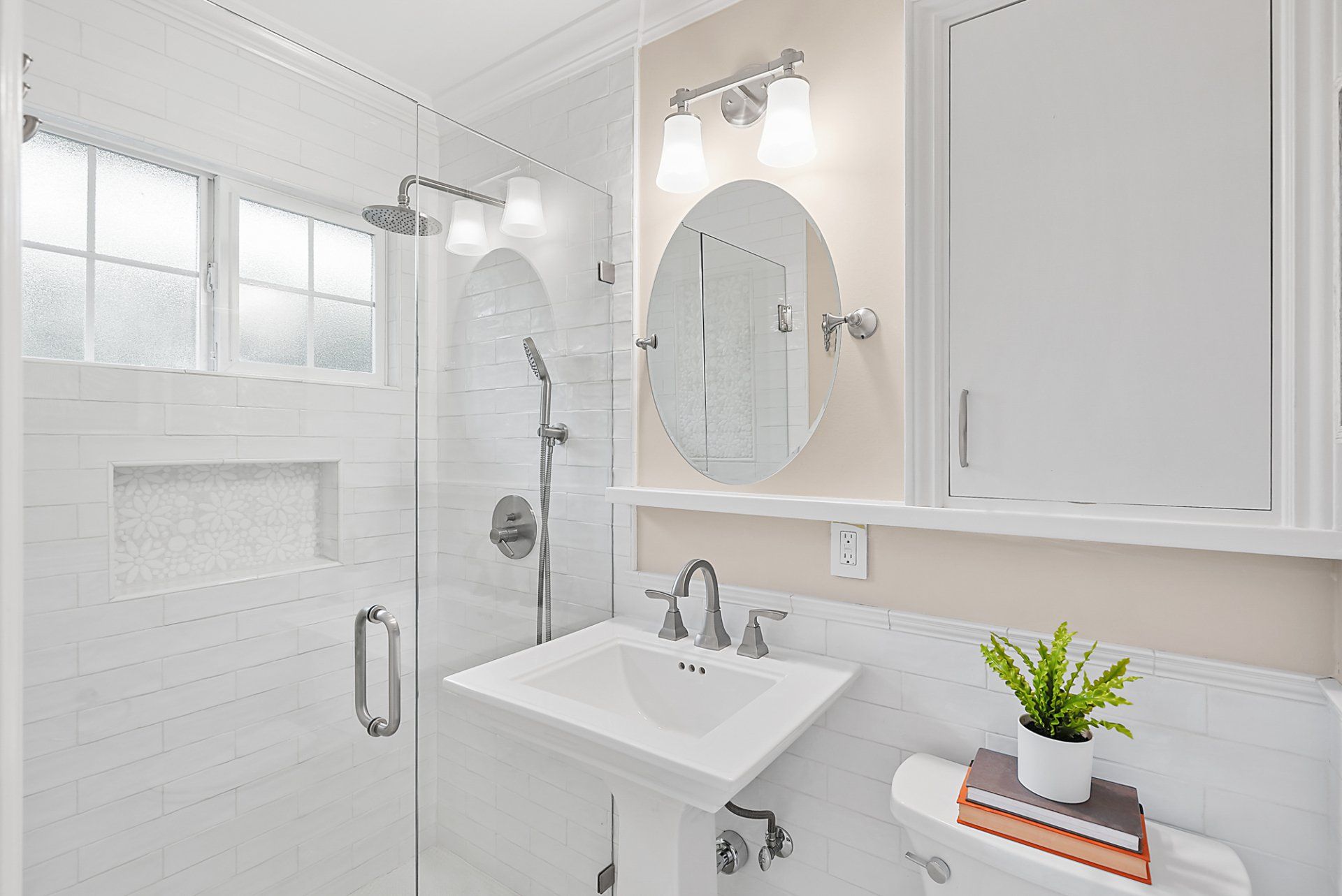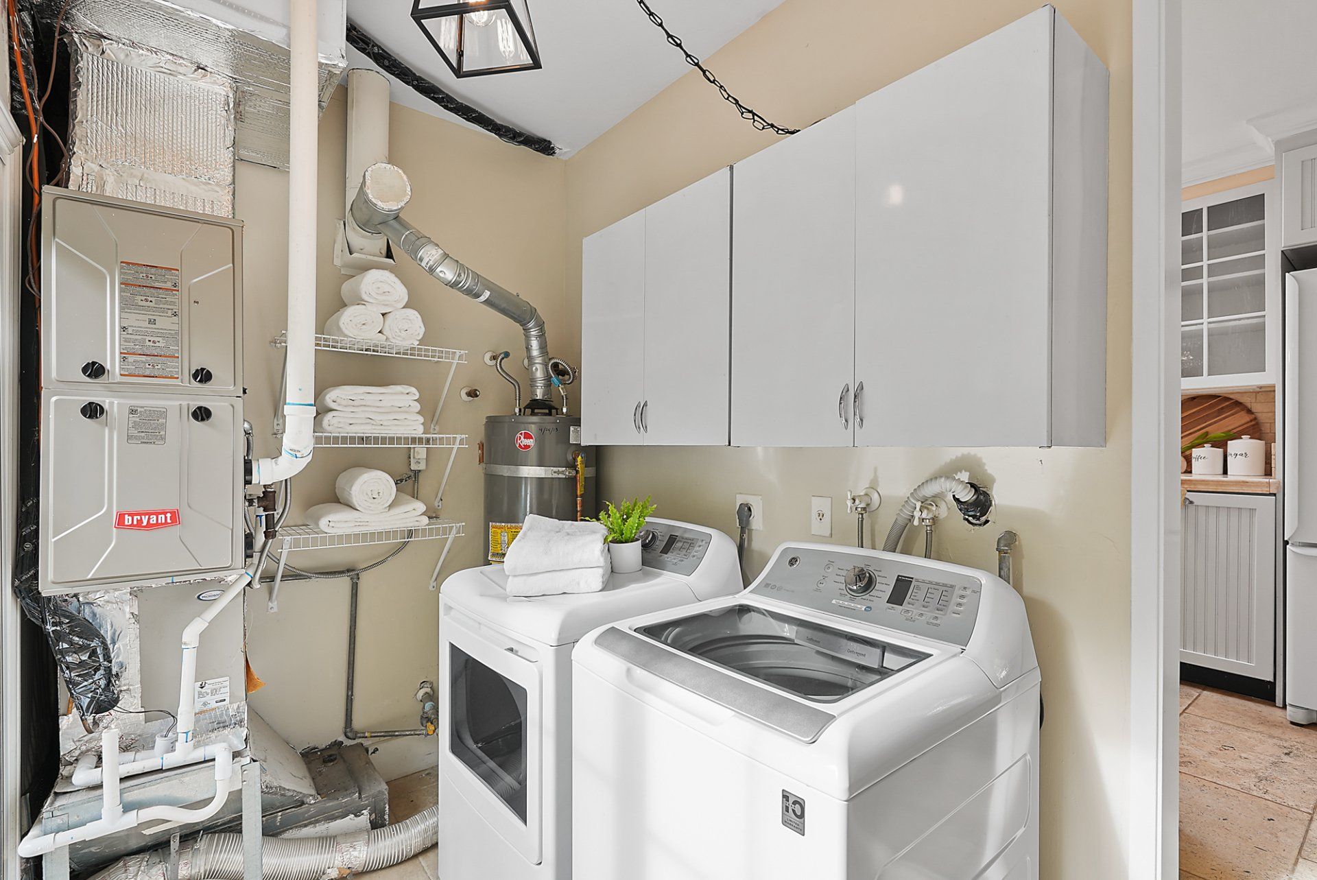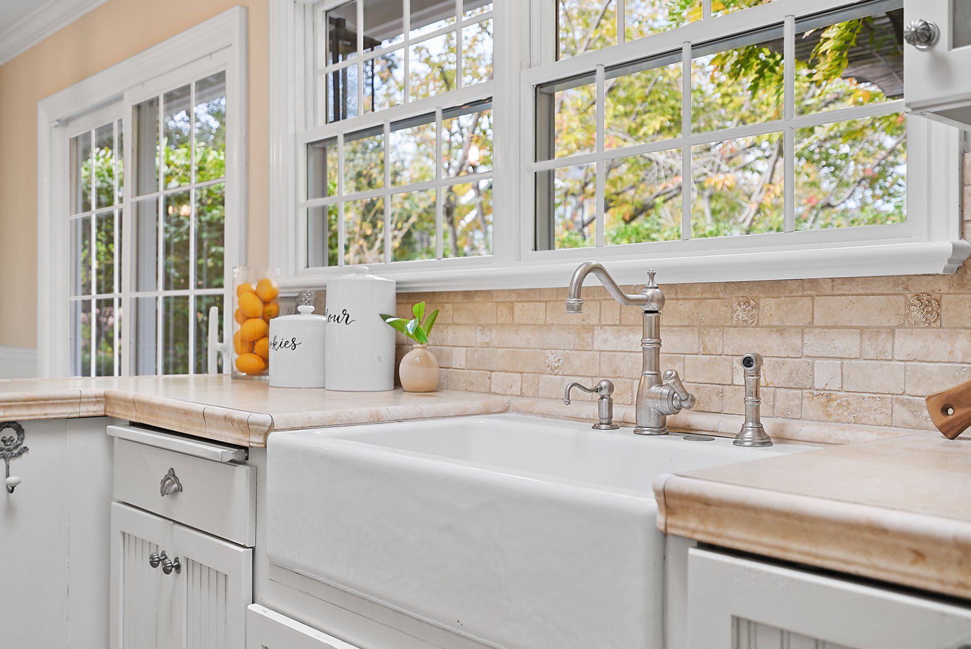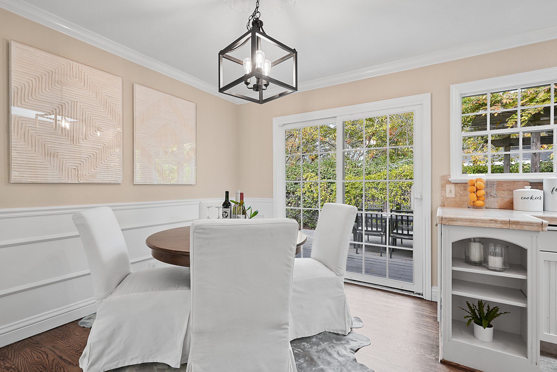 Beside the living room, a dining area is naturally lit by glass doors opening to the backyard’s elevated deck. In the darling kitchen, appreciate stainless steel appliances and ample cabinetry. A farmhouse sink with classic hardware looks out over the backyard’s patio, granting plenty of natural light and a picturesque view. Through the kitchen, step down to the dedicated laundry room with another set of glass doors that leads to one of the garden’s brick patios.