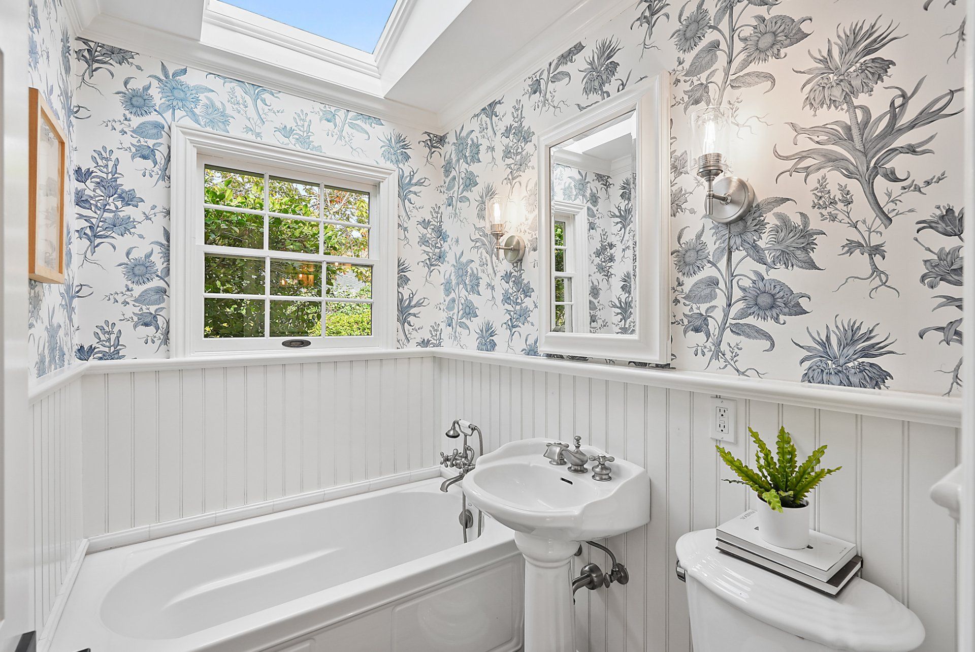 - Gorgeously appointed hallway bathroom with a tub, skylight, and stylish wallpaper.