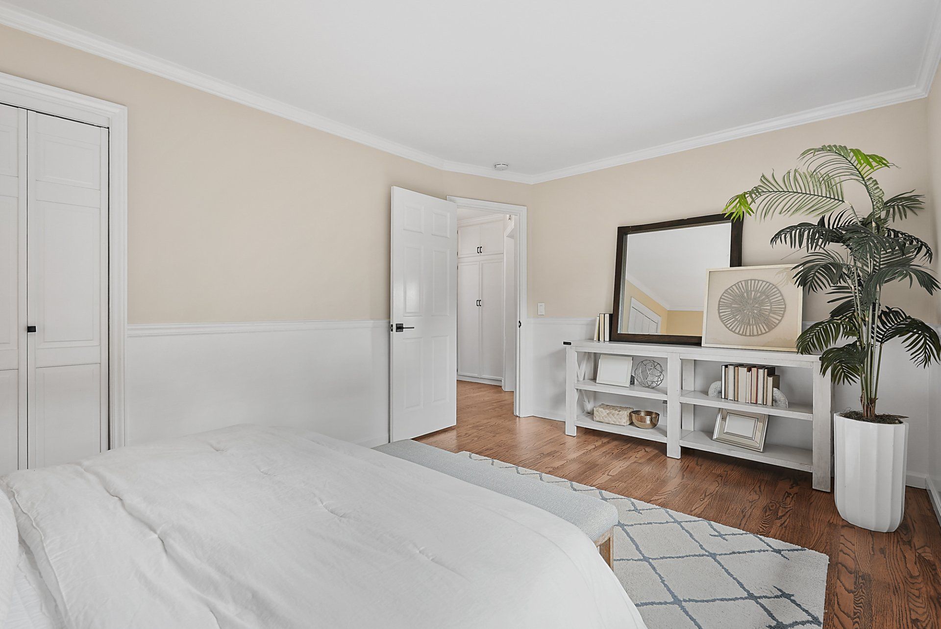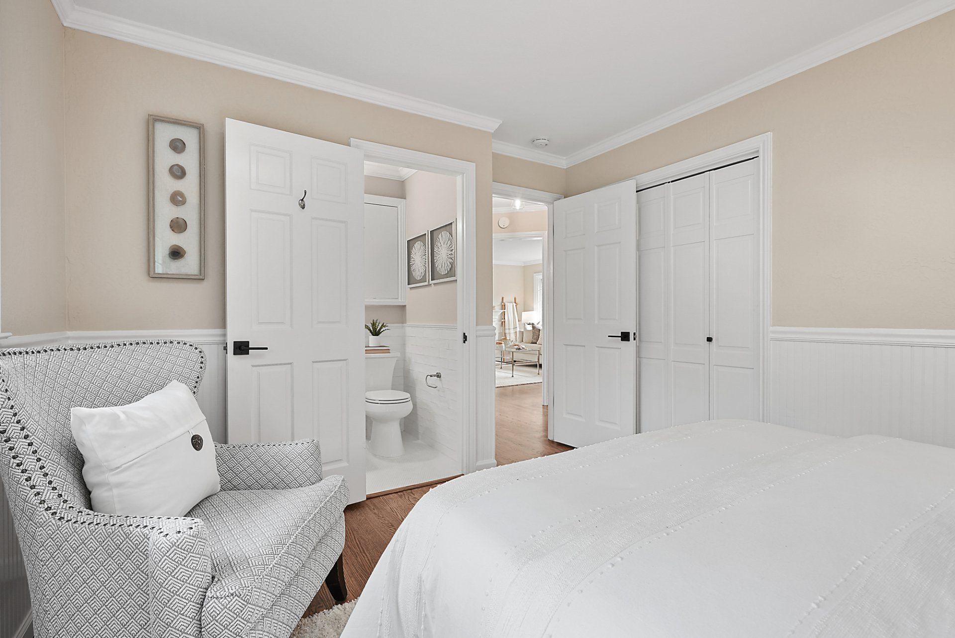 Elegant wainscotting — present throughout the home — lines the living room, where a gas-insert fireplace with a white brick surround offers a cozy spot to spend your evenings. To the left, the bedroom quarters include two bedrooms and two bathrooms. Natural light enters into the primary suite through a large paned window overlooking part of the gardens. The pristine ensuite incorporates a glass-encased walk-in shower and a timeless pedestal sink. The versatile guest bedroom provides an airy and inspiring space for a home office, and the adjacent hallway bathroom is gorgeously appointed with a tub, skylight, and stylish wallpaper.