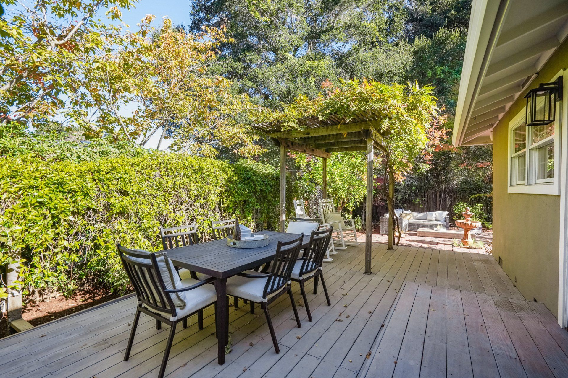 - Enchanting mature trees and gardens with gravel paths that wrap-around the property, multiple brick patios, a deck, and a pergola.