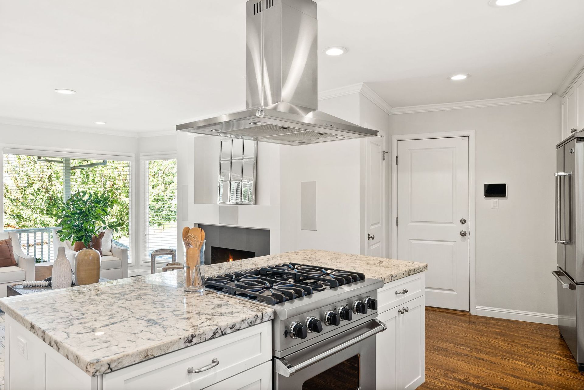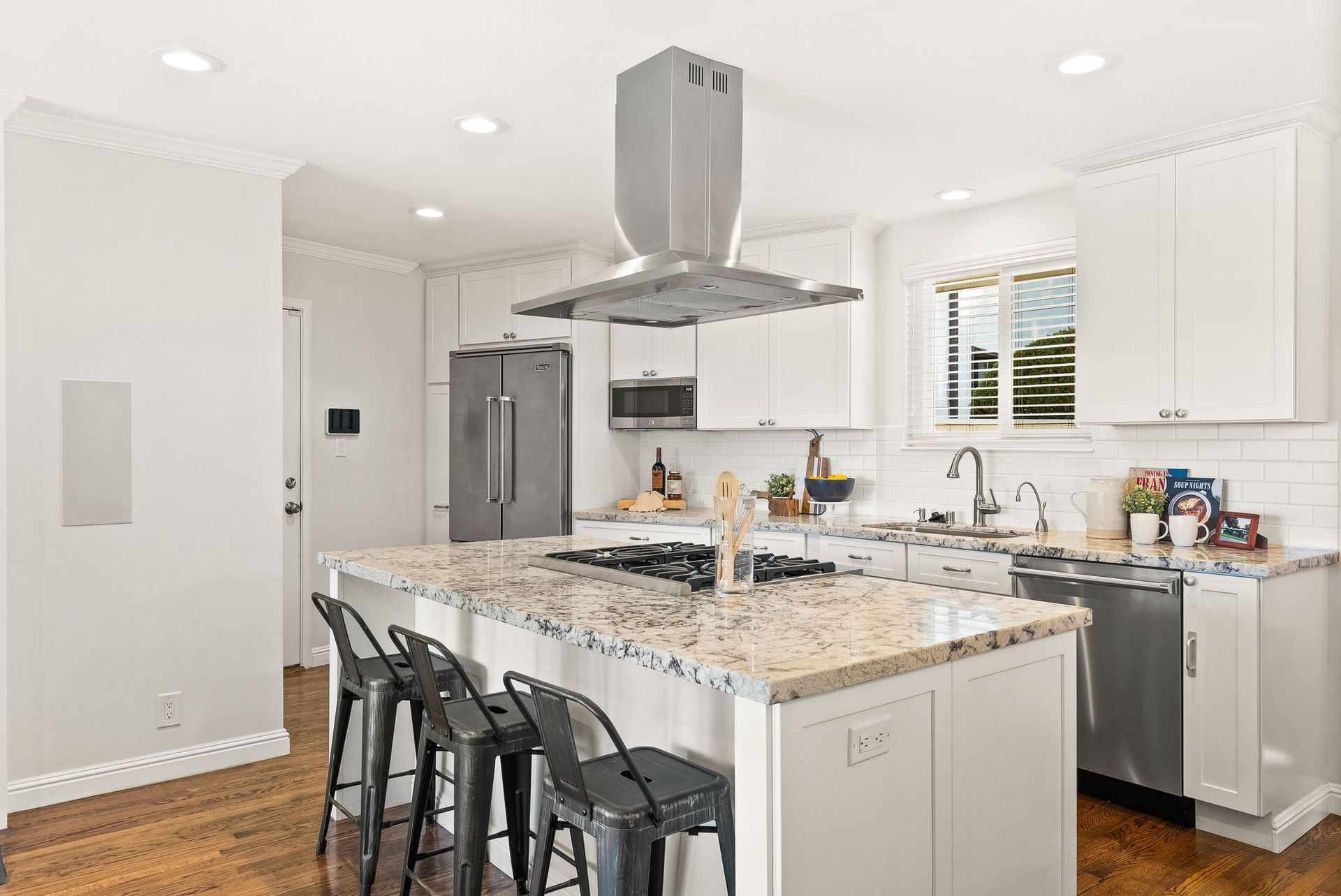 - Chef’s dream of a kitchen with a full suite of Viking appliances, stone countertops, sleek subway tile backsplash, and a center island with bar seating.