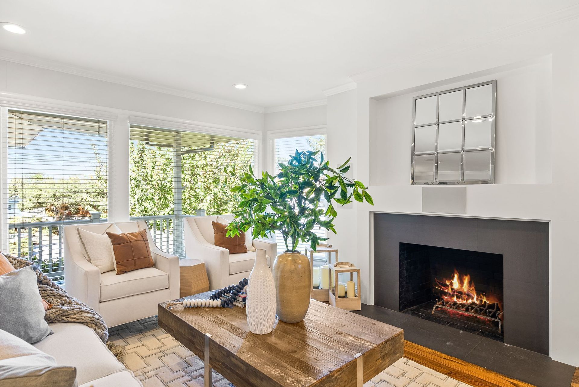 - Living room enriched by a wood-burning fireplace, built-in surround sound, and a wall of windows for natural light.