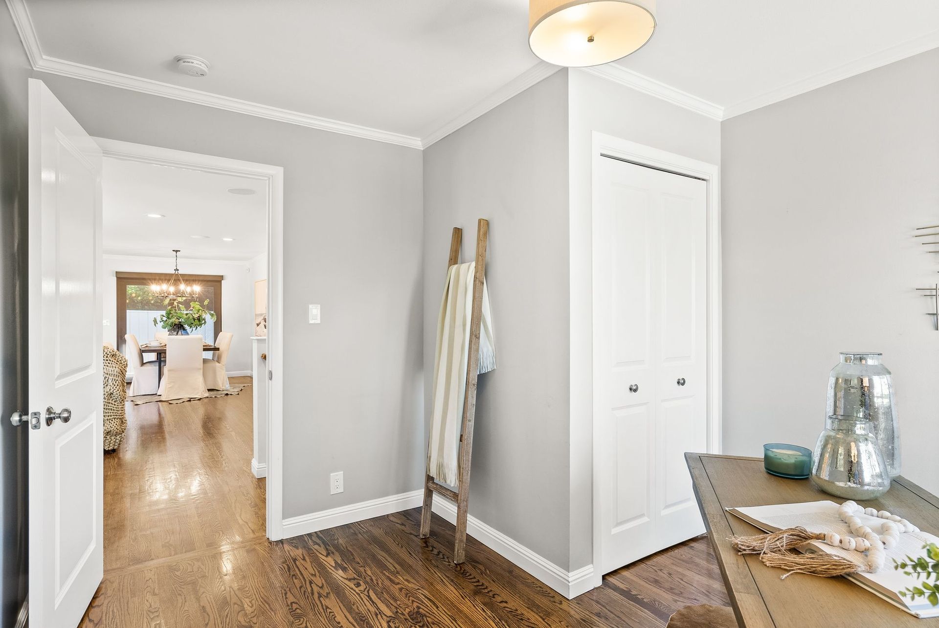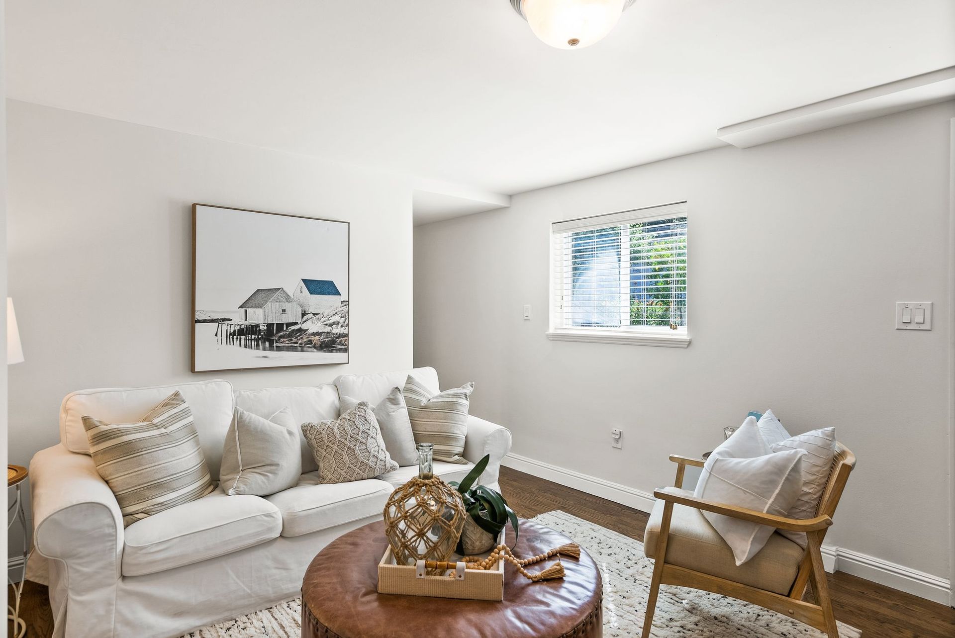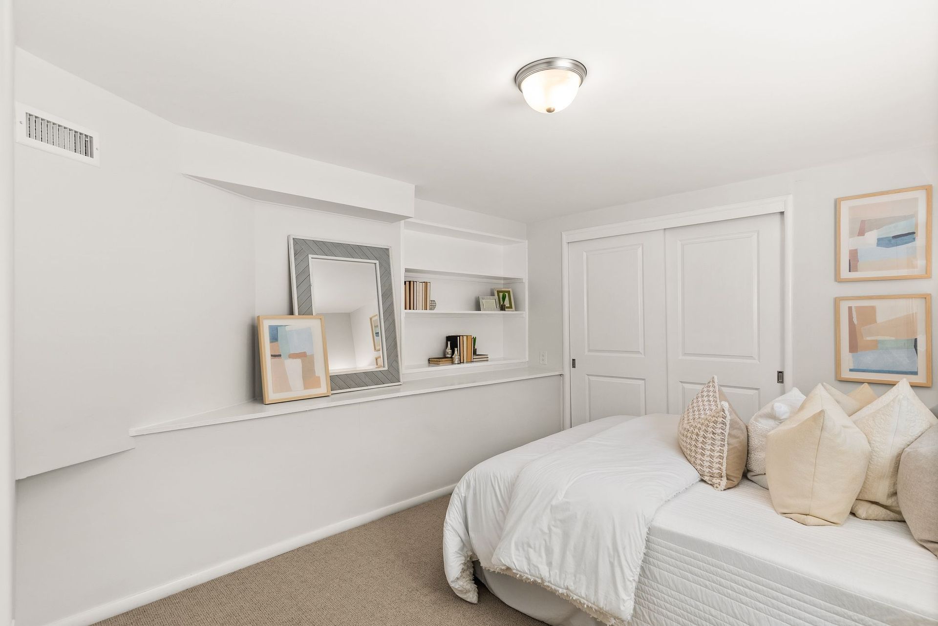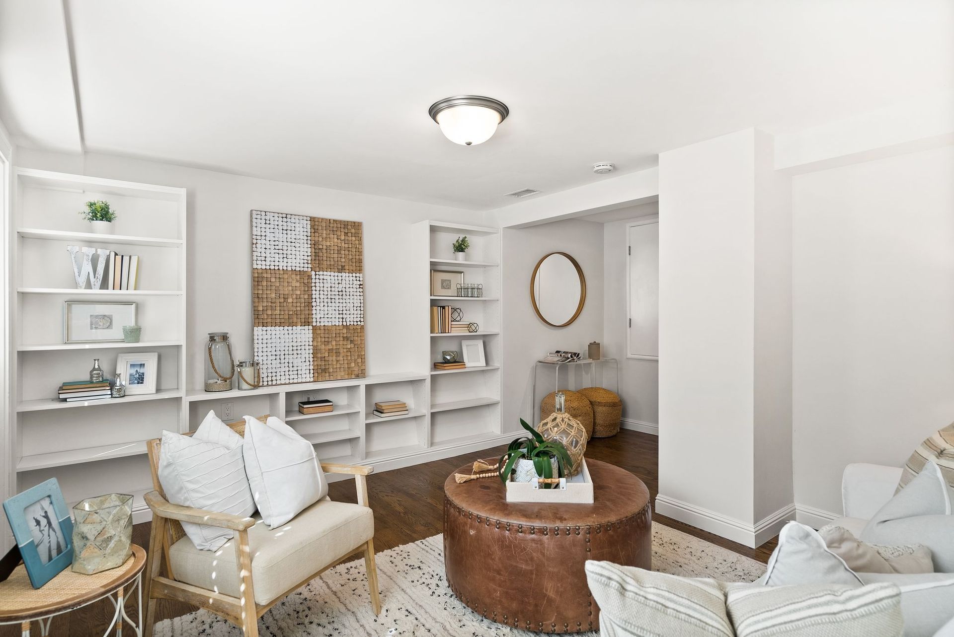 Completing this incredible floor plan, the lower level incorporates an additional living area adorned with plentiful built-in shelving. It opens to a hallway with a secondary guest bathroom and a third guest bedroom.