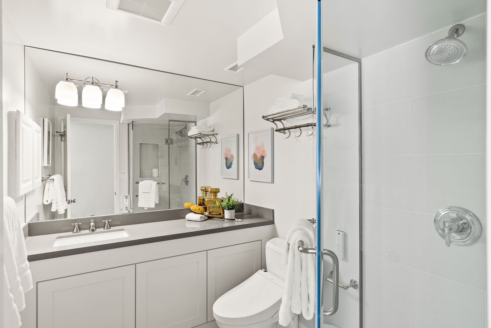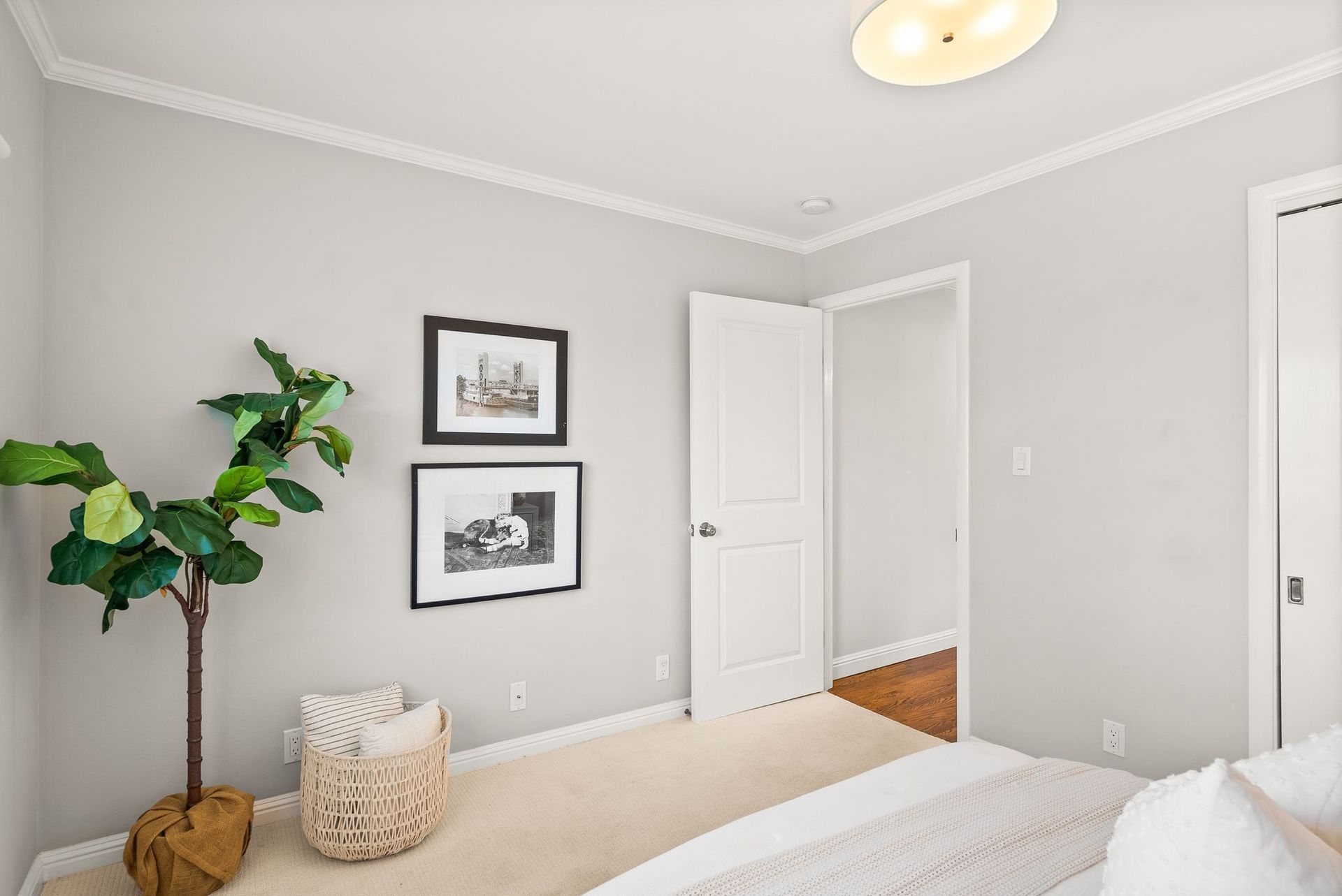 Residing on the main floor, warm rays of light pour into the dazzling primary suite through a large window that beautifully frames the dreamy backyard below. A spa-appointed ensuite offers ultimate rest and relaxation with double sinks and a glass-encased shower, while dual closets with a built-in safe line one of the bedroom walls. Two guest bedrooms accompany the primary suite on the entry-level floor, offering excellent closet space and a pristine hallway bathroom.