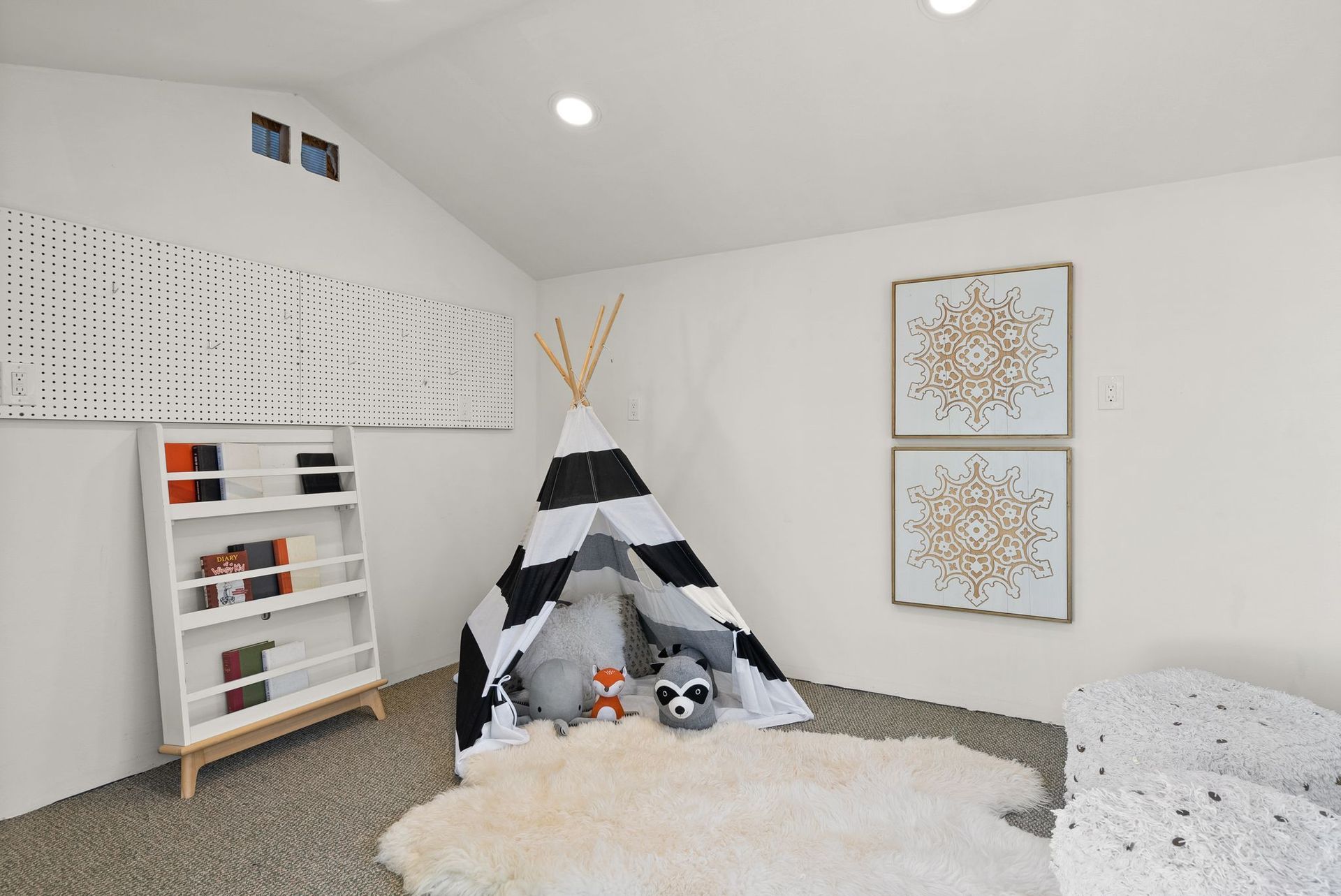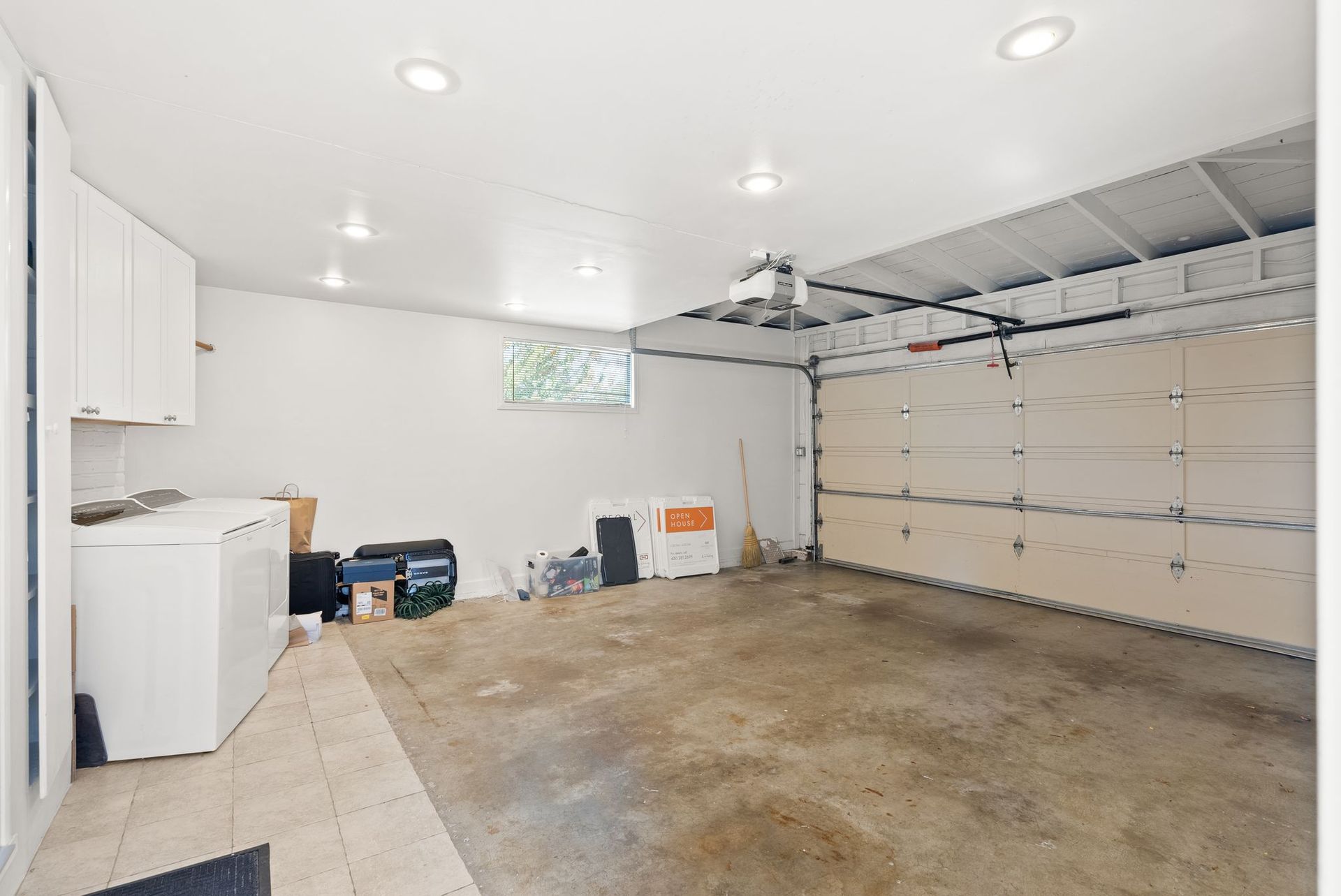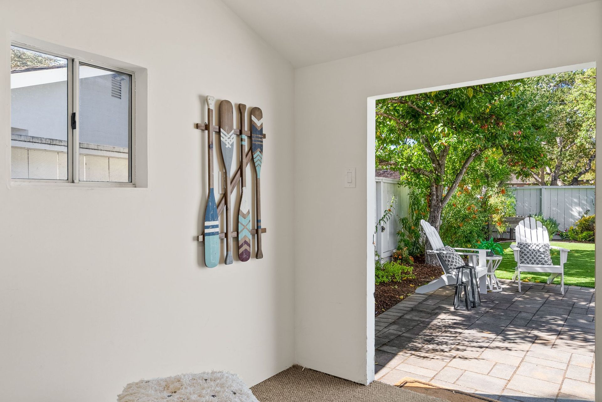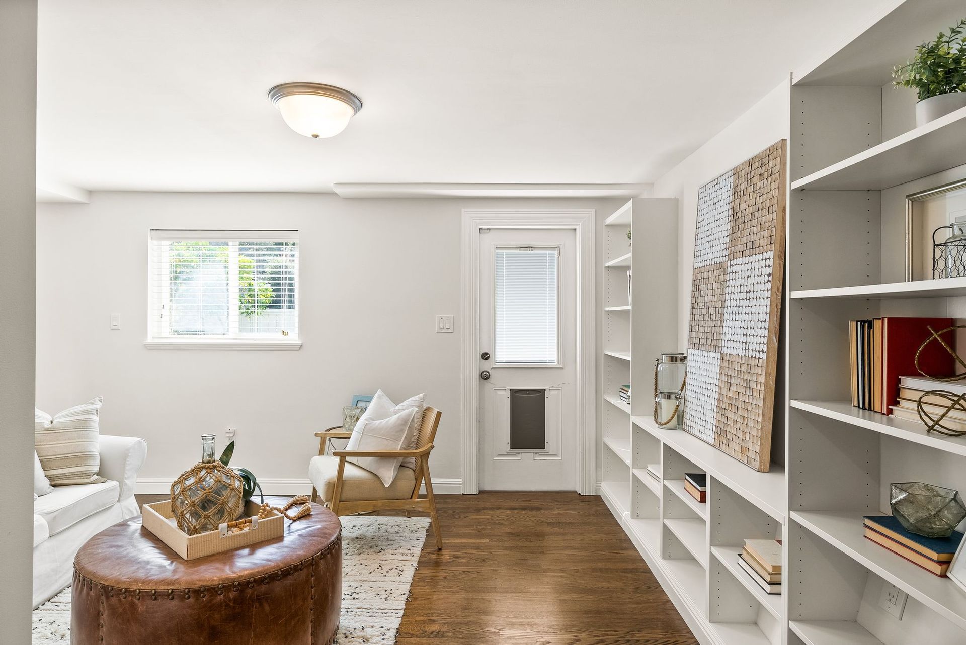 - Lower level living area adorned with plentiful built-in shelving grants access to the lower backyard.