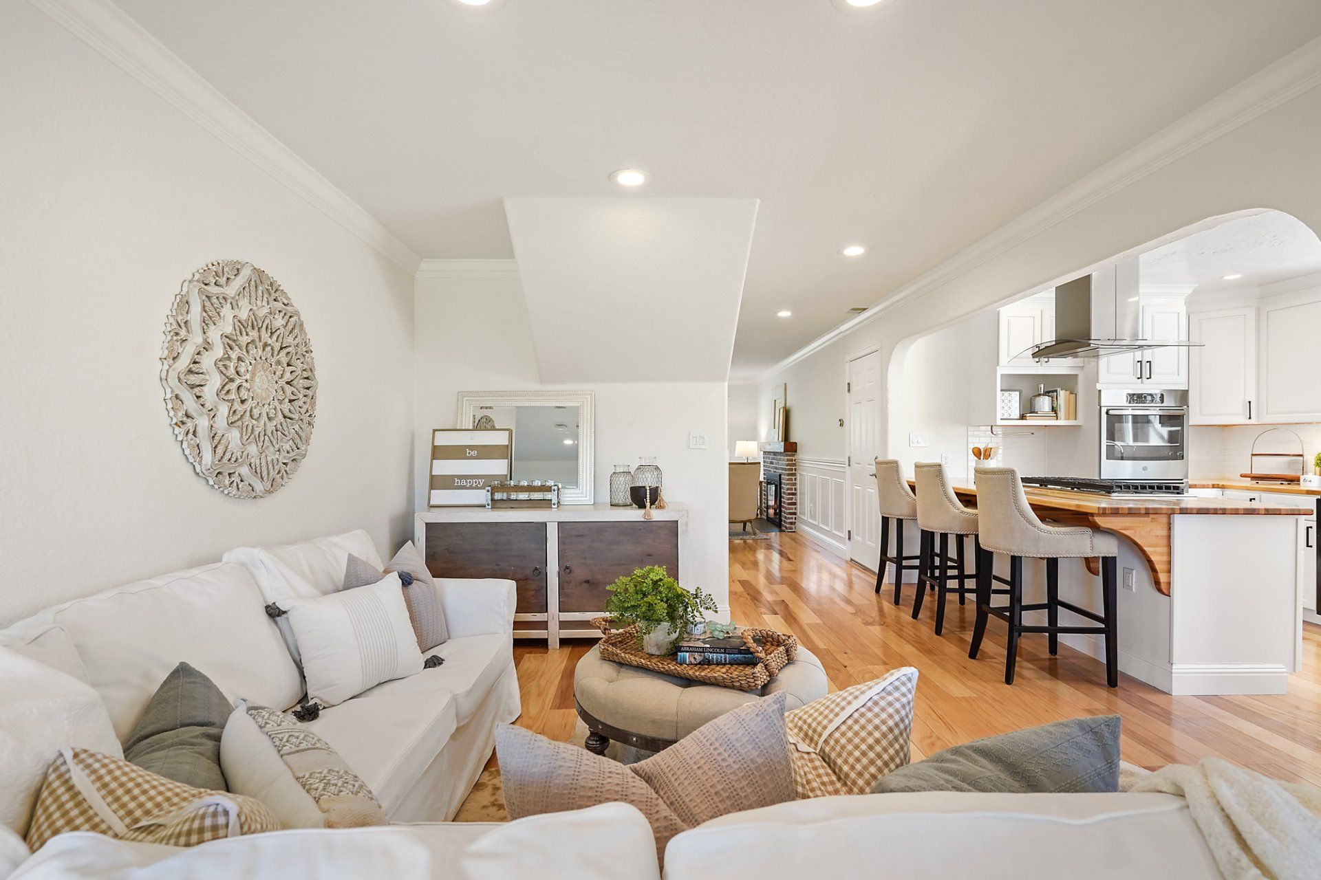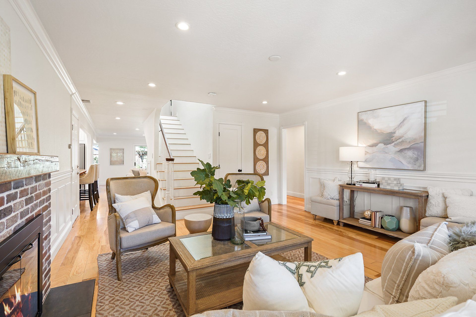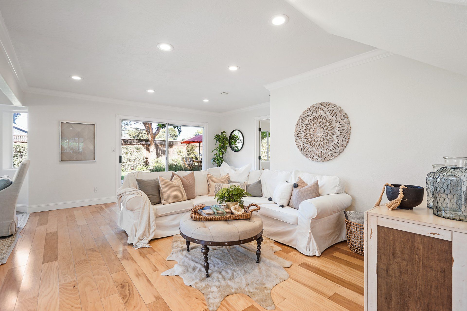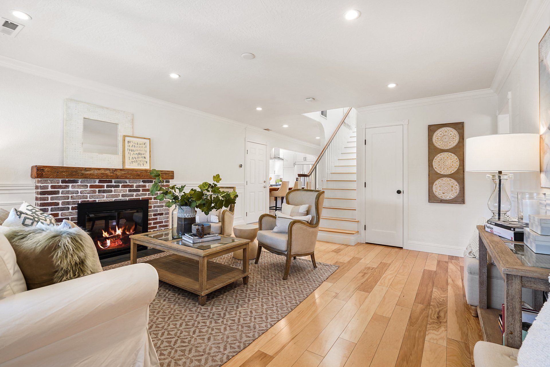 Entering inside an inviting formal living room, Natural Hickory engineered hardwood floors spread throughout the residence. Natural light filters in through large windows clad in white plantation shutters and a cozy gas fireplace is surrounded by a hearth and mantel with reclaimed wood from an inn dating back to the early 1900s in San Jose. The circular floor plan of this home creates an organic flow with an open, airy feeling. From the formal living room, head left toward the garage access, kitchen, and additional living areas, turn right to the main level bedrooms, and you’ll arrive back in the front living area. A staircase leads up to a second story with two additional bedrooms and a full bath. Under the stairs is a cupboard, perfect for toy storage or hide-and-seek!