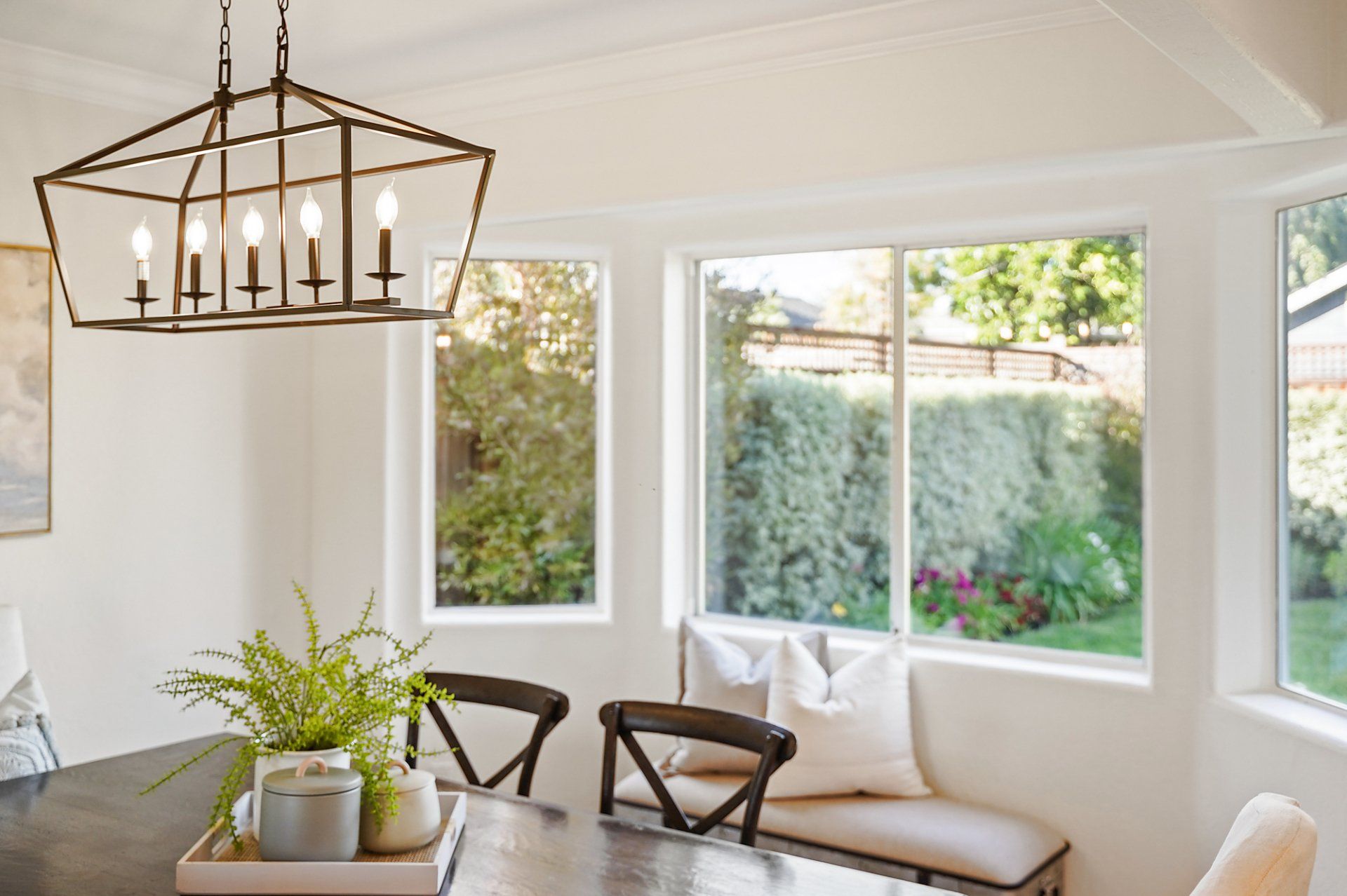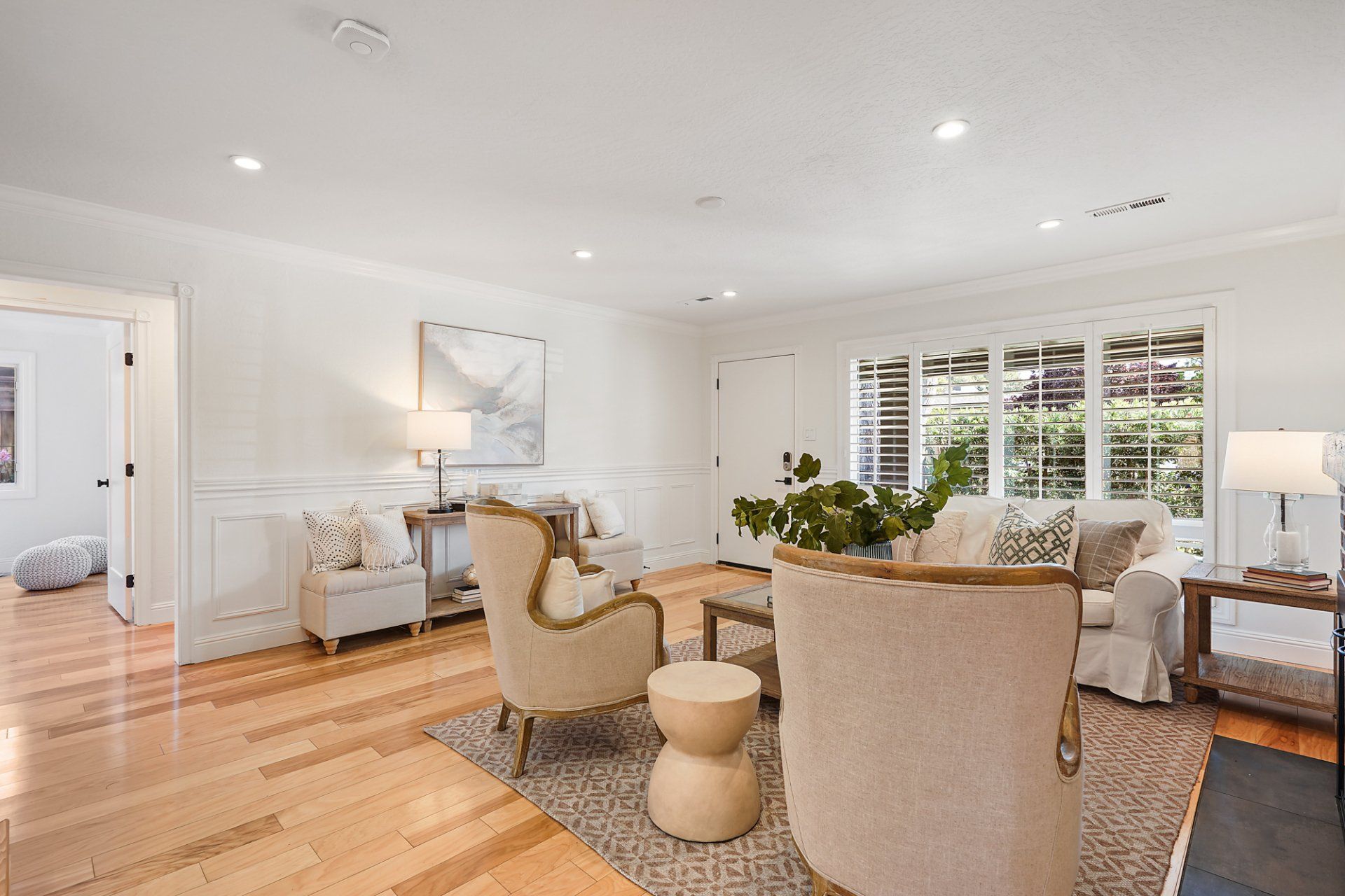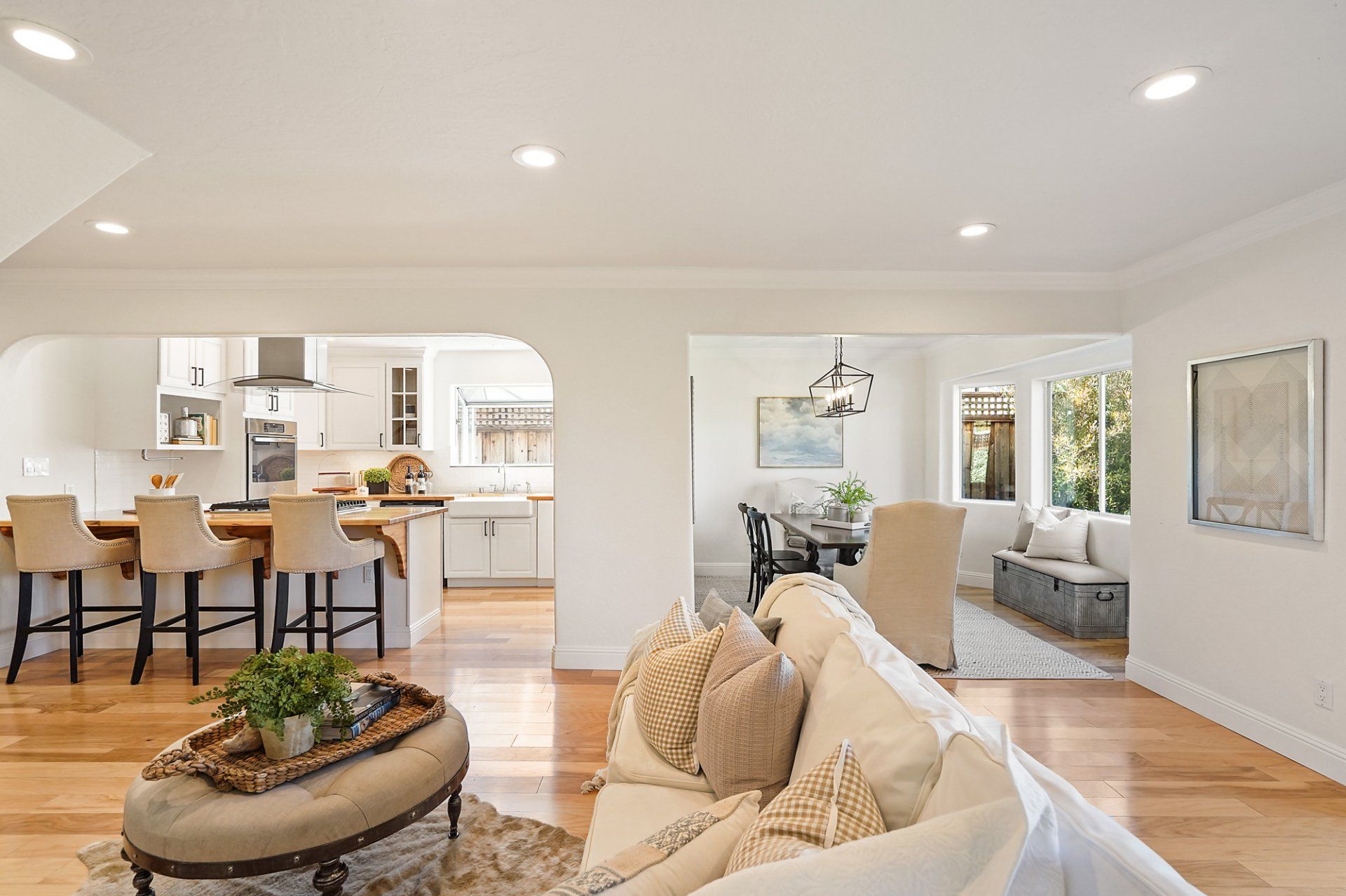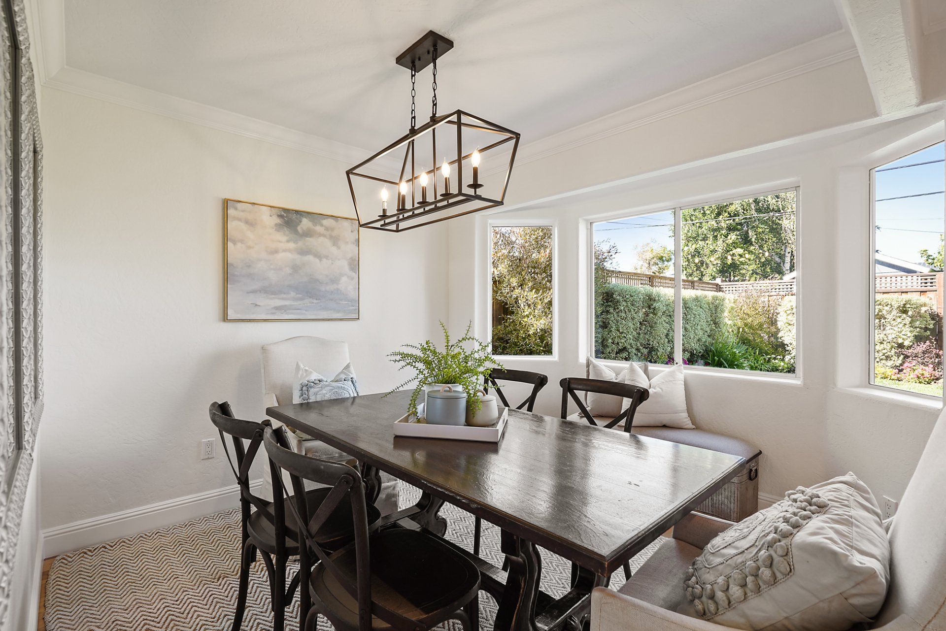 Across from the kitchen is an informal living area. This central open space is a perfect place to entertain or relax, with plenty of room for comfy furniture. Glass sliders provide access to the rear yard and lots of natural light. Adjacent is a spacious formal dining room with space to entertain and host large meals. A triple bay window floods this room with natural light and showcases a serene view of the verdant rear yard.