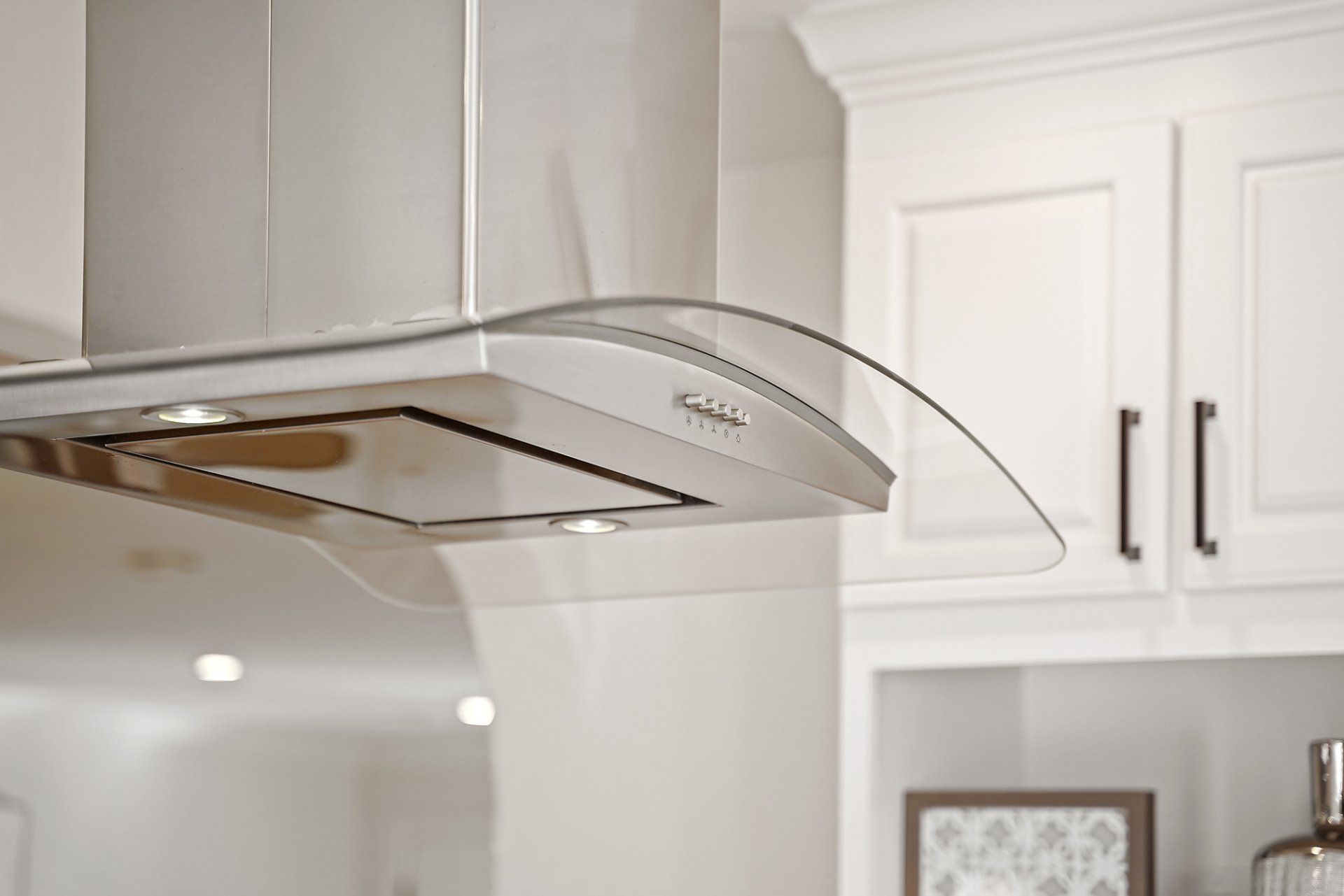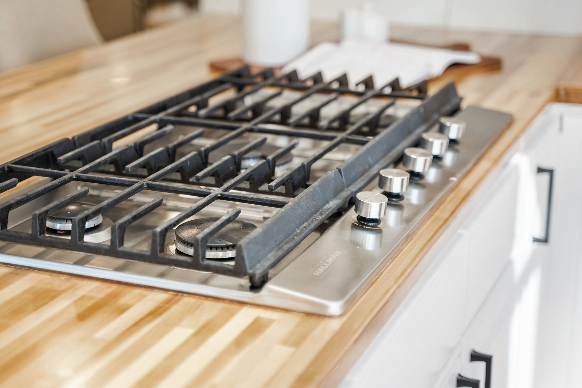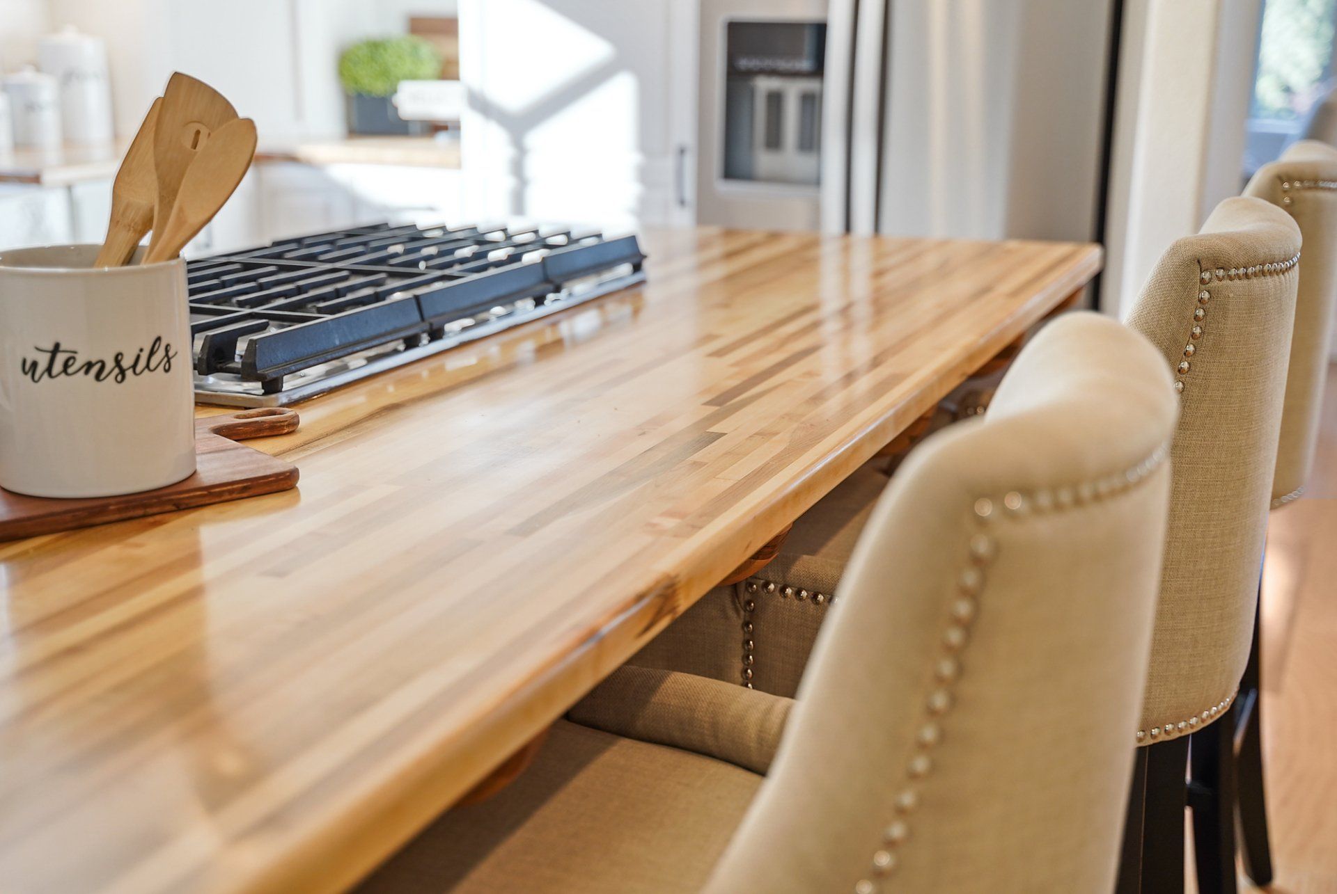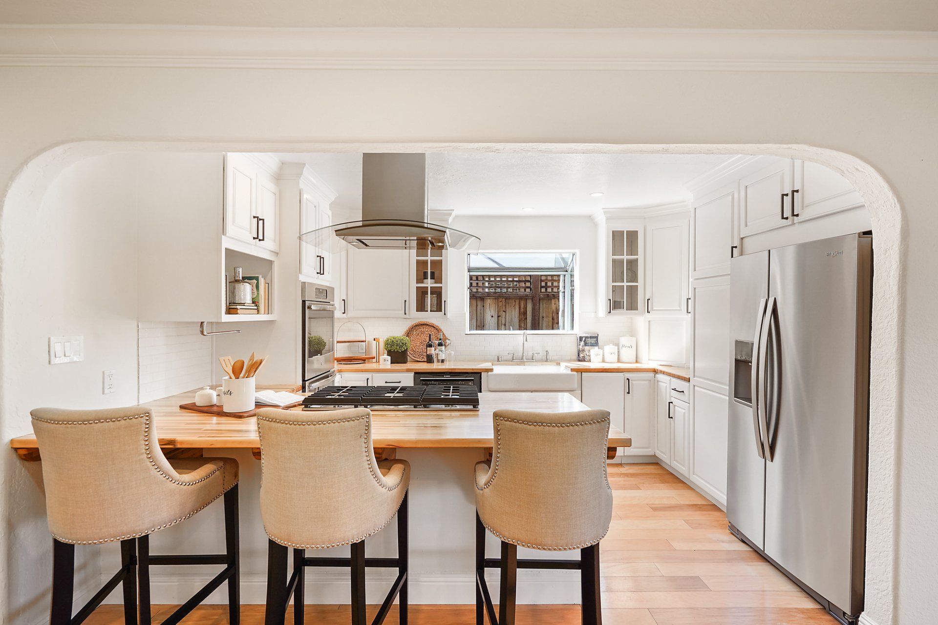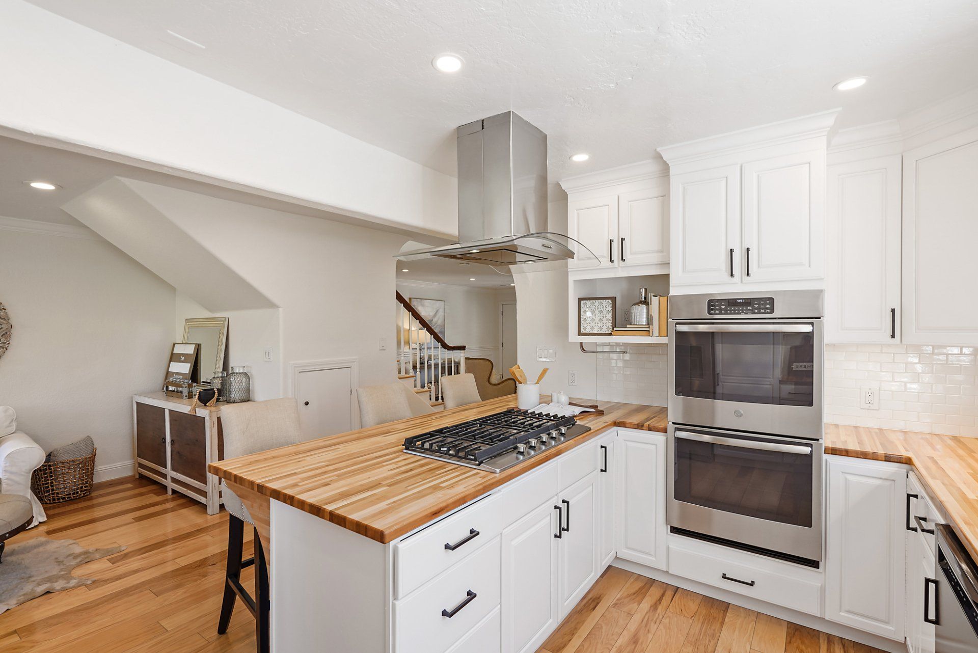 - Open gourmet kitchen with butcher block counters, breakfast bar, white cabinetry, and white brick tile backsplash, white apron front sink, stainless steel double ovens, a brand new stainless steel side-by-side refrigerator, a five-burner gas cooktop, and ceiling-mounted glass range hood.