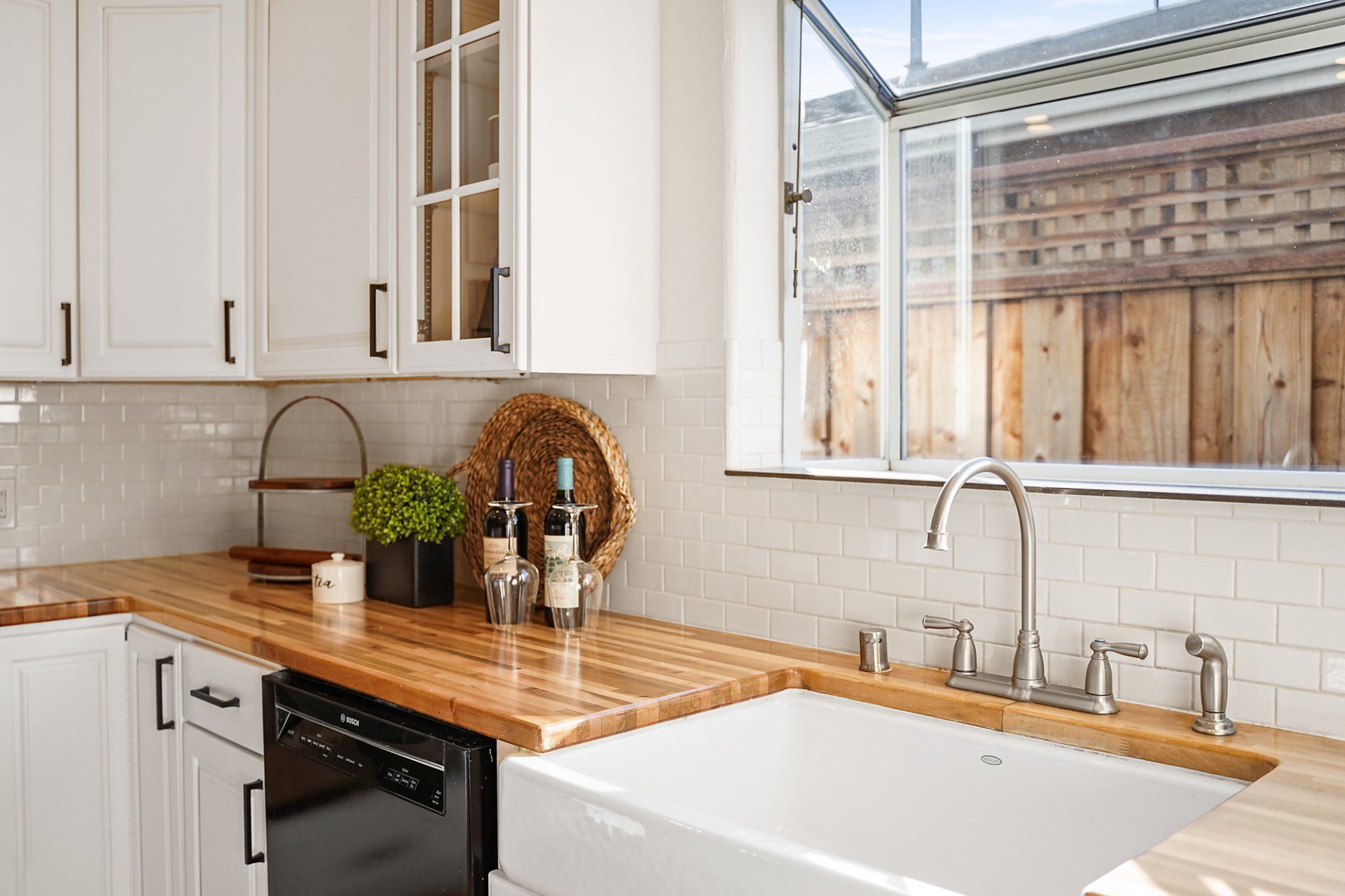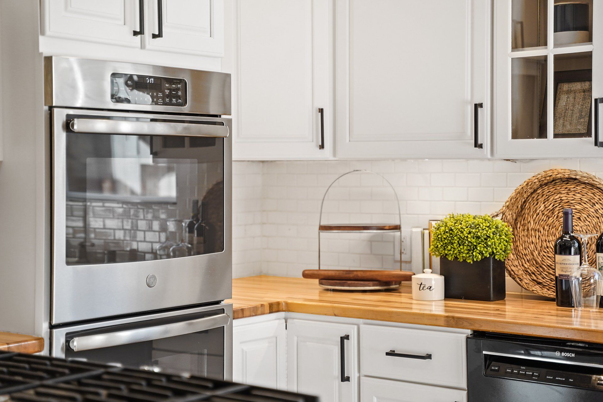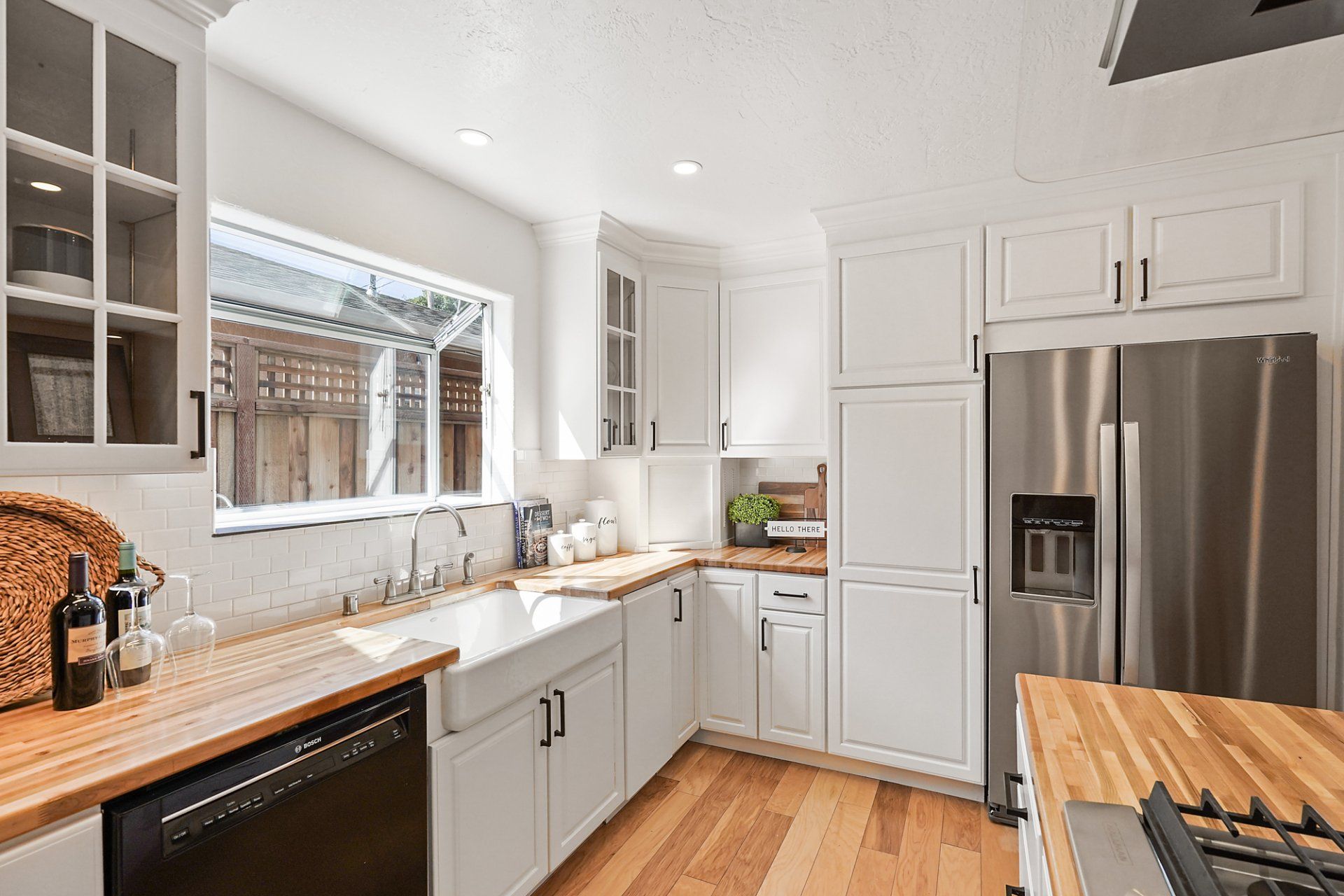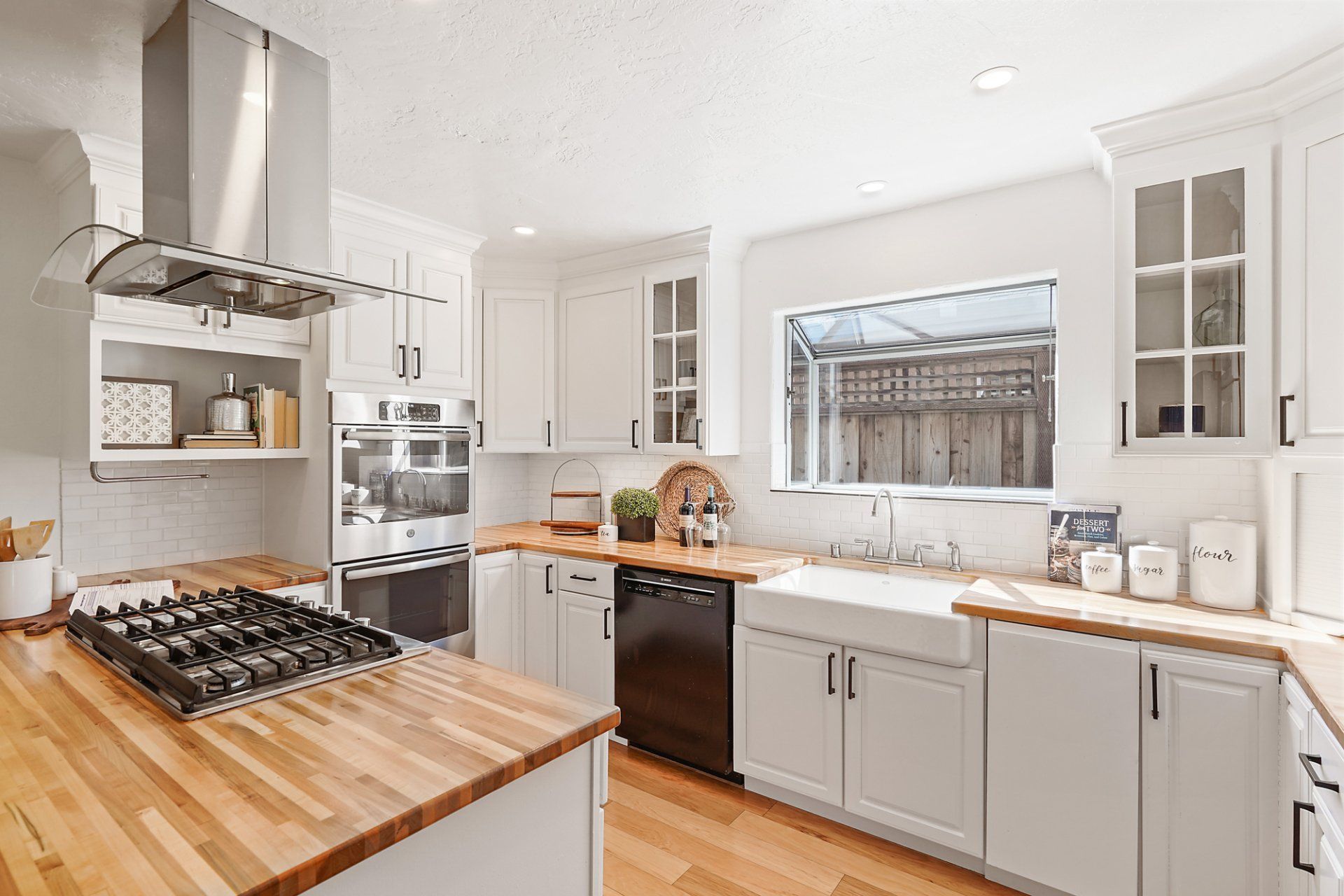 An open gourmet kitchen has beautiful, warm butcher block counters with a breakfast bar, white cabinetry with thoughtful and ample storage, and a white tile backsplash. The appliance suite includes stainless steel double ovens, a brand new stainless steel side-by-side refrigerator, and a five-burner gas cooktop with a ceiling-mounted glass range hood overhead. A box window over the white apron front sink invites natural light inside and provides a sunny spot for herbs and indoor plants.