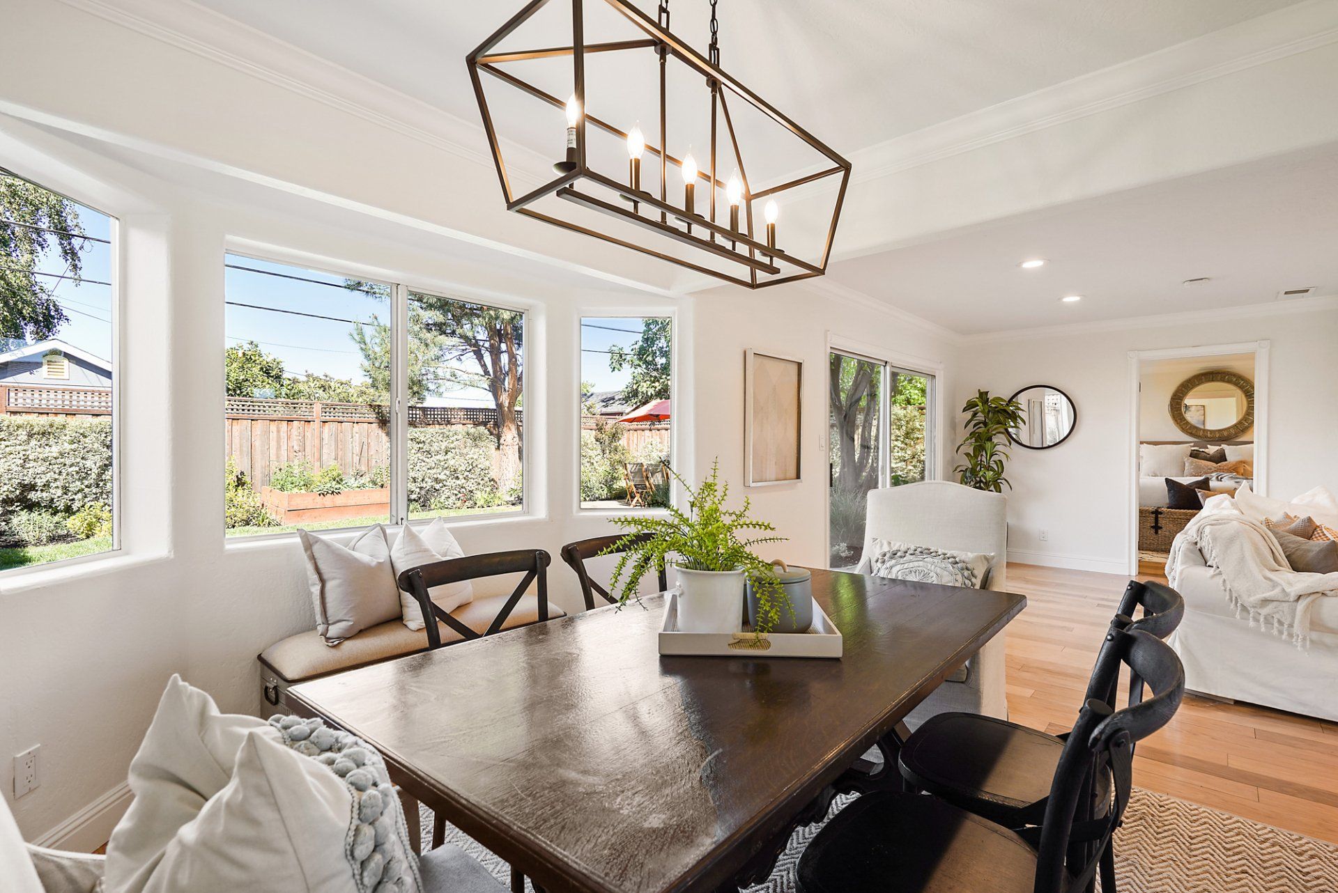 - Dining room with triple window bay, and adjacent open family room with sliders out to the back yard.