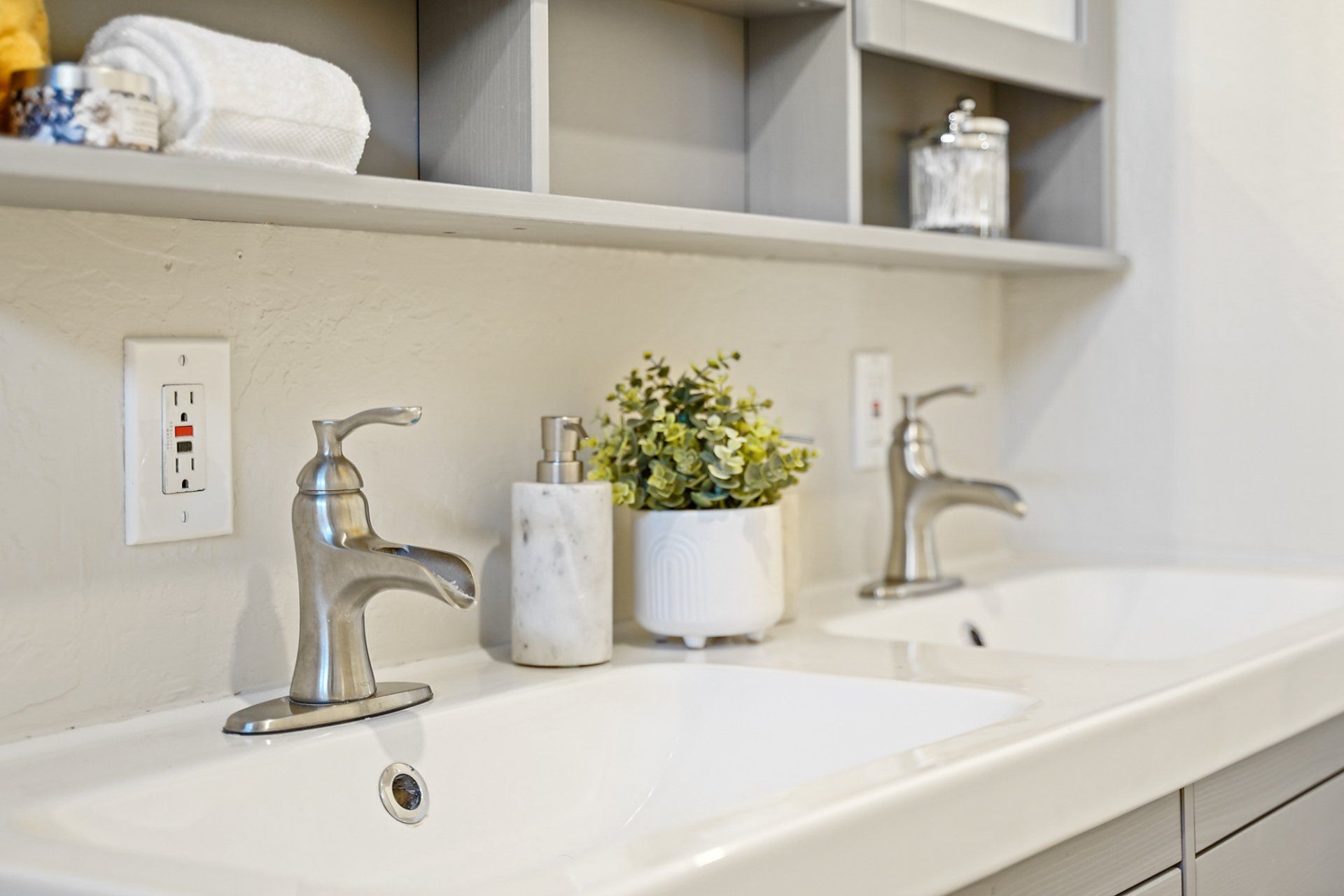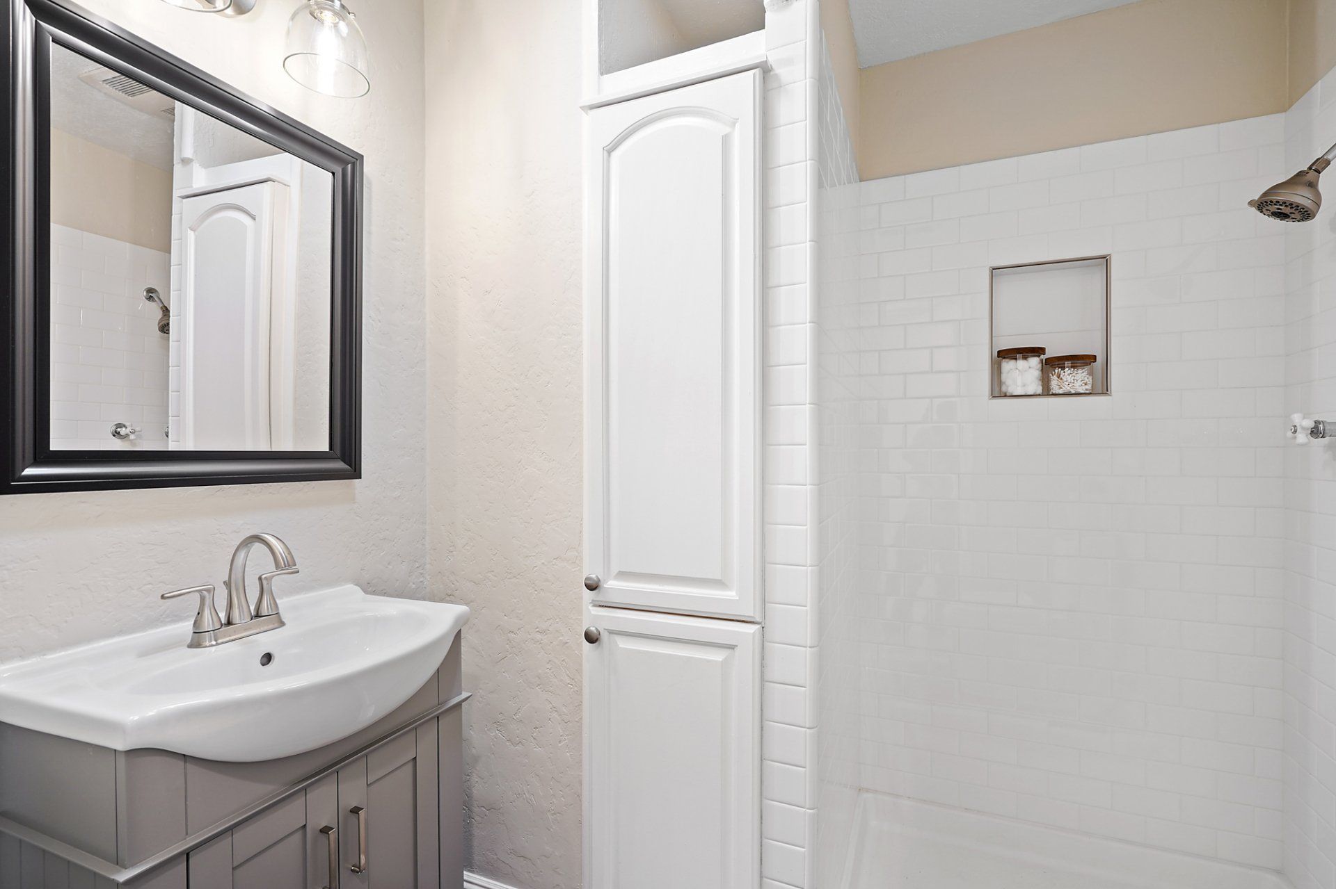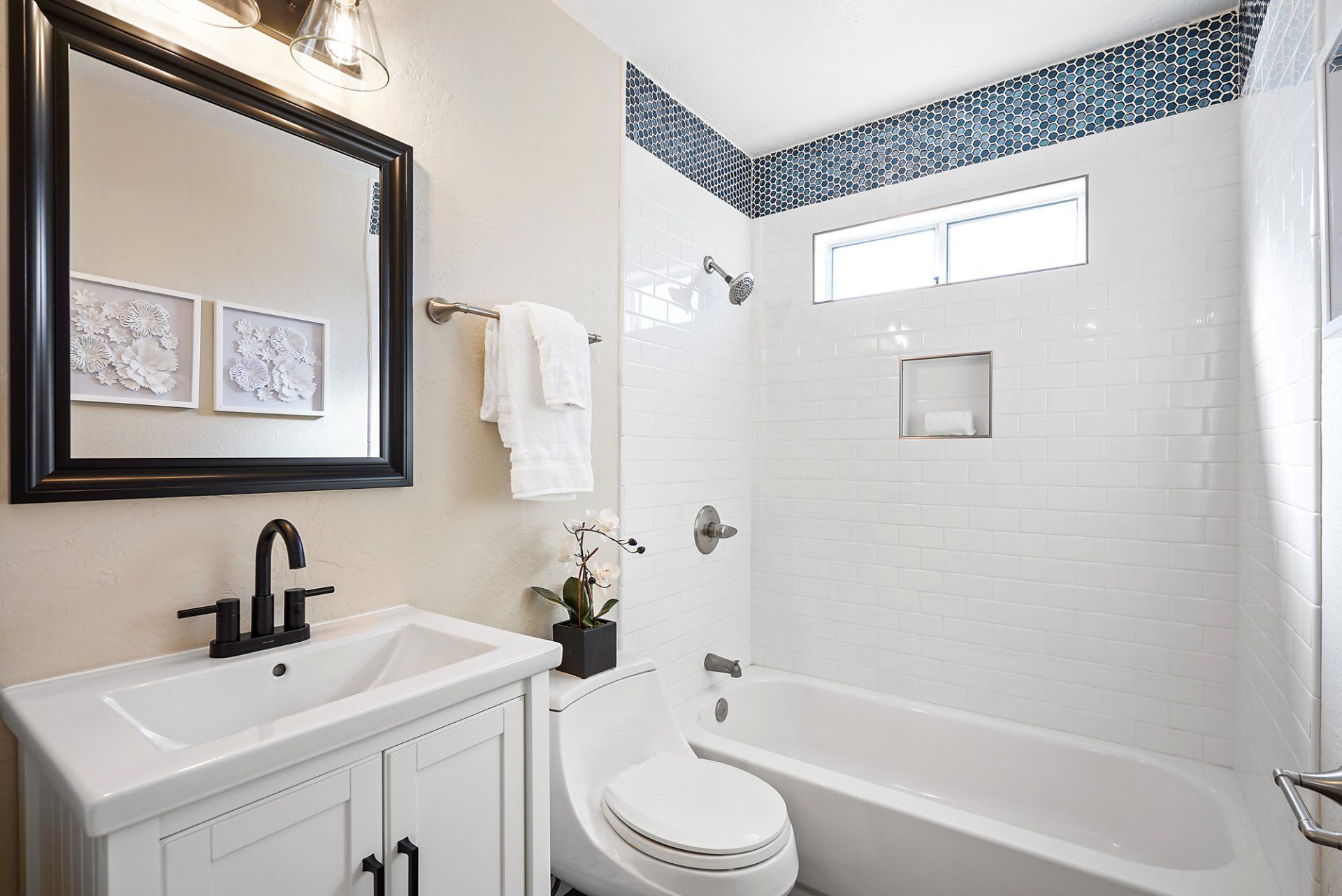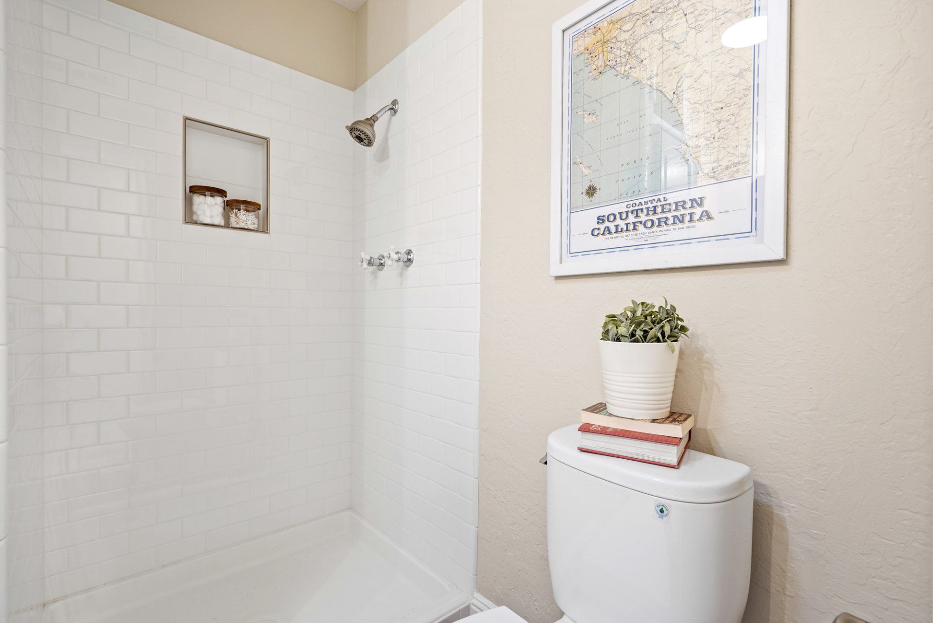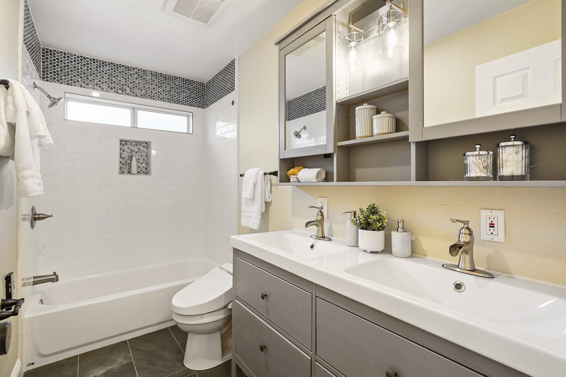 On the main level a spacious primary suite has a large sliding window to let in natural light and provide a serene view overlooking the backyard. A renovated ensuite bathroom features gray tile flooring, a twin-sink vanity with built-in cabinetry above, white subway and mosaic tile surround tub/shower, and Toto washlet. A large sliding door closet with built-in organization completes this space. Two additional bedrooms on the main level receive ample natural light and share a renovated hallway bath that has a large stall shower, single vanity, and skylight for natural light.