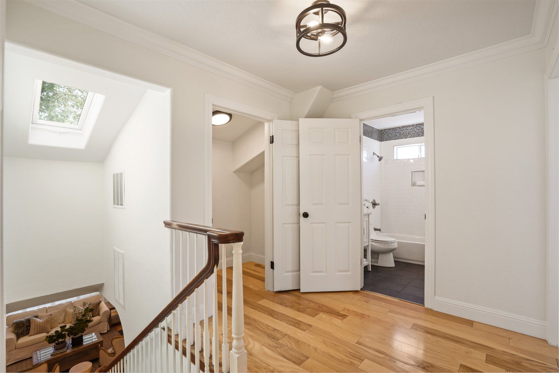 Heading upstairs, light enters from a large skylight above warming the natural hickory flooring. Two bedrooms receive ample natural light, and have glass sliding doors leading to a shared balcony running the width of the home with a lovely view overlooking the backyard. A renovated full bath and additional closet space complete the upstairs.