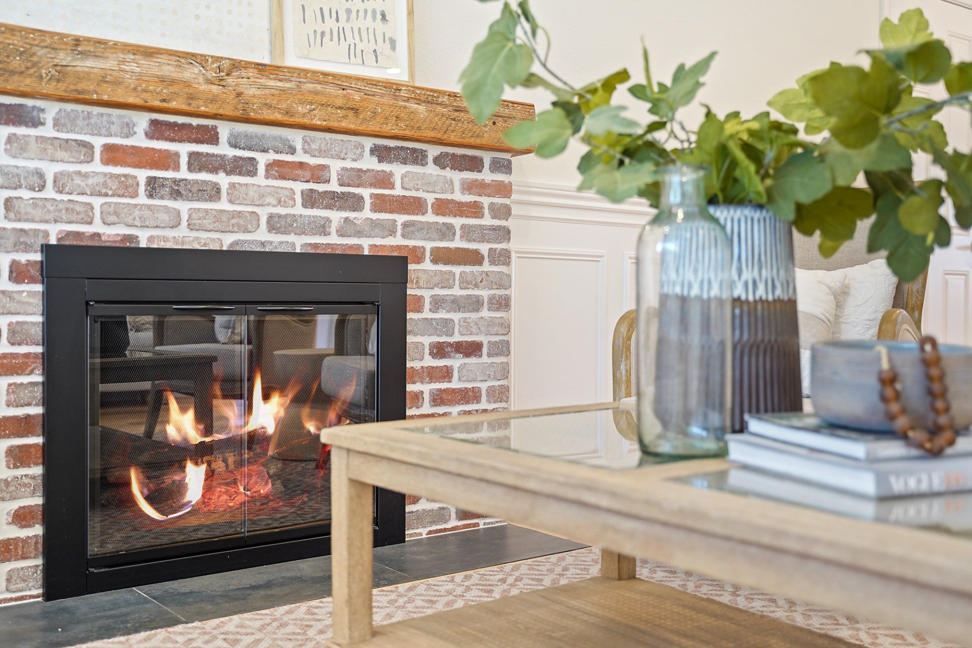 - Sunny living room with wainscoting, gas fireplace, and plantation shutters.