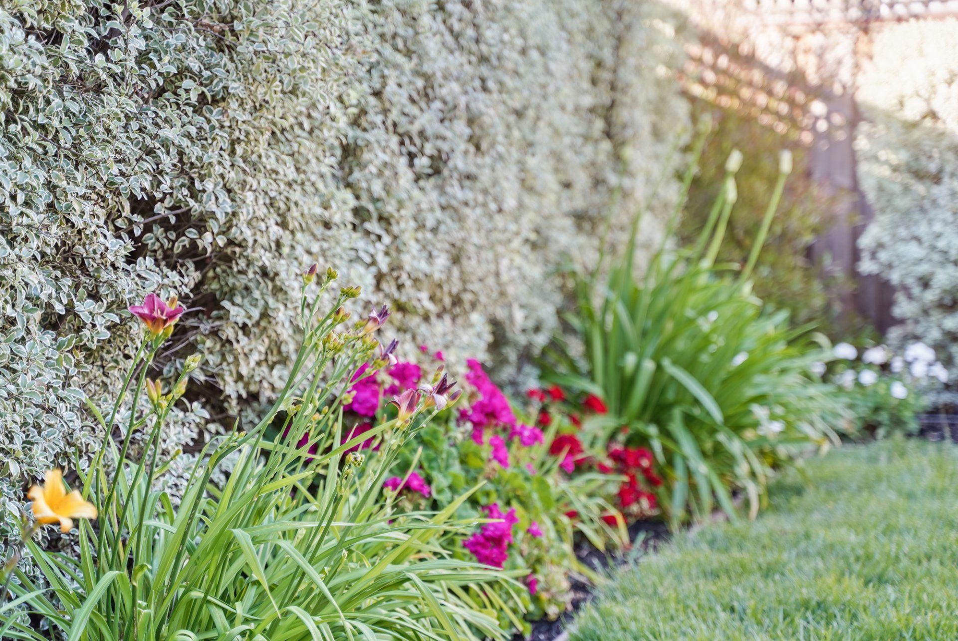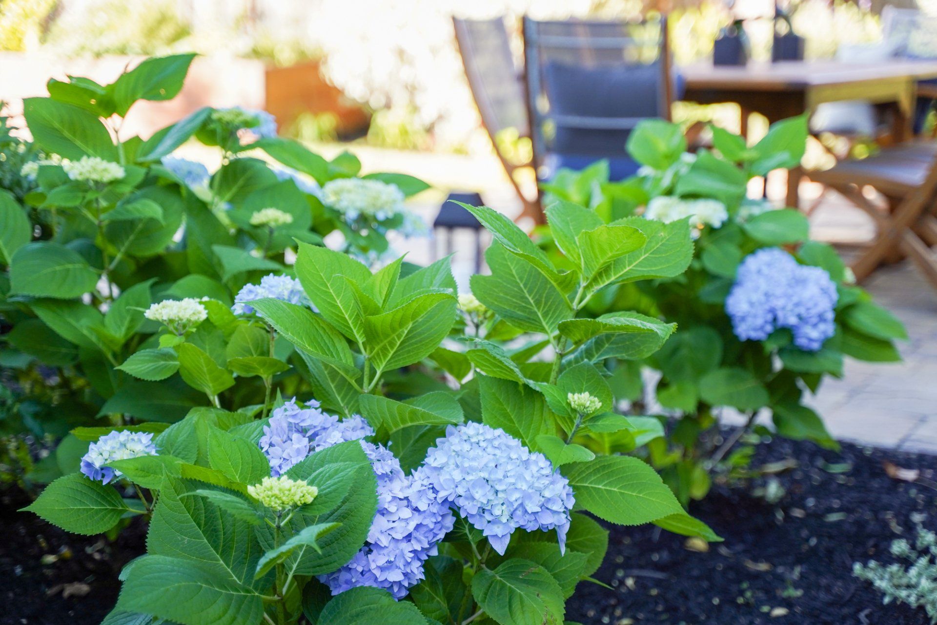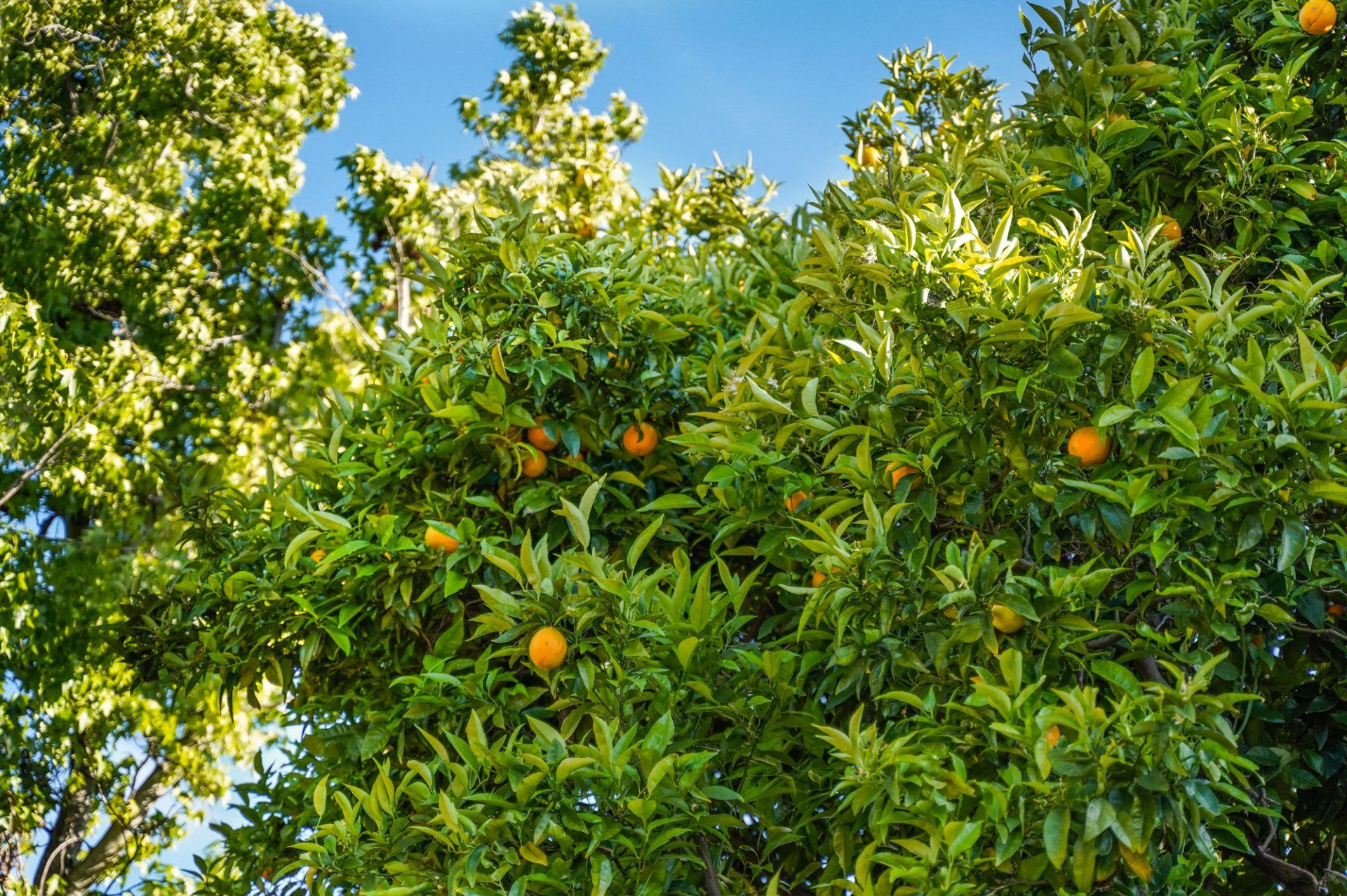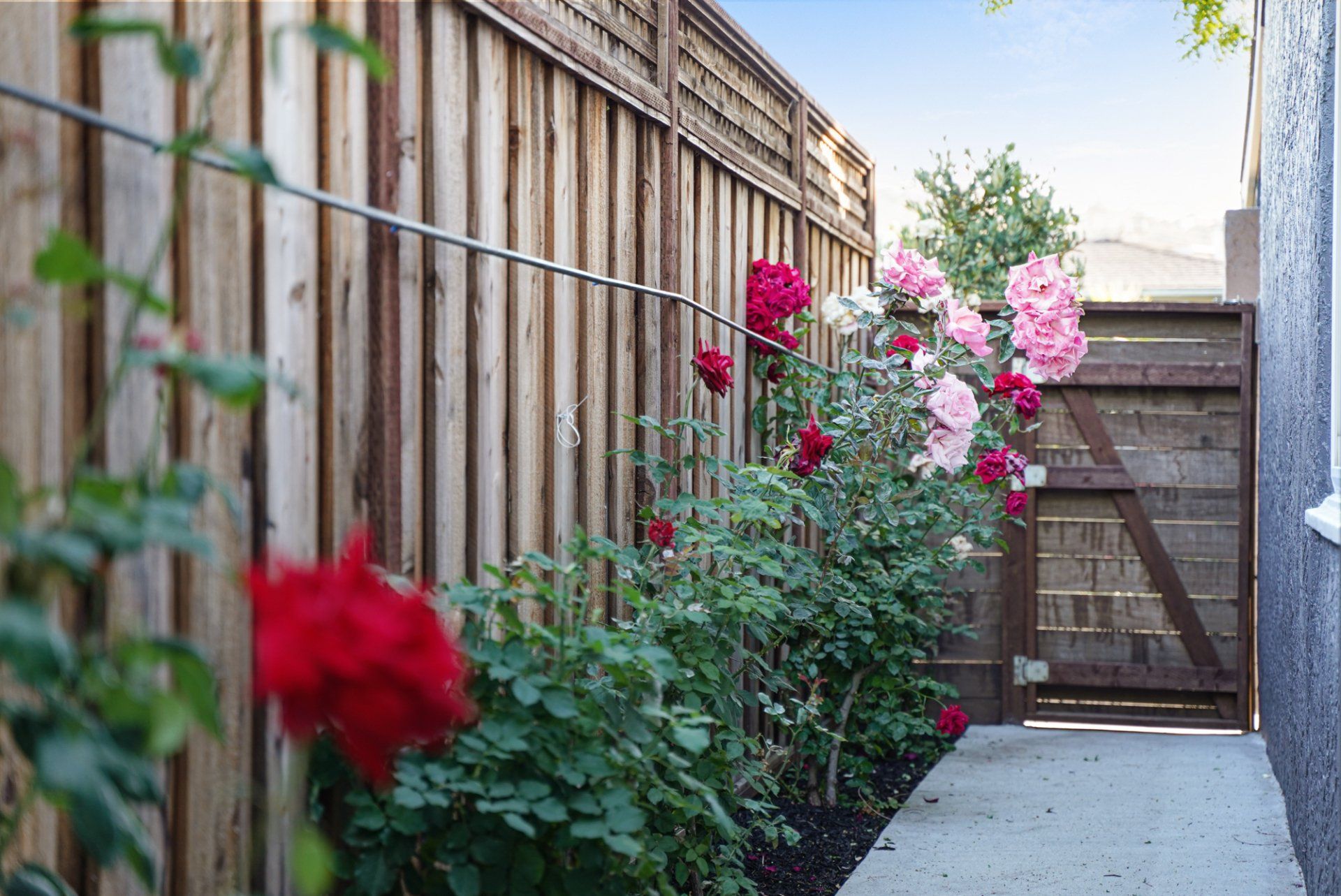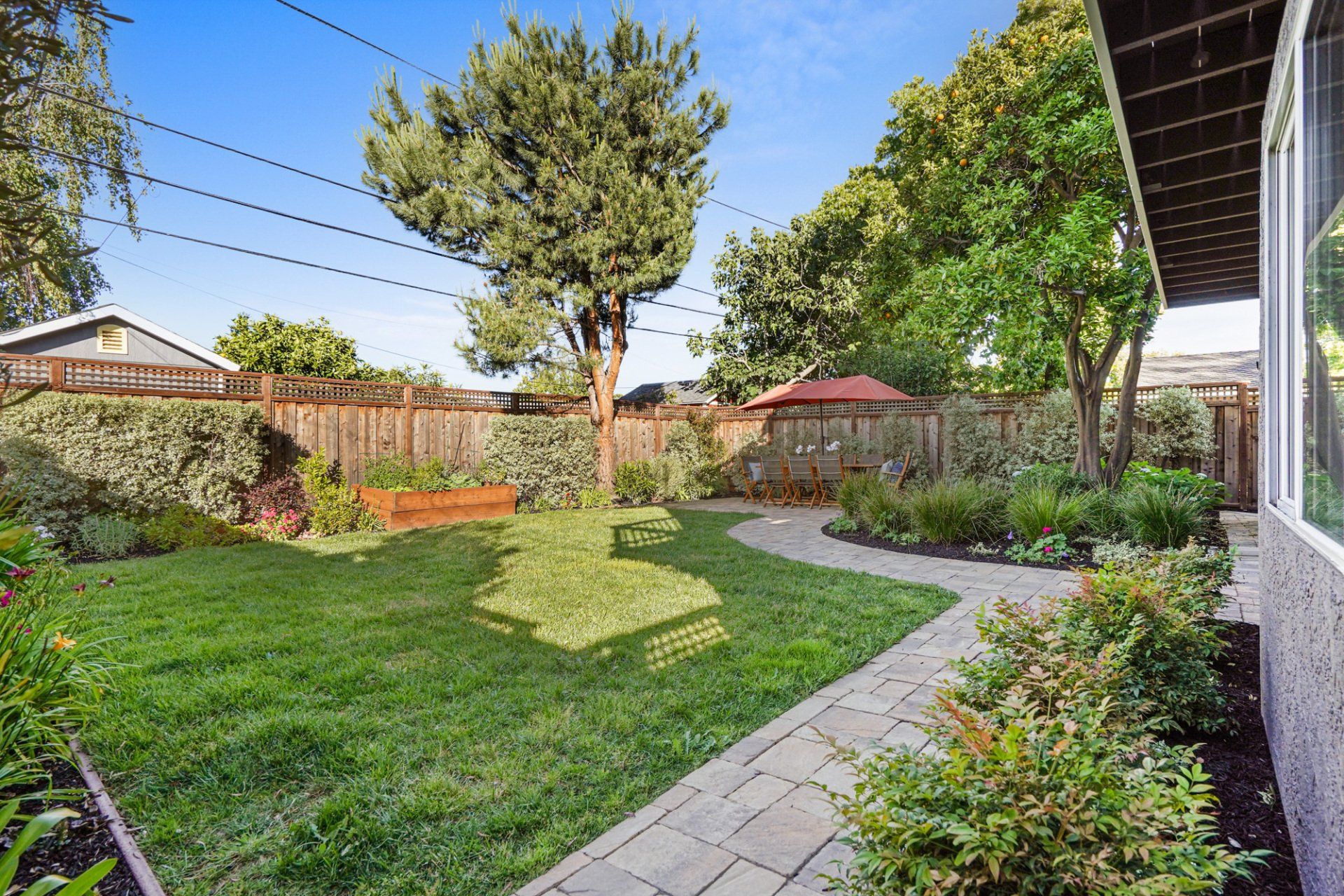 The backyard is a flourishing space for adventure and entertainment. Wooden fencing surrounds a yard filled with fruit trees, topiary, shrubs, and flowers to create the feeling of a garden escape. A lush, grassy lawn offers a space for lawn games, and a charming paver stone patio area is shaded by a tall, producing orange tree. Along the back fence, a raised garden presents the opportunity to grow herbs and vegetables, while the side of the house is lined with long stem rose bushes that produce beautiful, fragrant flowers.