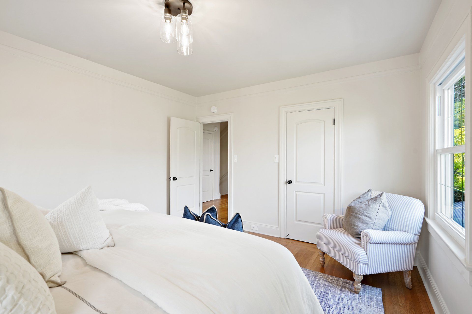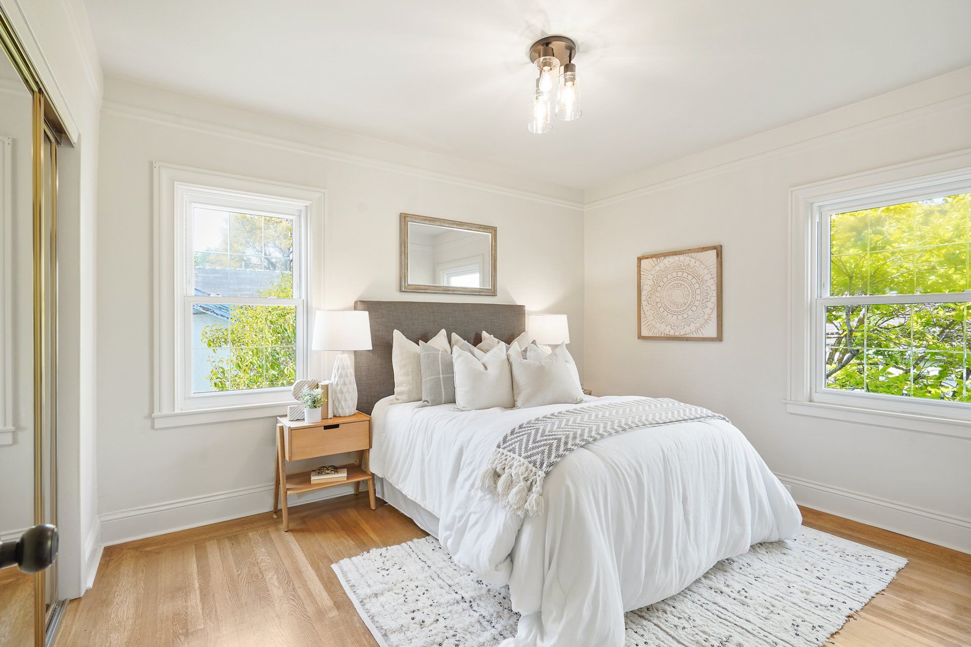 There's a natural flow from the entry into the living room with its bay windows and abundant natural light. A cozy fireplace adds to the charm. An adjacent dining room has large windows and can function not only for meals but as another active living space for arts and crafts projects or even a work-from-home space. Three steps lead up to the private quarters, with three lovely, sunny bedrooms and one-and-a-half newly updated bathrooms.