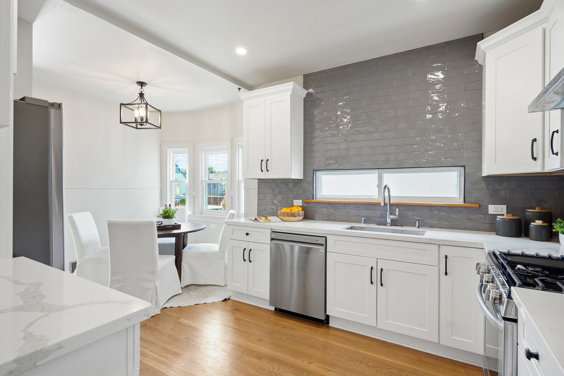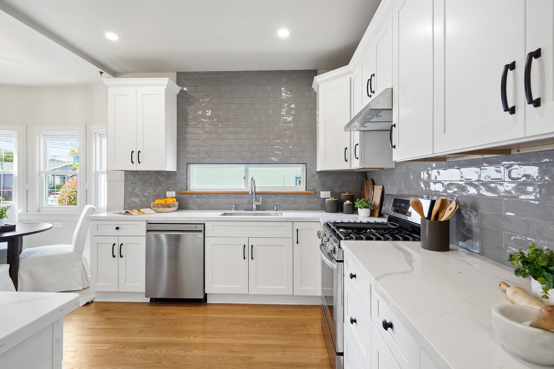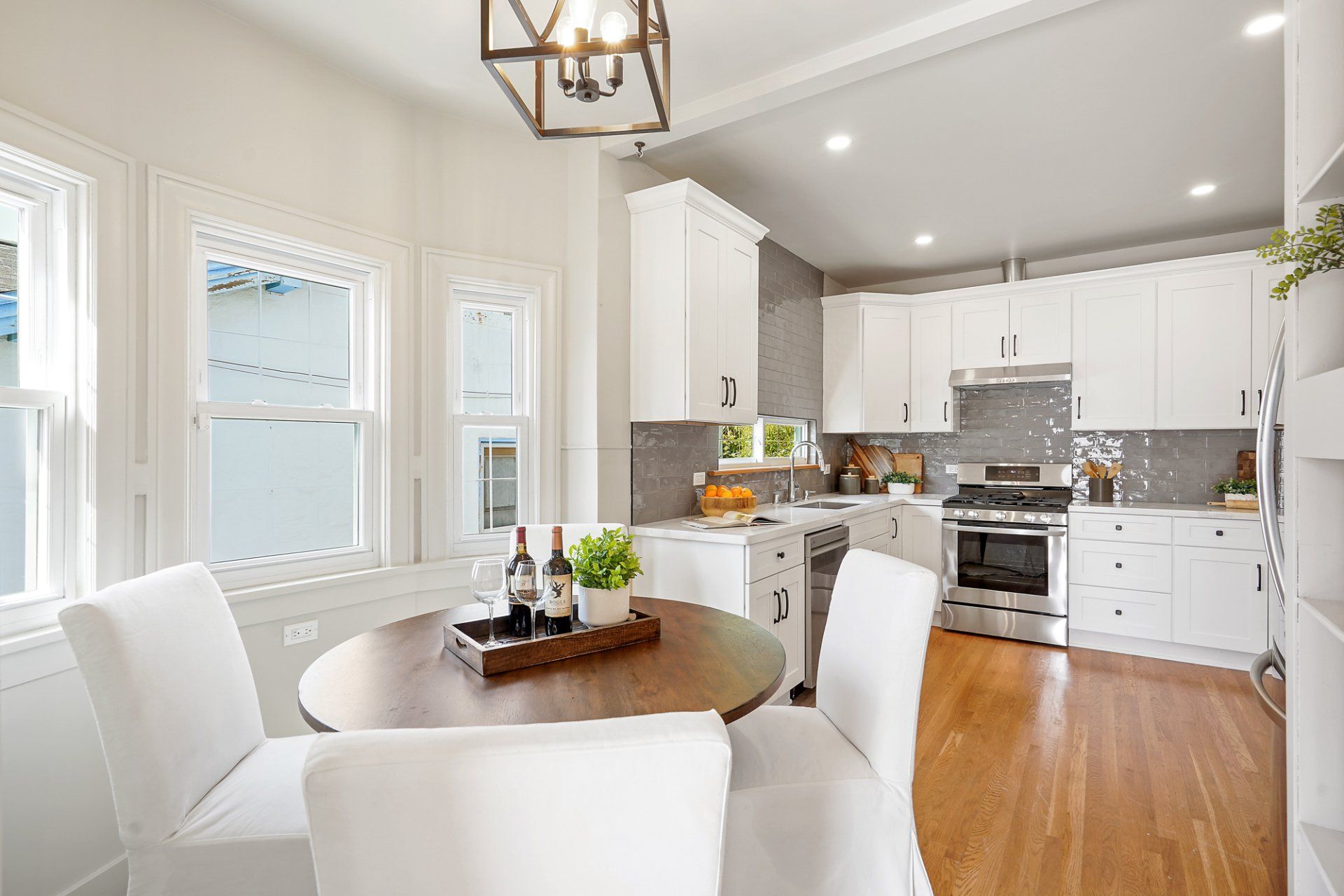 - The newly updated kitchen is the heart of the home, with quartz counters, stainless steel appliances, and a delightful breakfast nook with a bay window.