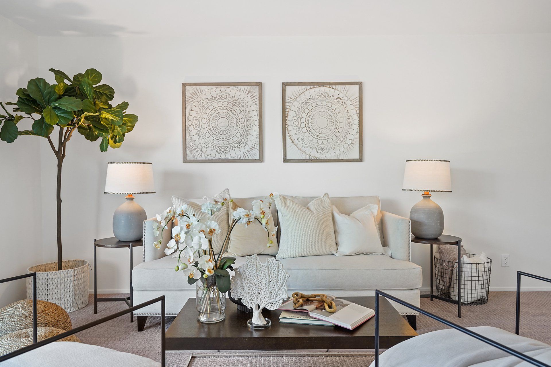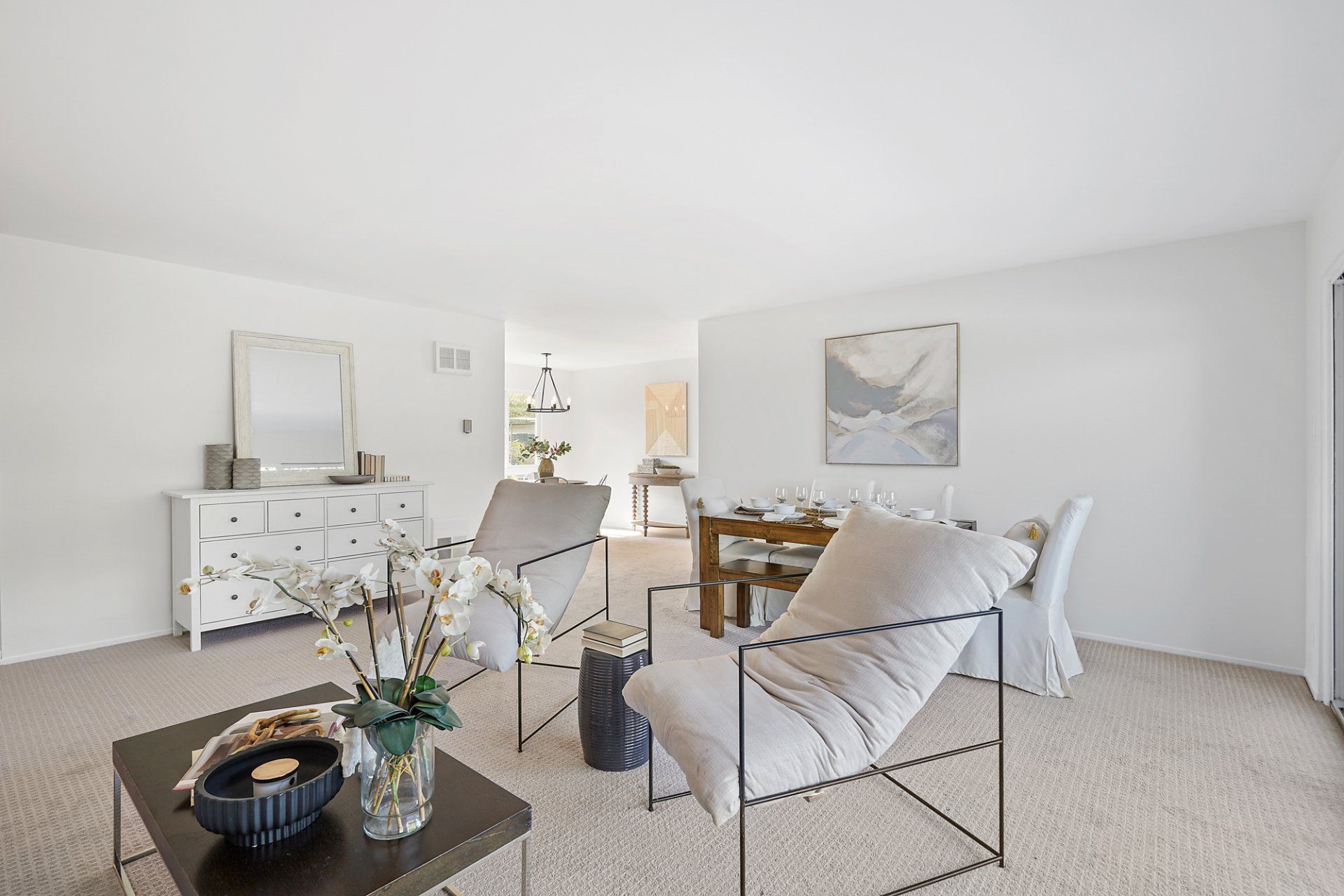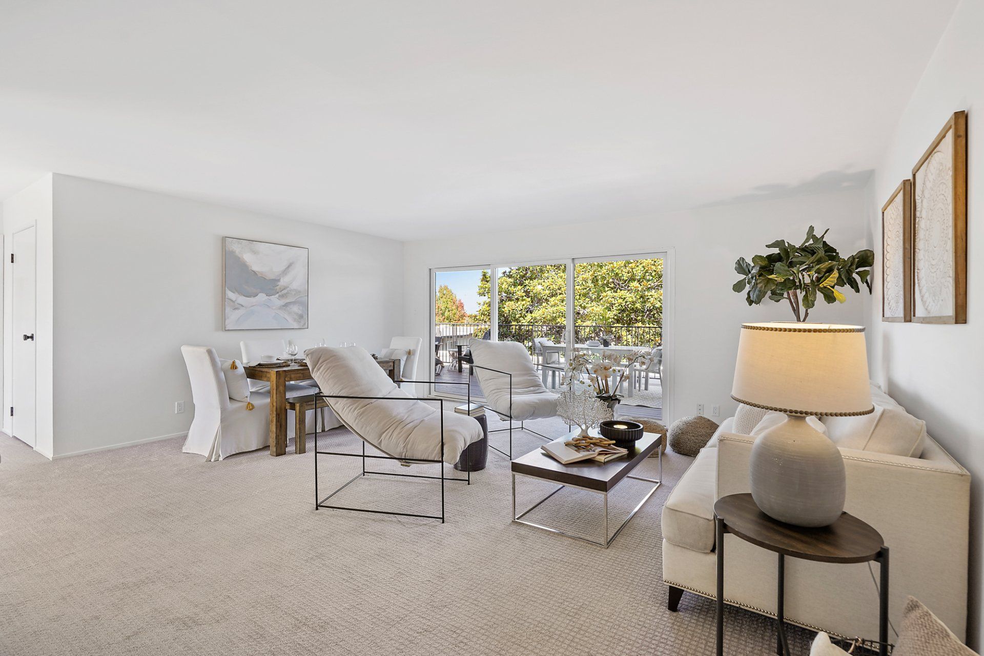 - Sunny, spacious living room with glass sliders leading to a large private balcony.
