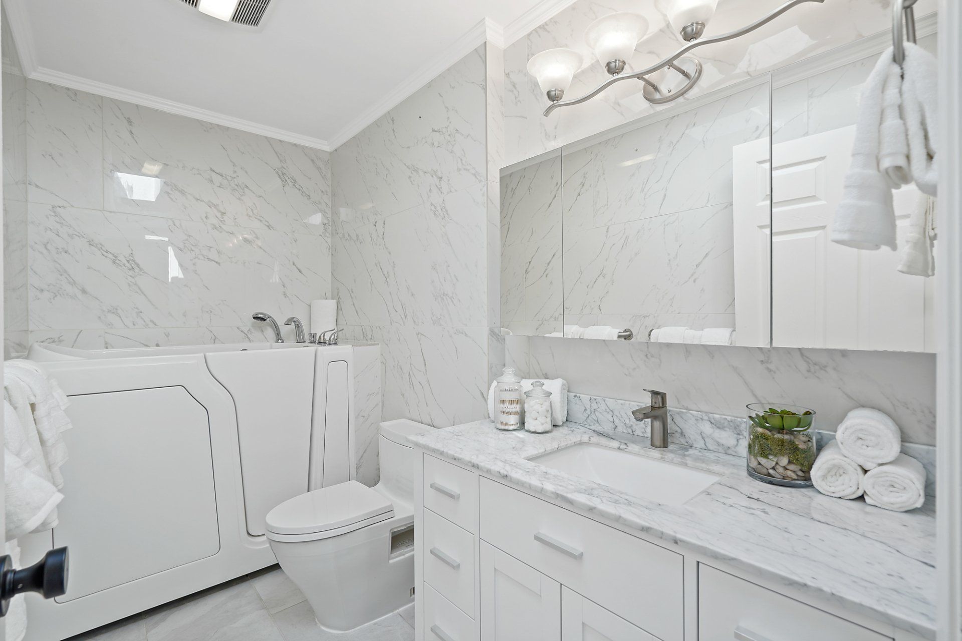 Top-floor Penthouse | Amenity-filled community | Multiple community pools and spas | Community sauna | Community tennis courts | Community walking paths | Community lake | Beautifully landscaped grounds | Professionally managed community | Expansive balcony | Two sunny exposures | Renovated galley kitchen | Stainless Steel Appliances | Quartz countertops | Stainless steel sink | Multiple storage closets | New carpeting | Glass sliding doors | Walk-in Spa Tub | Glass-enclosed shower | Cedar-lined ensuite closet