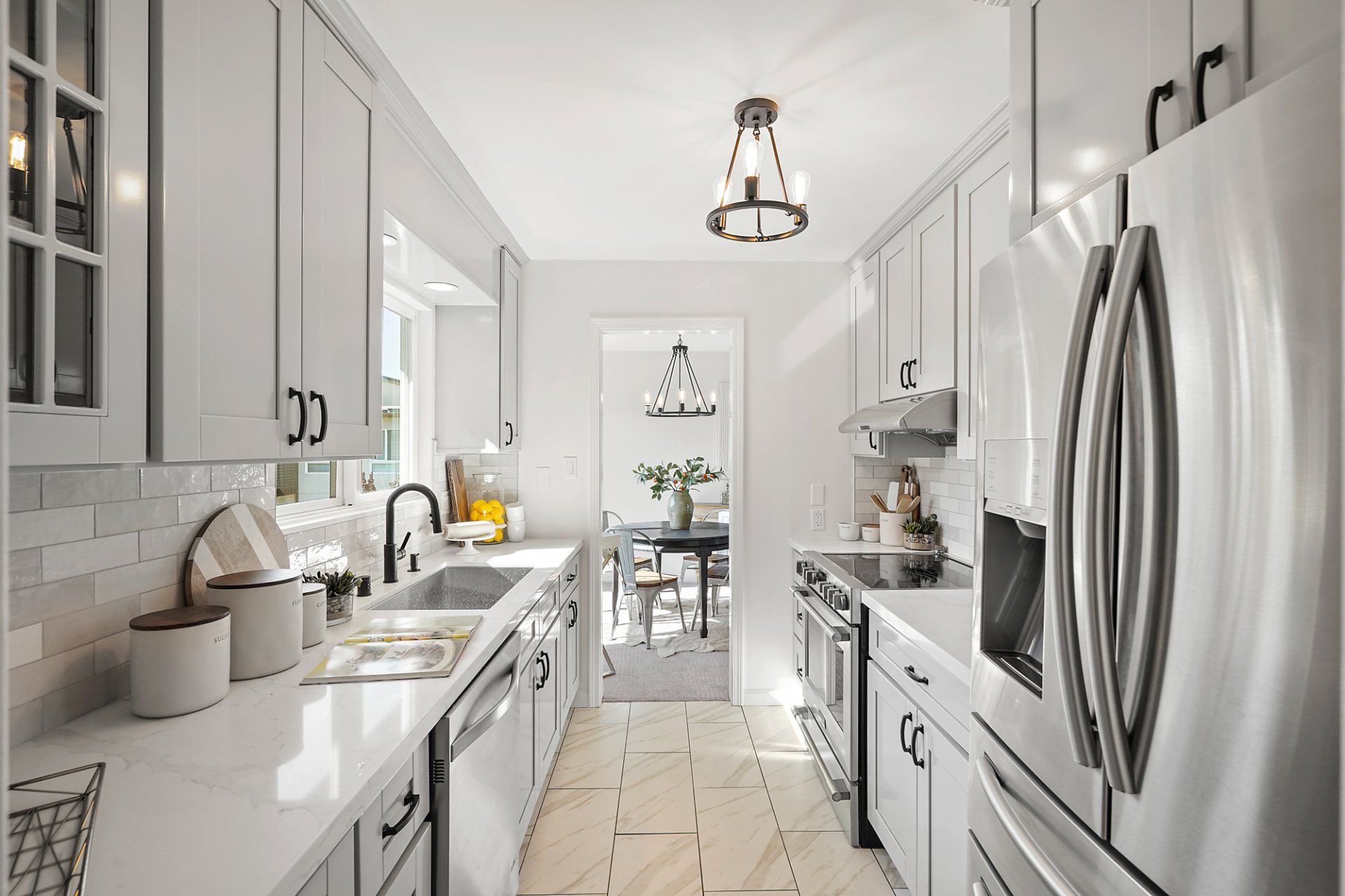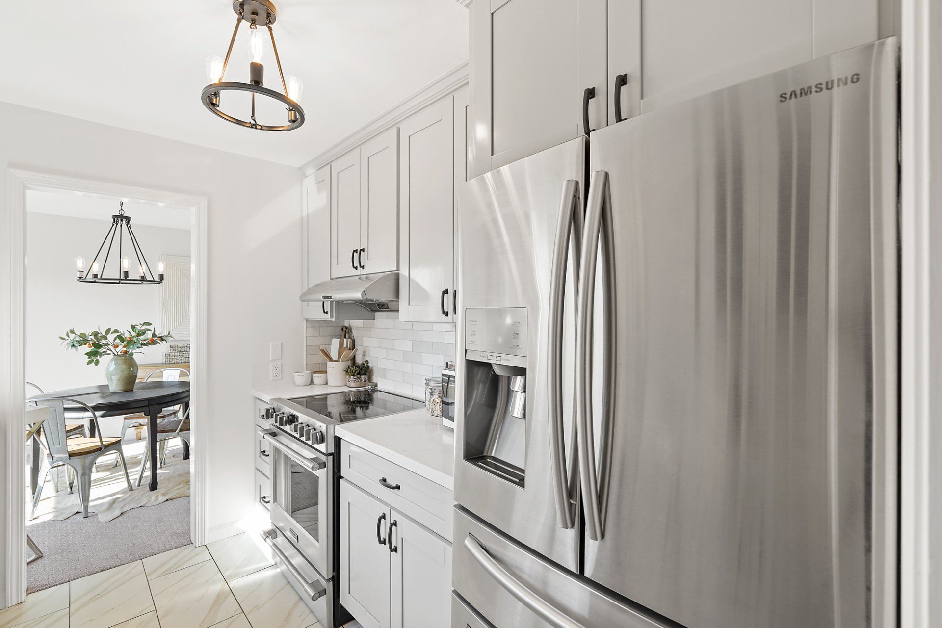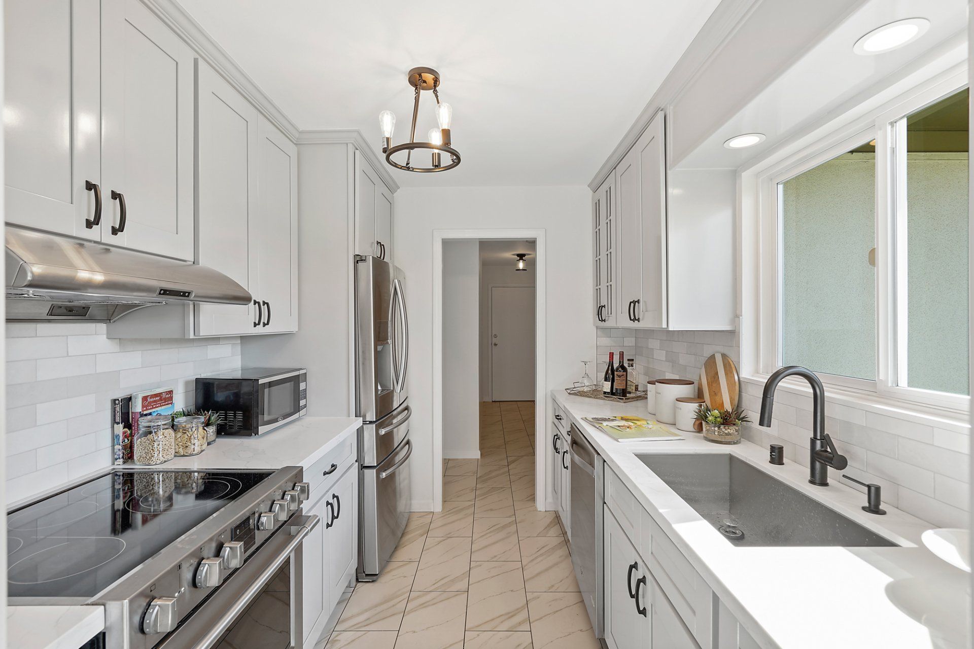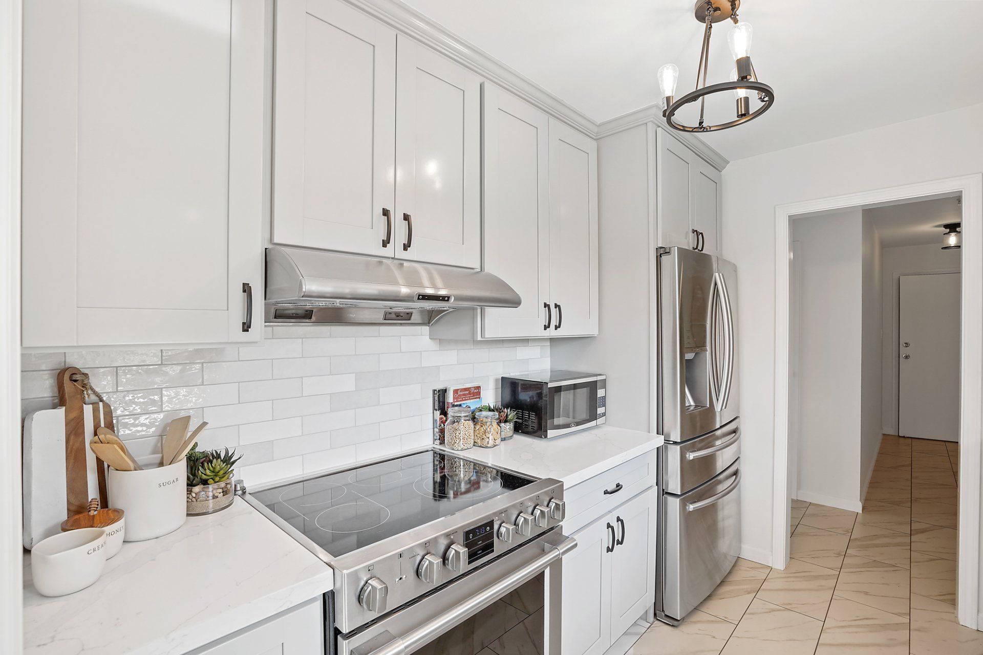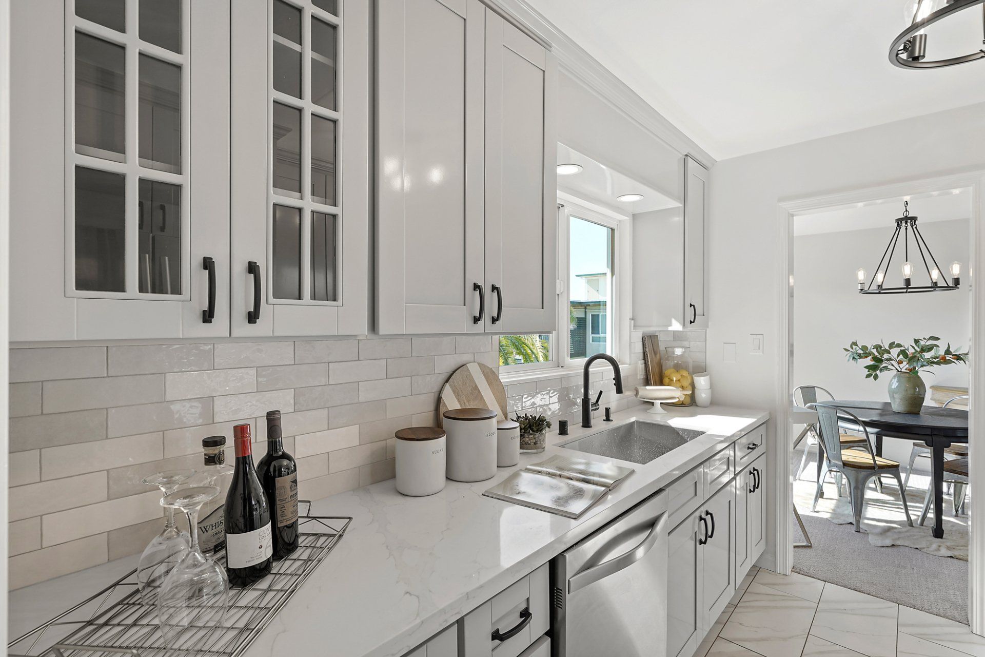 - Updated kitchen with quartz counters, stainless steel appliances, and a delightful adjacent breakfast room with a large window and courtyard view.