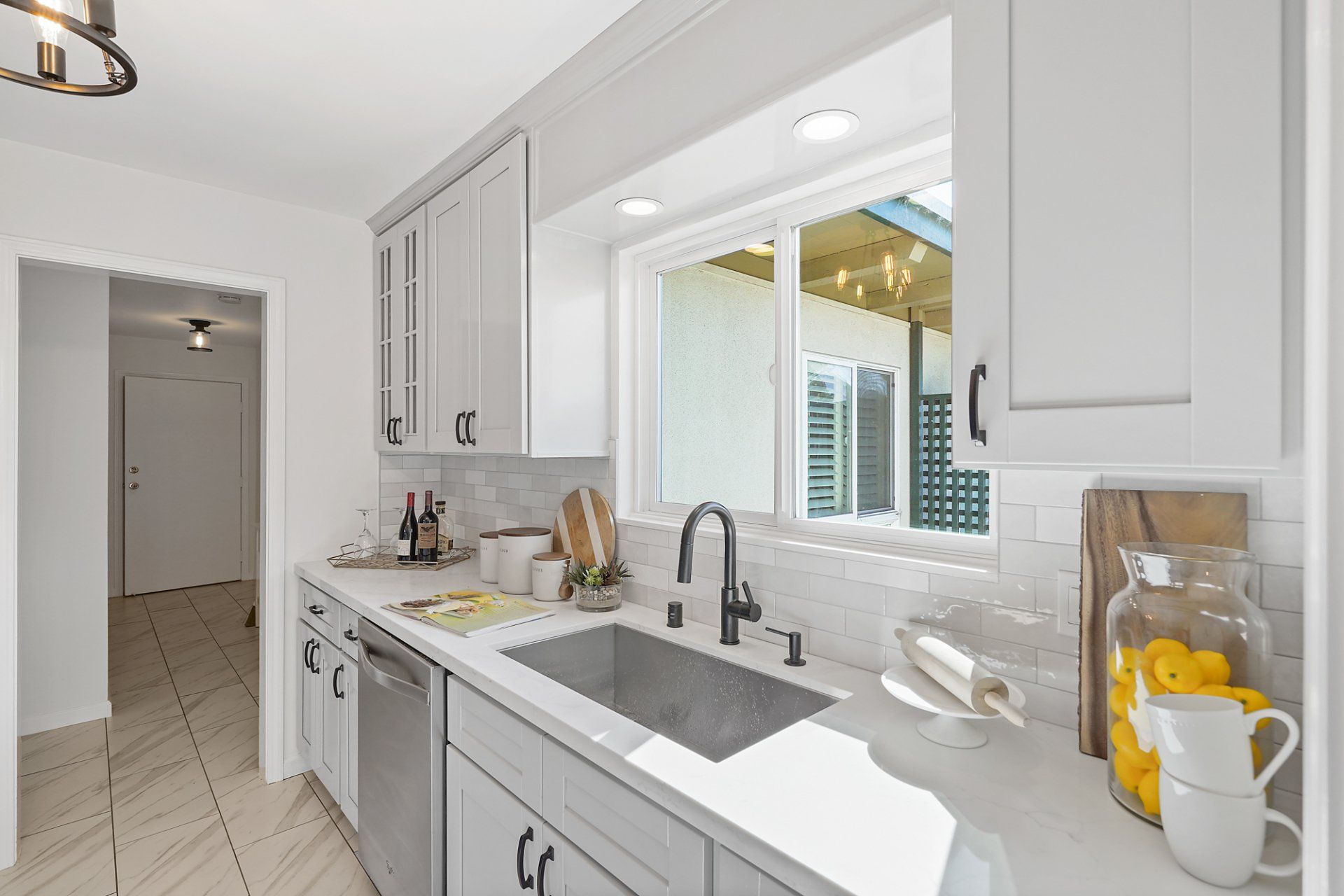 Wander past a serene lake and lush foliage in the community's beautifully landscaped grounds before entering. A welcoming foyer flows seamlessly into both the main living area and the galley-style kitchen, boasting newly painted cabinetry, stylish backsplash, new countertops, and stainless-steel appliances. Appreciate a bright and airy dining area off the kitchen, well-lit by the large windows overlooking the courtyard.