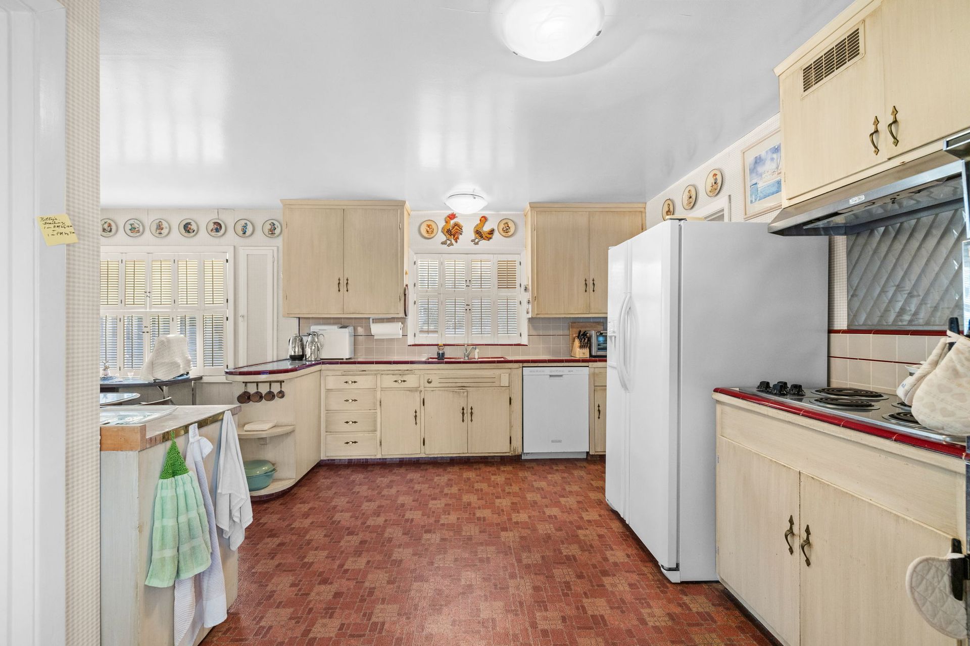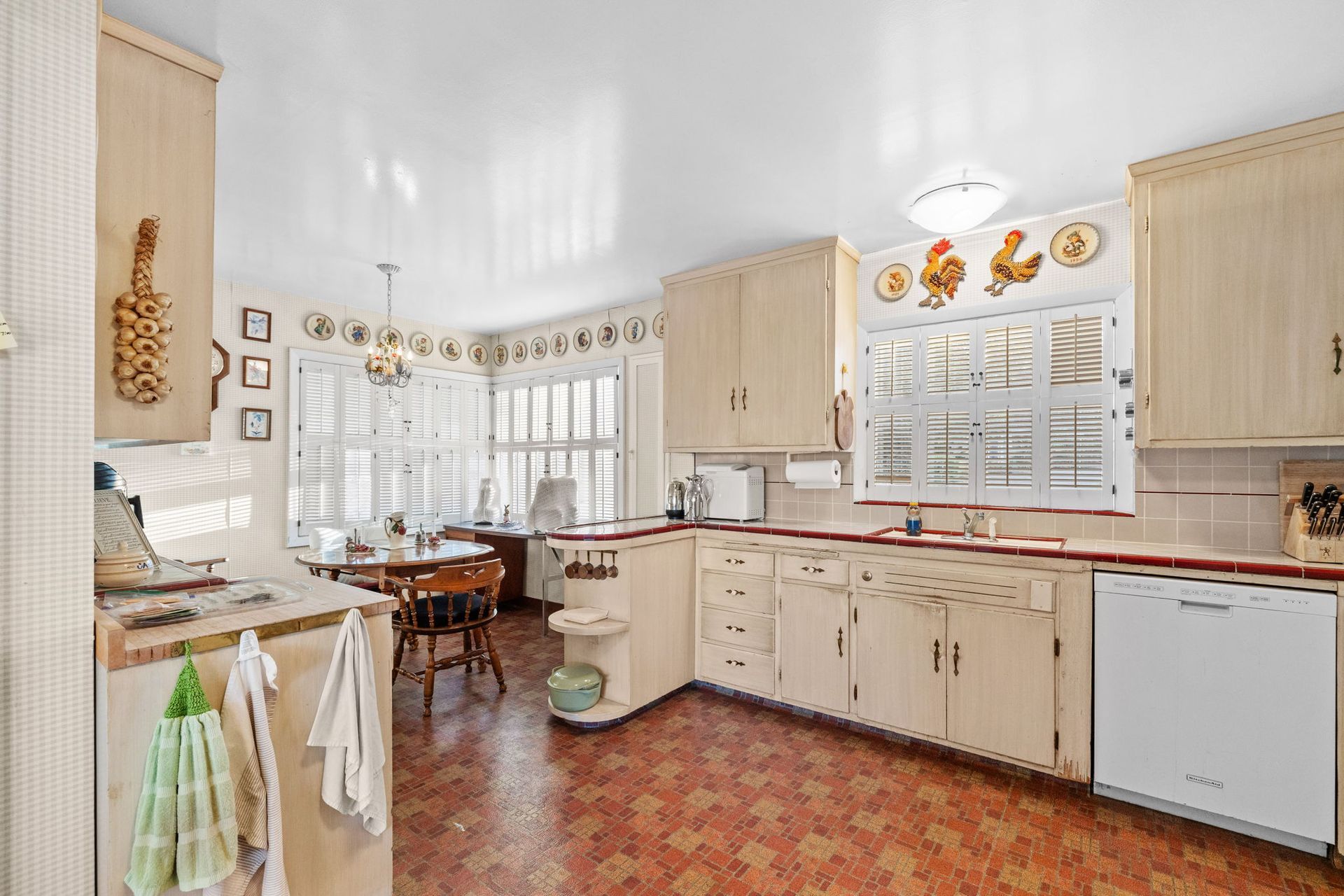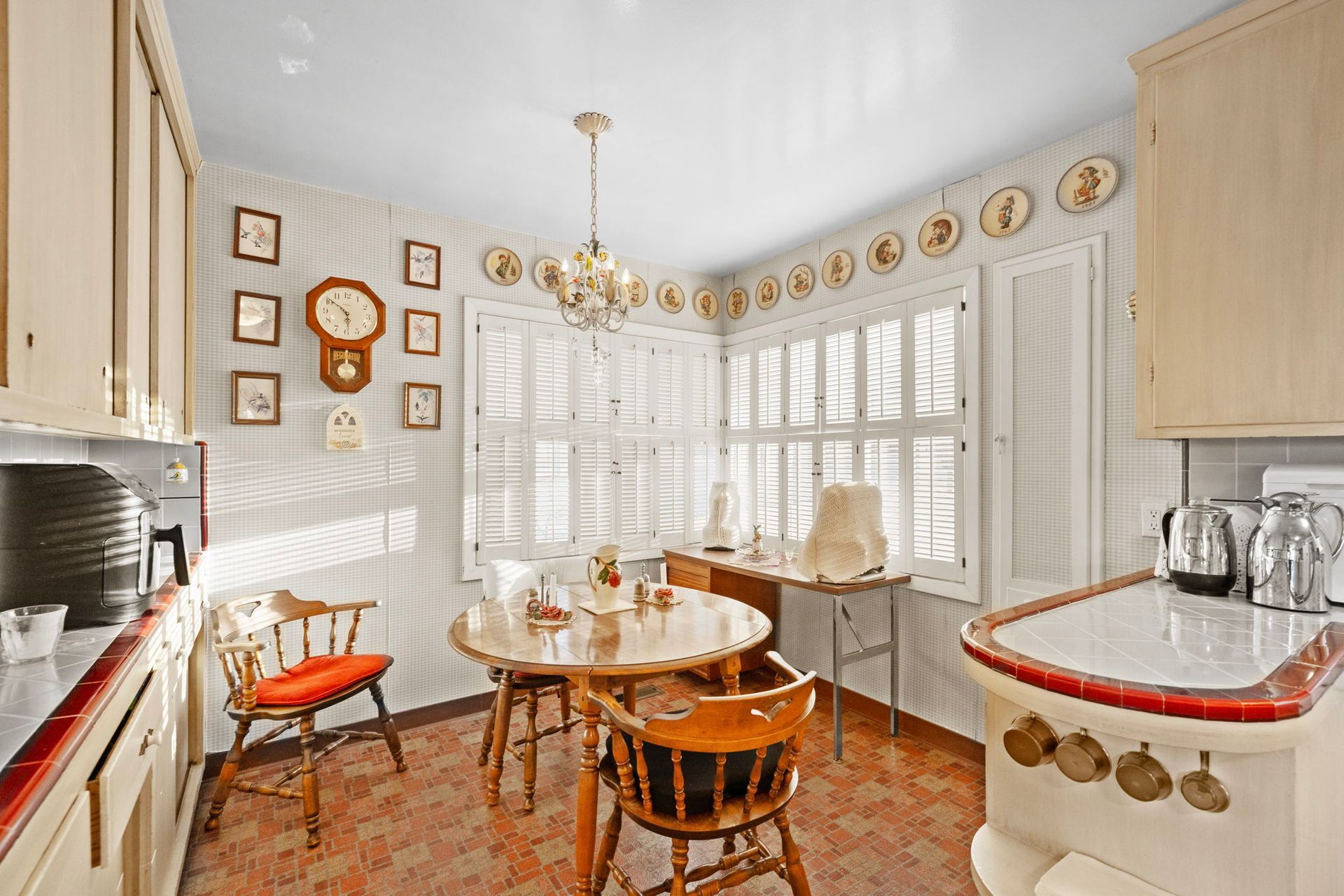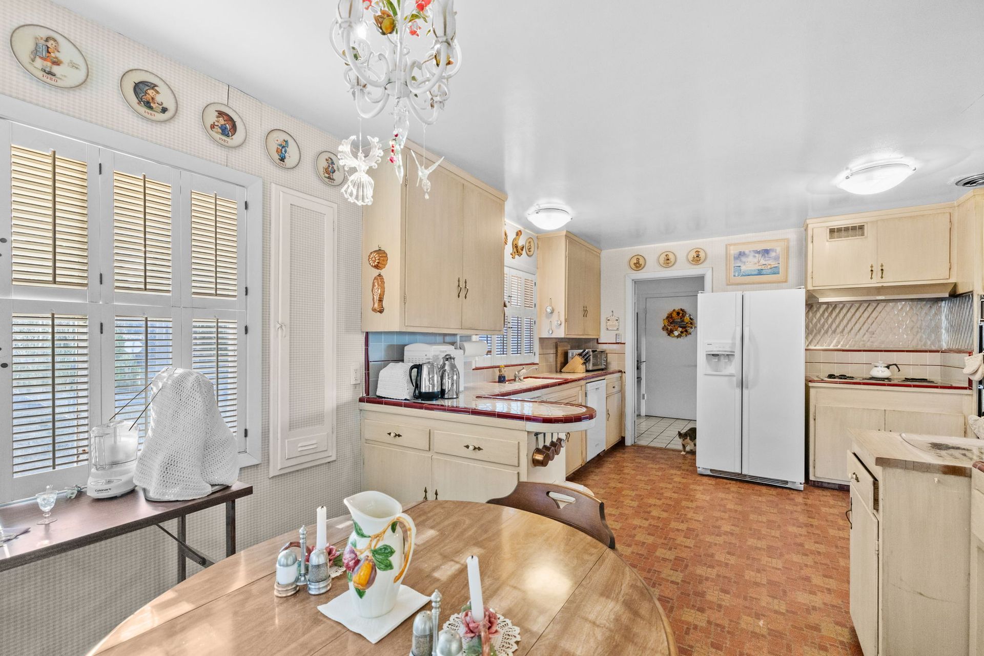 Adjacent to the living room is a formal dining room, with a wall of glass and a glass sliding door that grants access to the covered rear patio. This layout is ideal, extending your living space and allowing for dining al fresco. The efficient kitchen opens to a quaint breakfast nook with corner windows that bring in plenty of natural light.