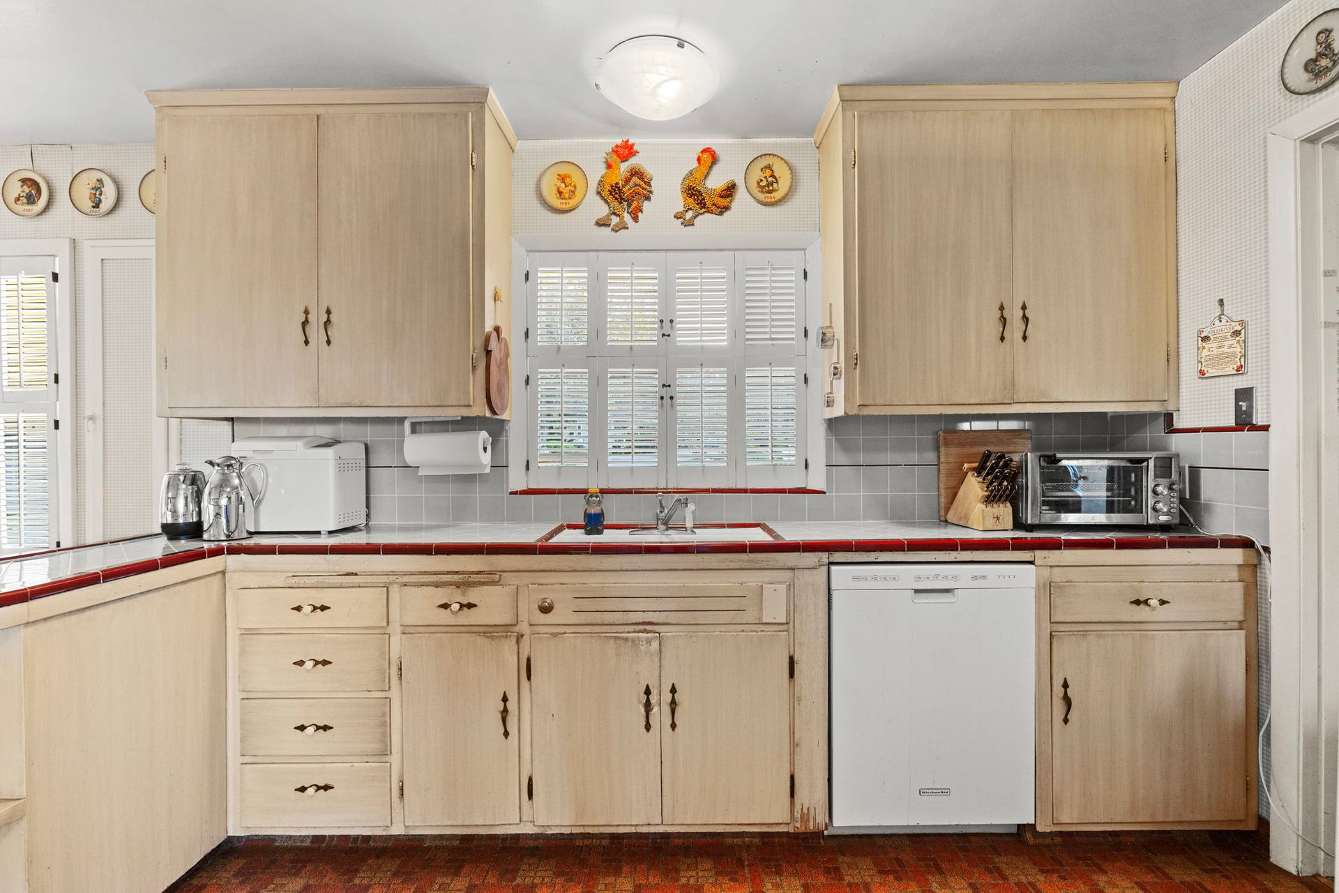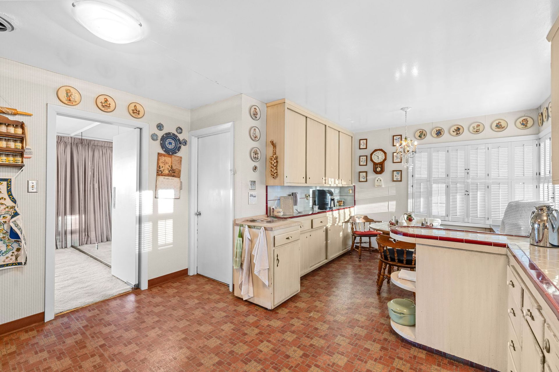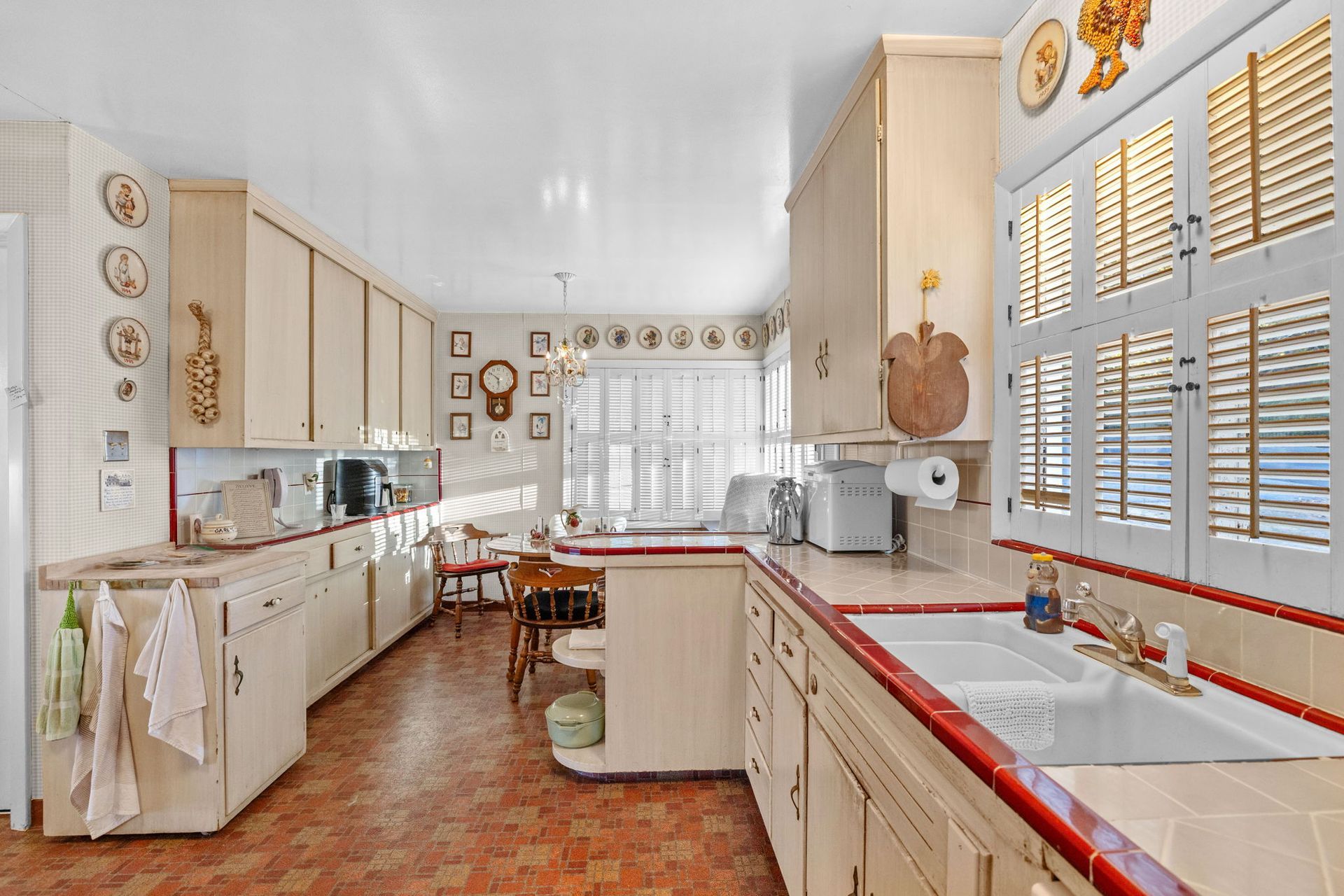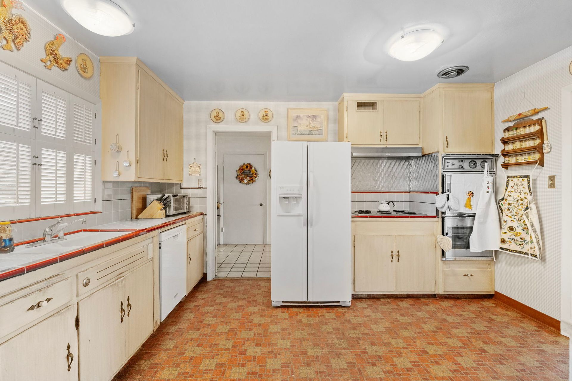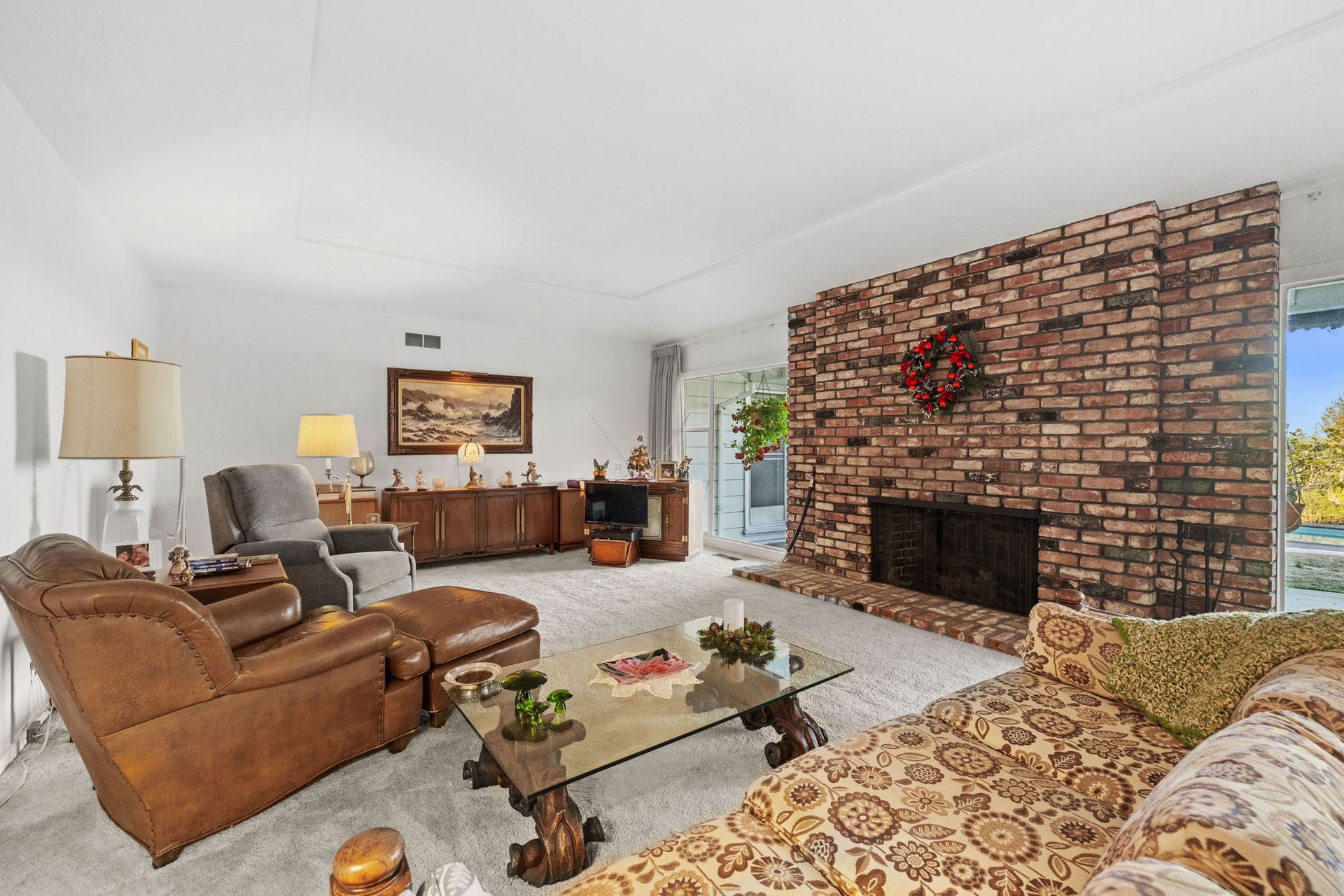 Adjacent to the living room is a formal dining room, with a wall of glass and a glass sliding door that grants access to the covered rear patio. This layout is ideal, extending your living space and allowing for dining al fresco. The efficient kitchen opens to a quaint breakfast nook with corner windows that bring in plenty of natural light.