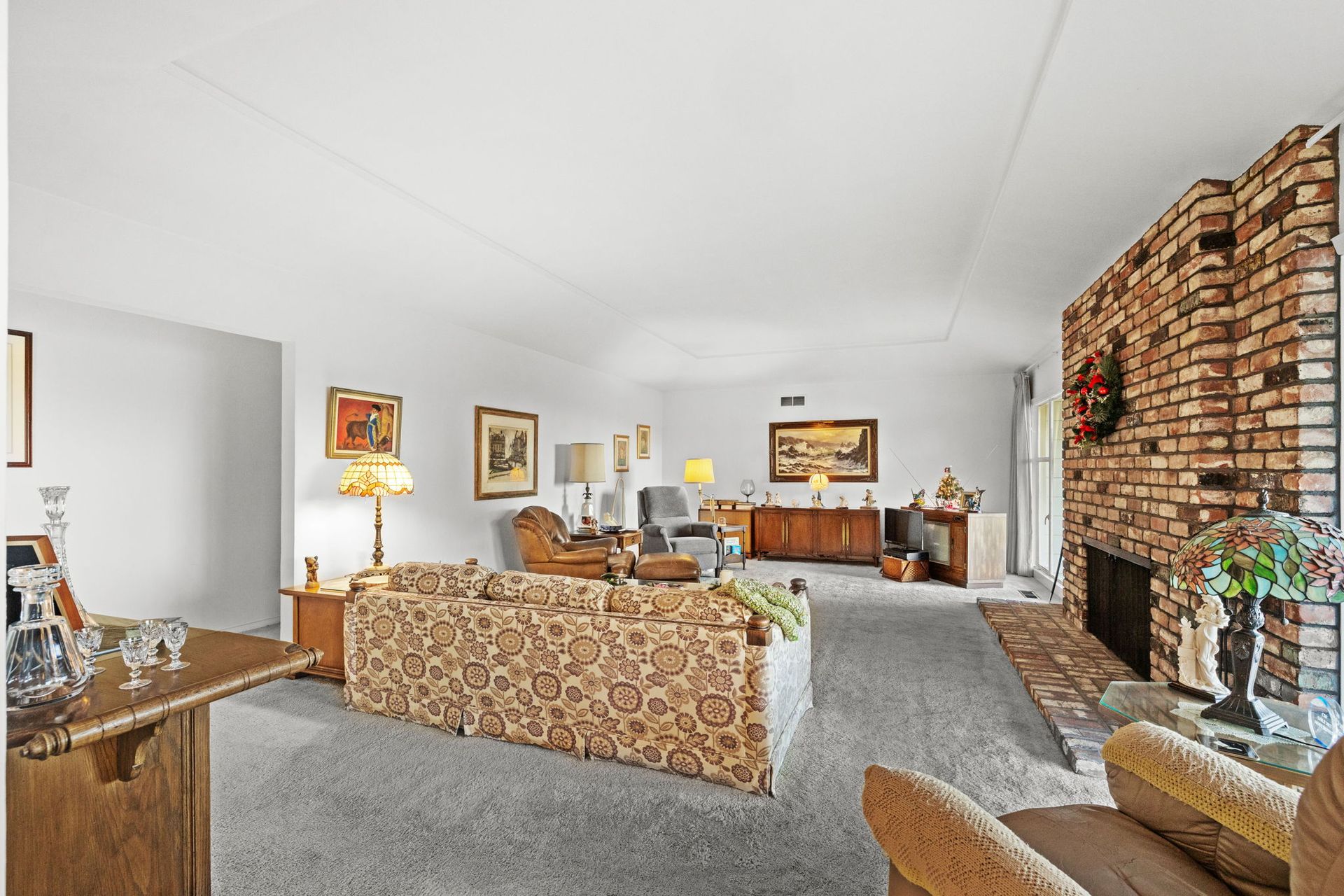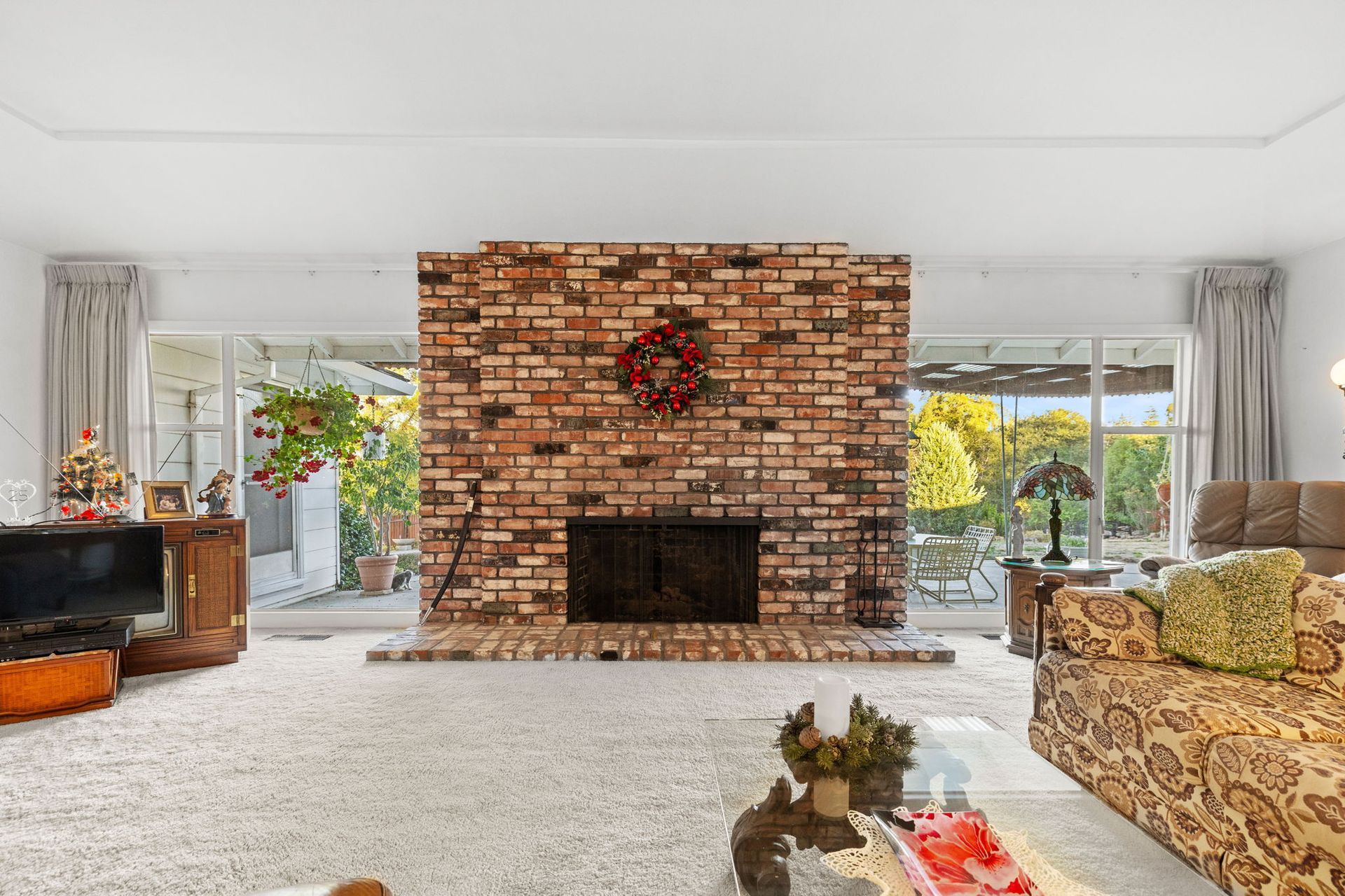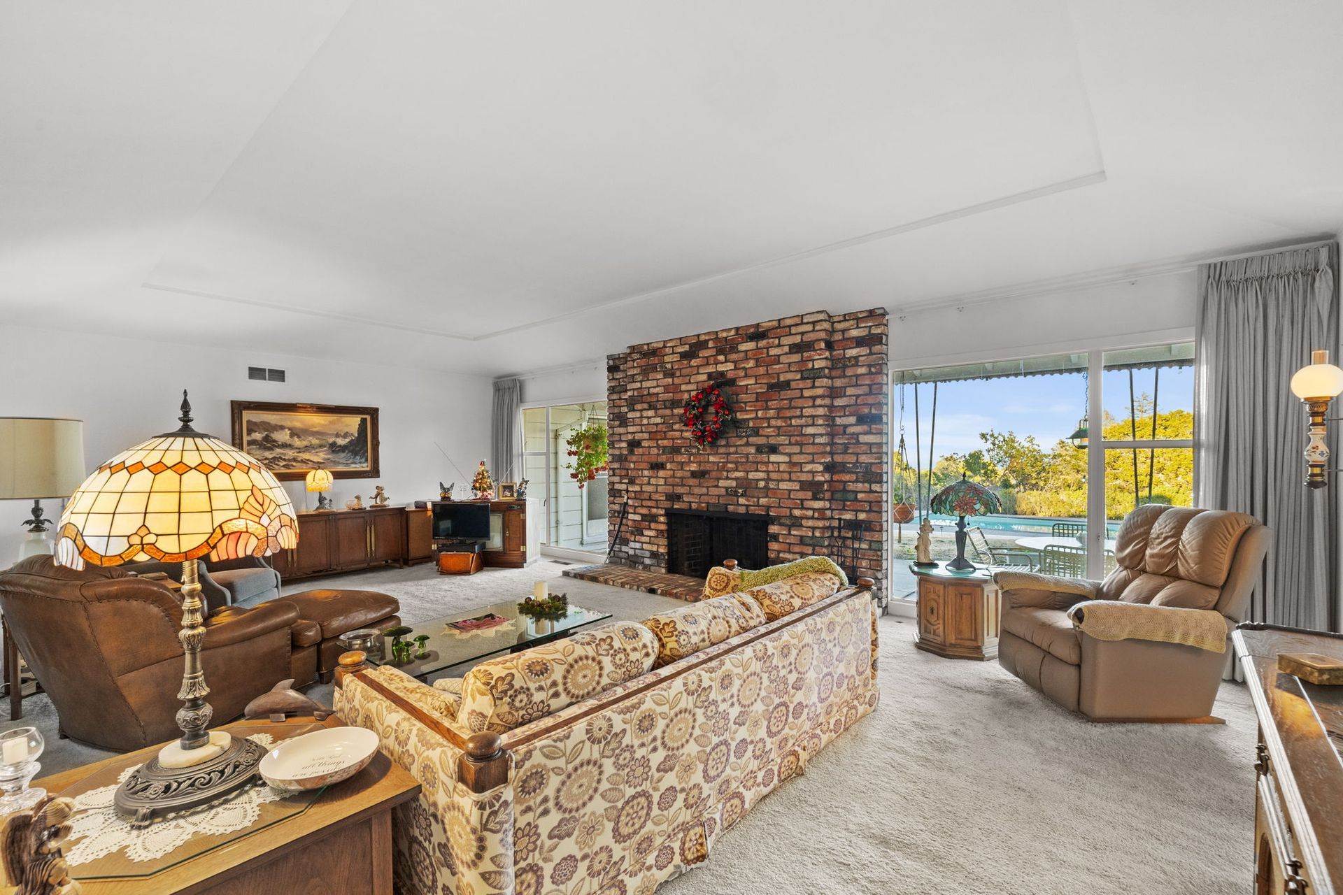 - Cozy and bright with a brick fireplace and large windows offering scenic views.