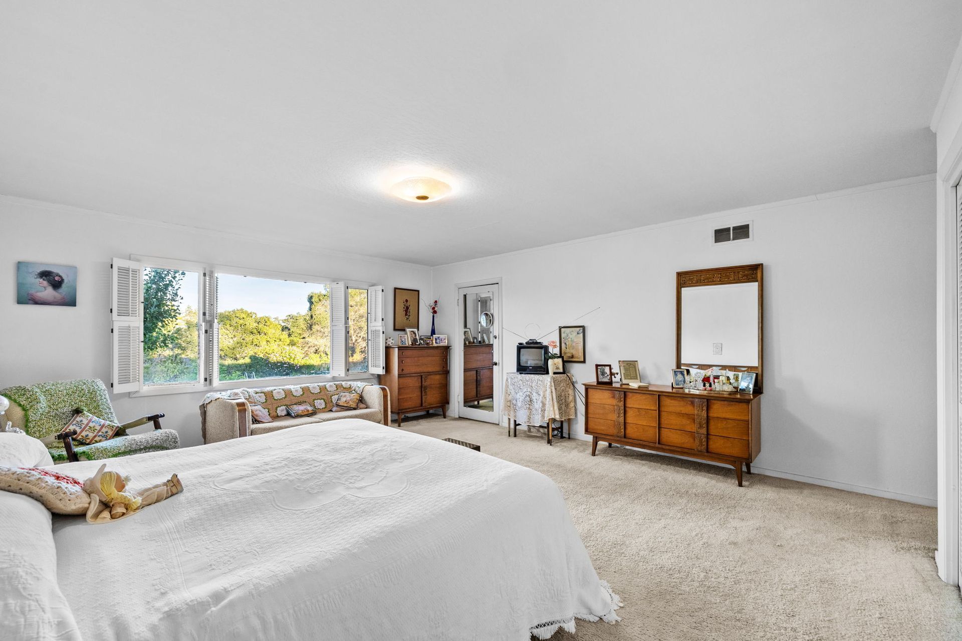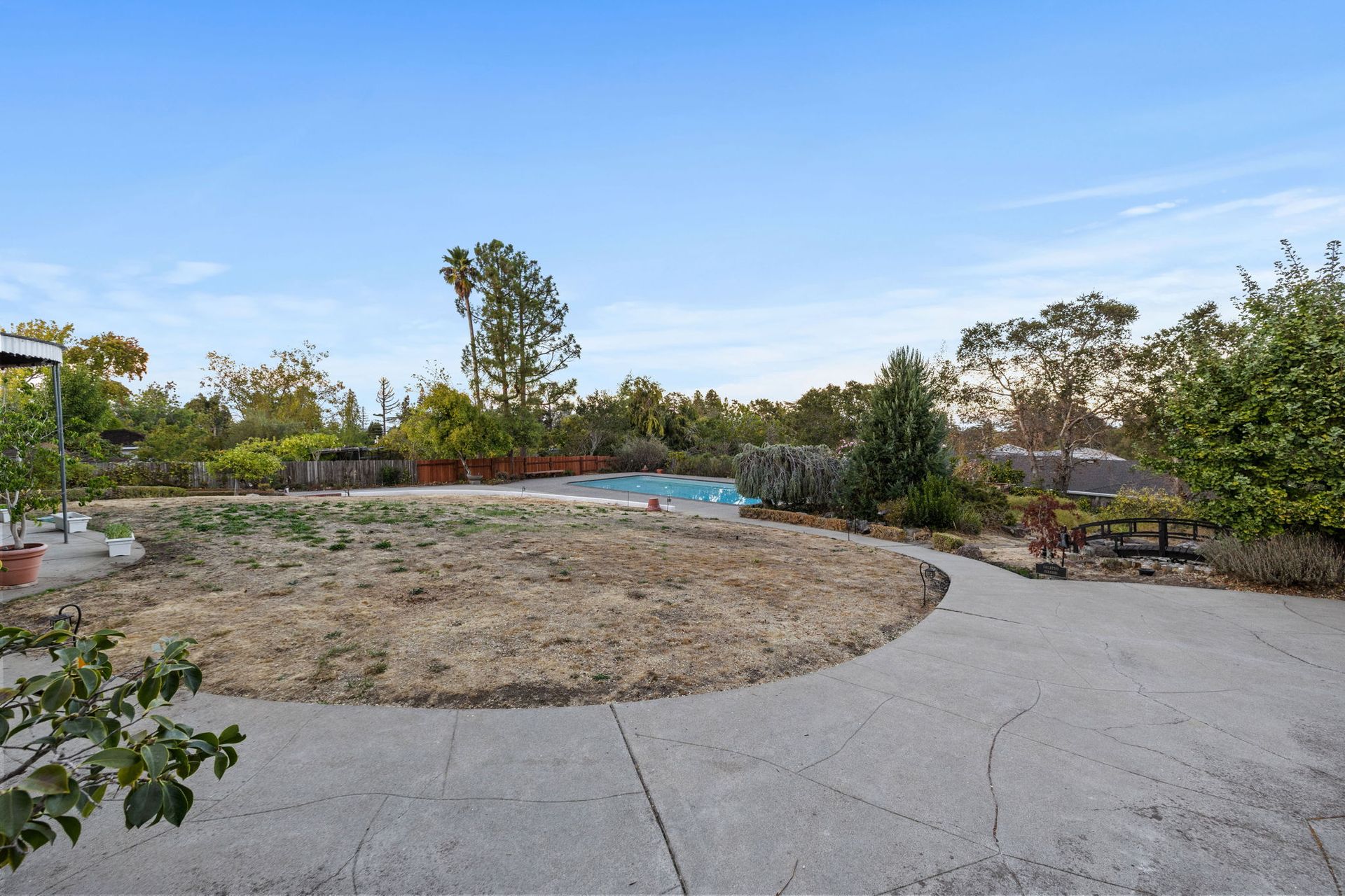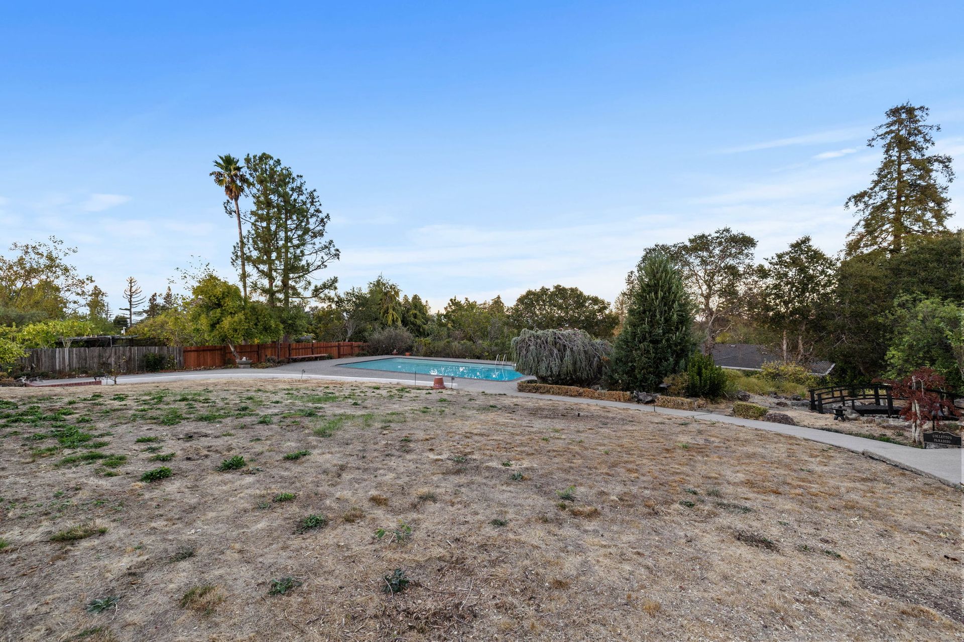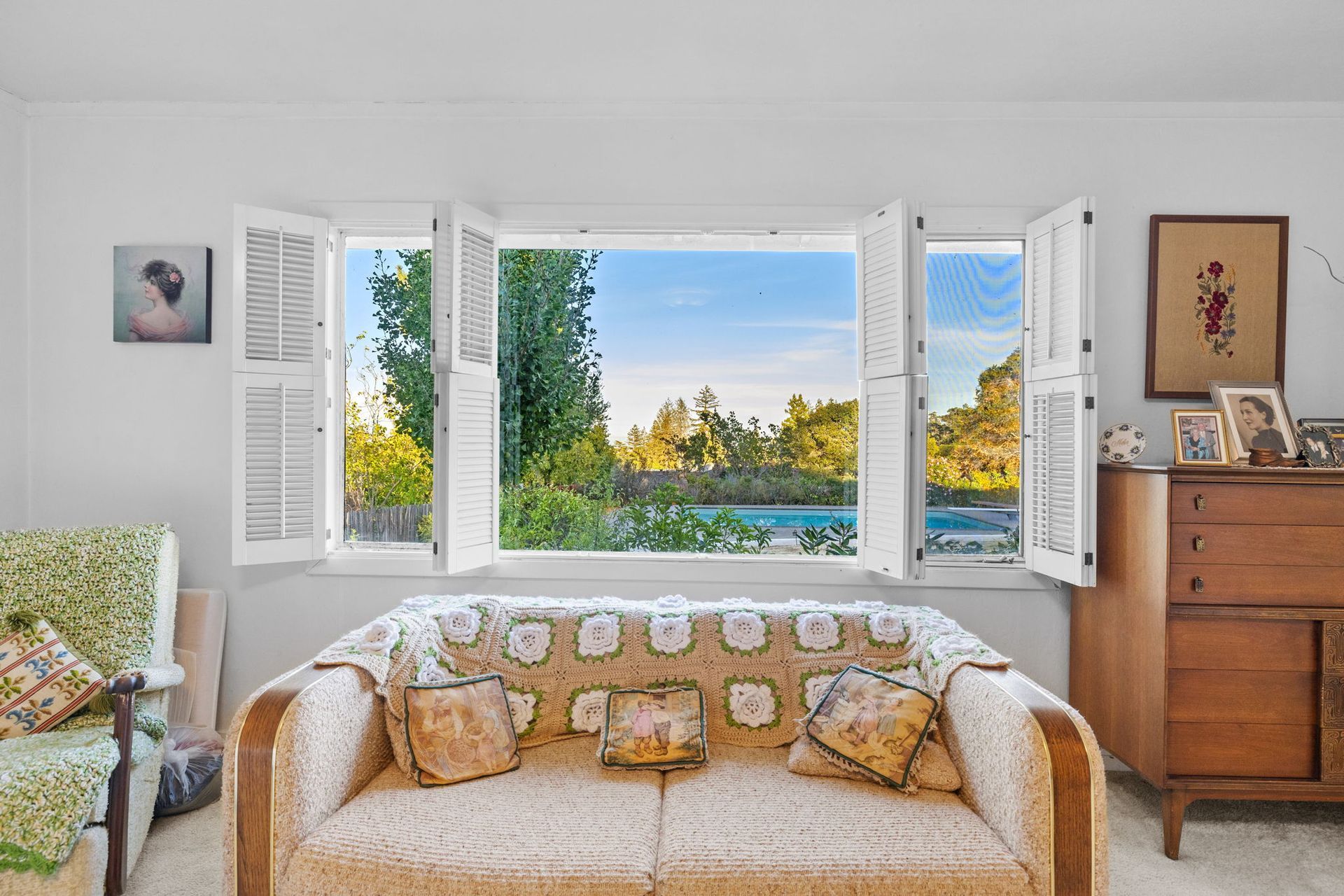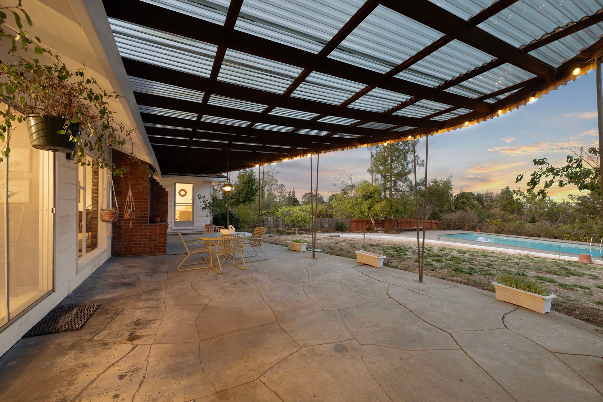 The bedroom wing includes the expansive primary en-suite with gorgeous views and opens to the patio and yard beyond. Two spacious secondary bedrooms and hall bath complete the private quarters. Outside, the patio embodies quintessential California living, serving as an extension of the home with ample space for both outdoor lounging and dining. Perfect for entertaining, it provides an ideal setting for gatherings, from casual barbecues to elegant dinner parties under the stars. Beyond the patio, a sweeping lawn leads to the pool, offering picturesque views with glimpses of the Bay, enhancing the ambiance for any occasion.