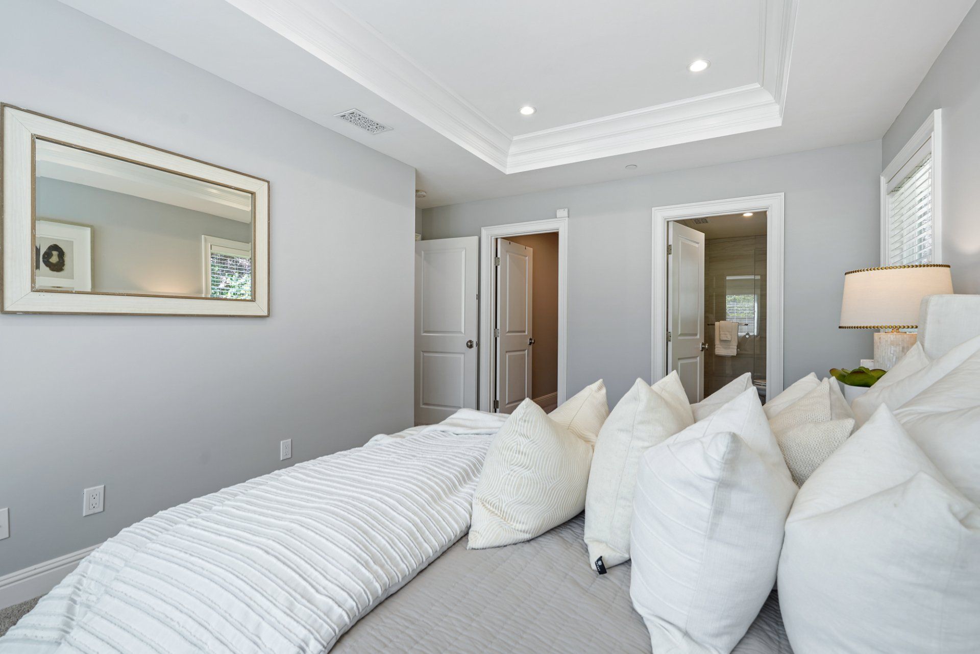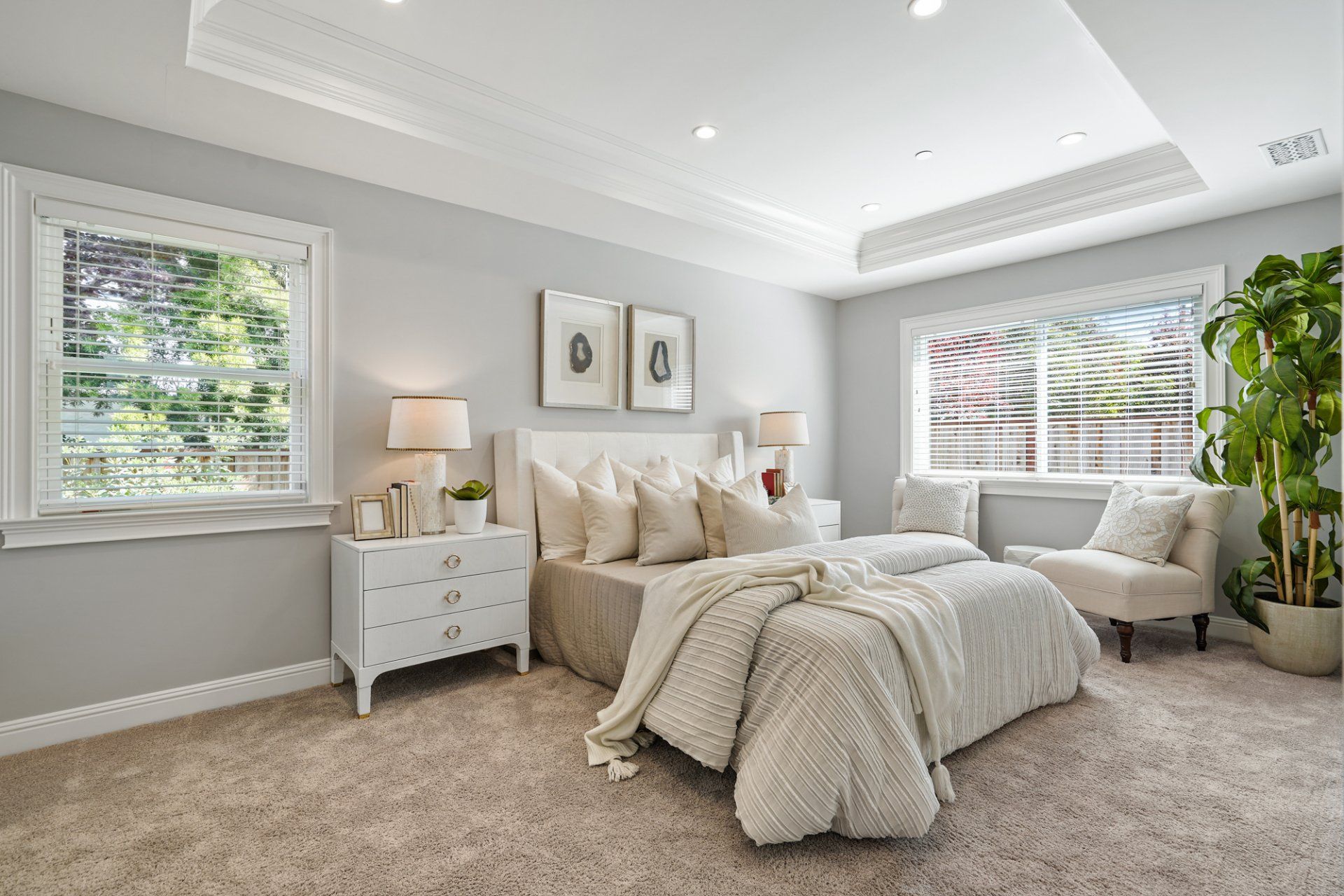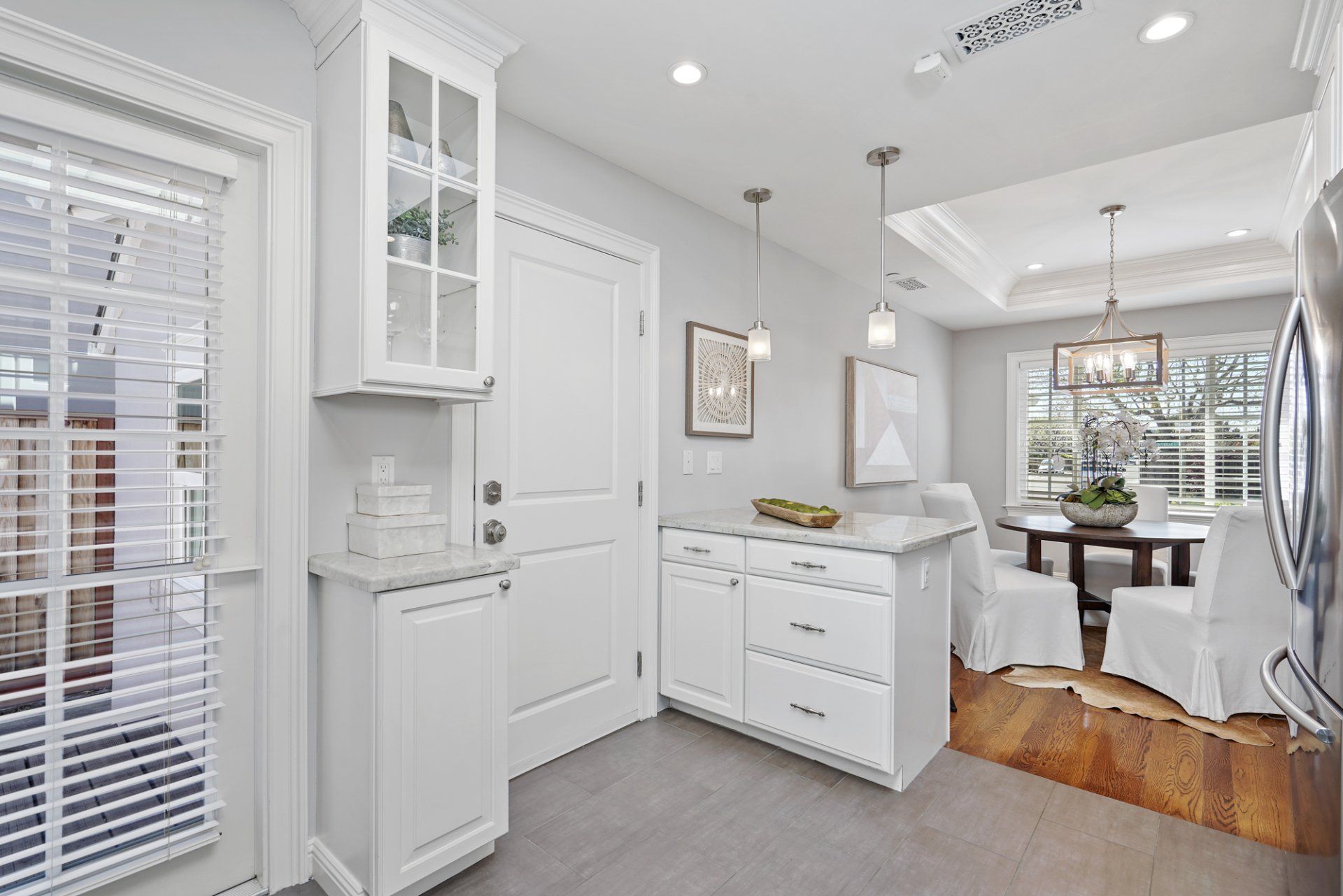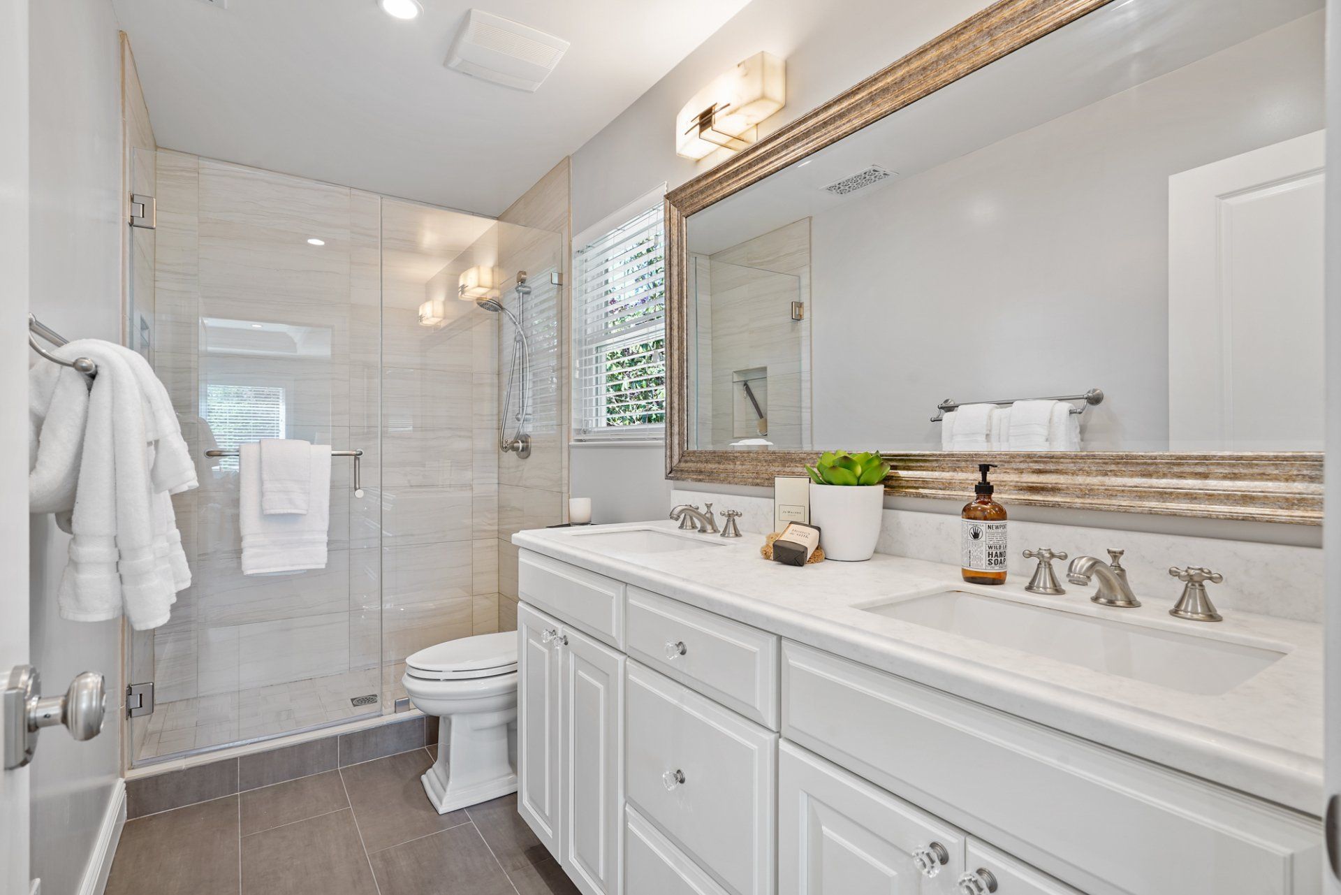 From the main living spaces a hallway, boasting extra closet and storage space as well as a skylight, leads to the private quarters. The primary suite features a tray ceiling, windows on two sides providing ample light, a walk-in closet with built-ins, and a luxurious bath with a twin-sink vanity and frameless shower. The two other bedrooms are each generously sized with plush gray carpets, and share the hallway bath that has been renovated with honeycomb floor tile and a marble vanity top.