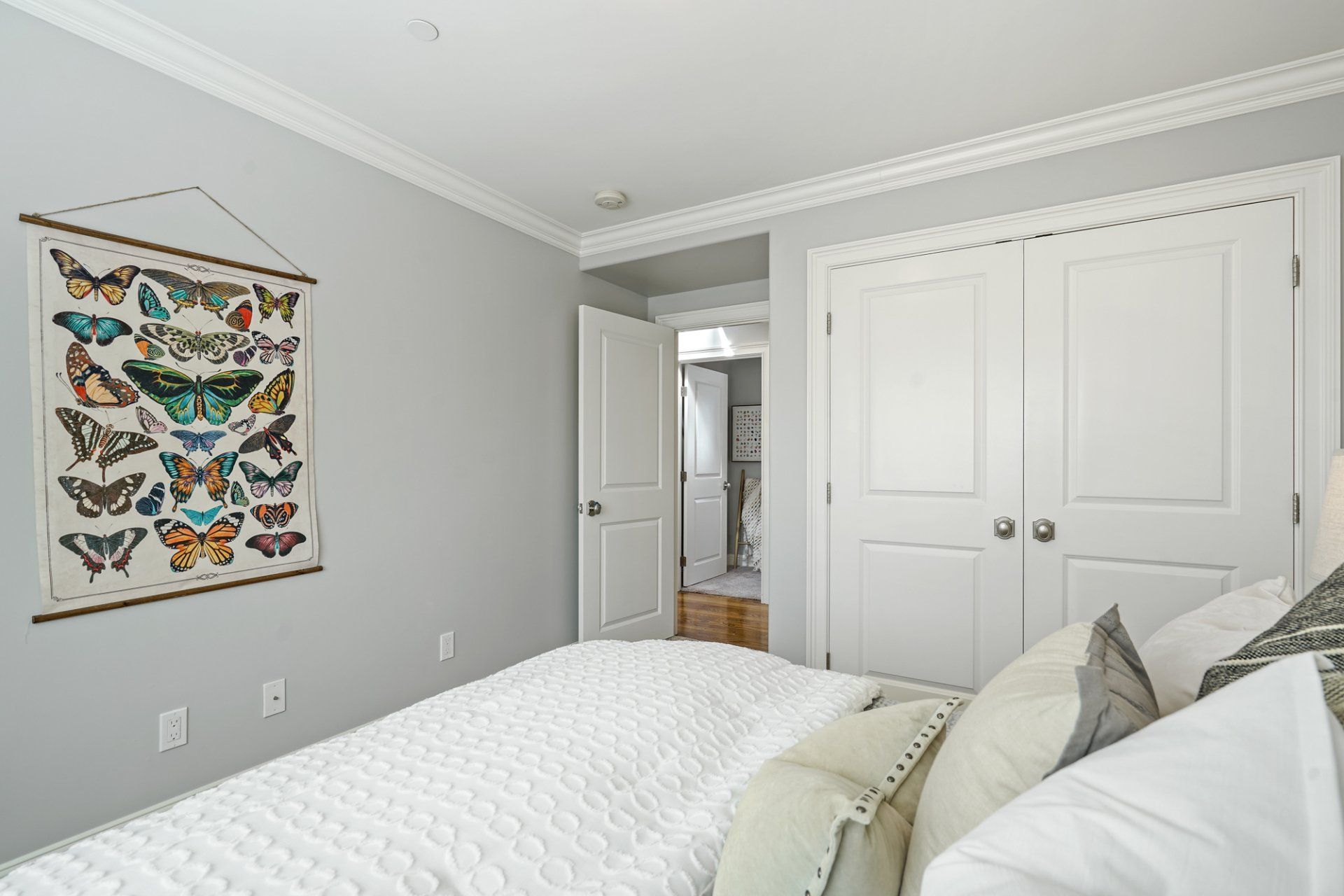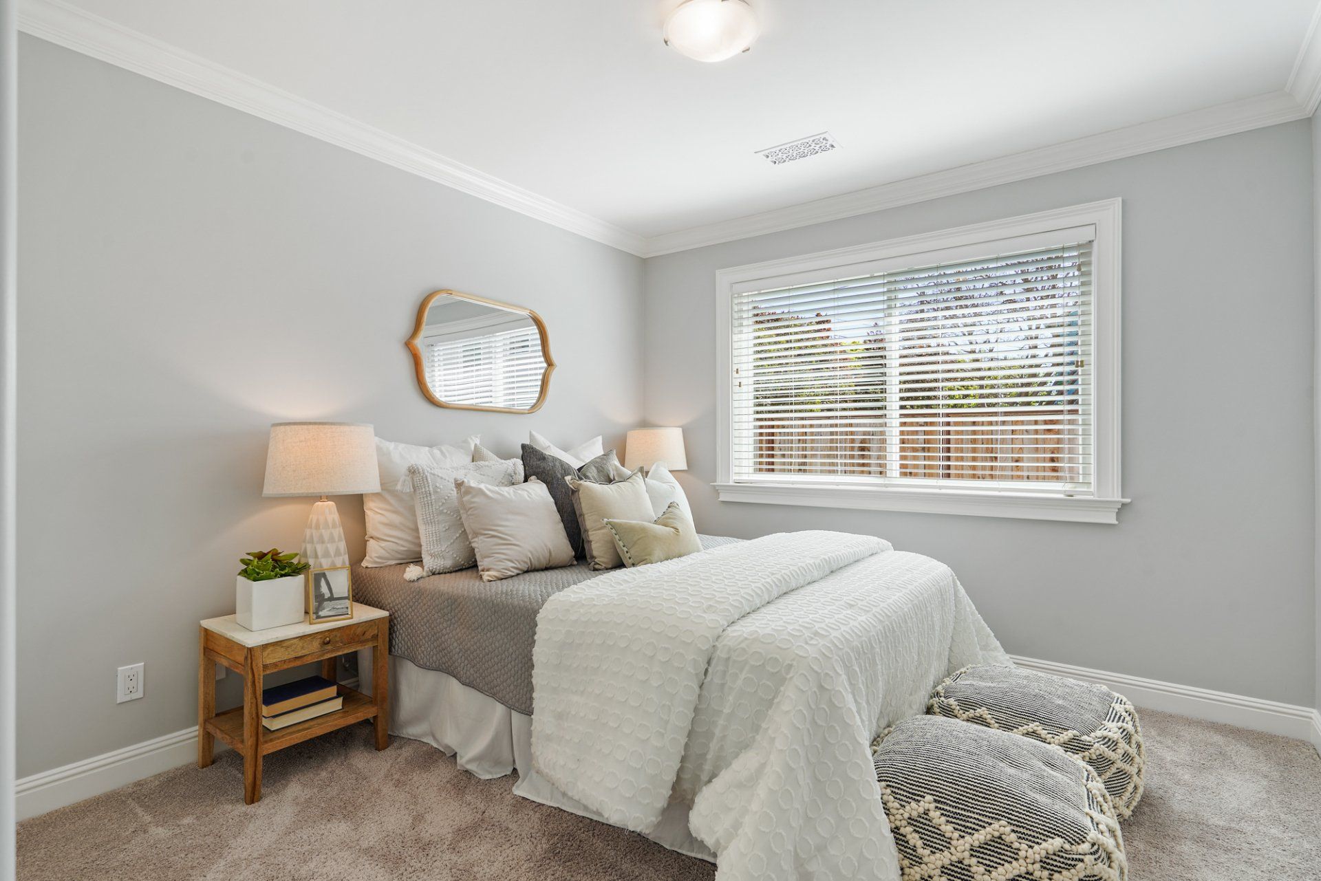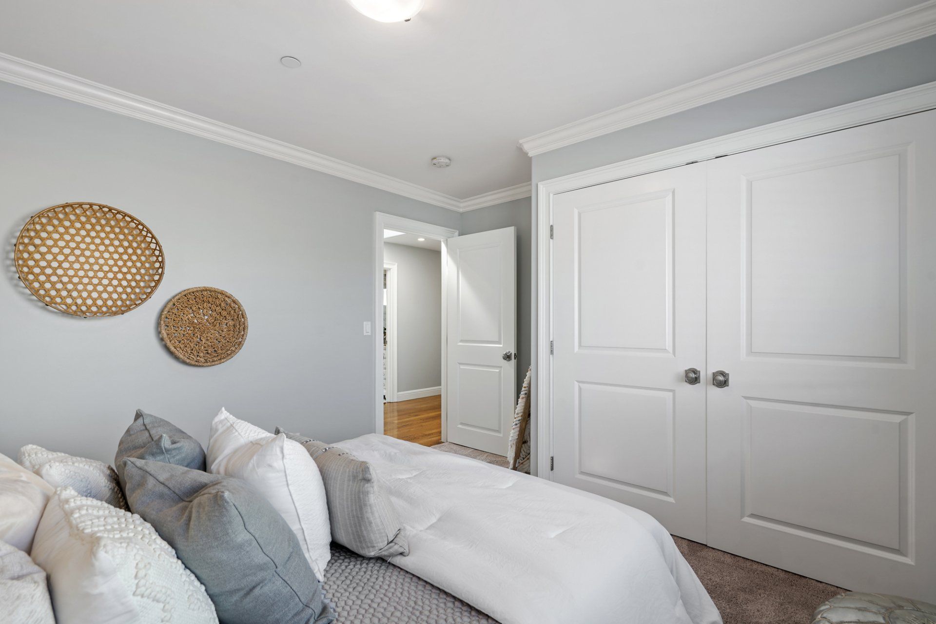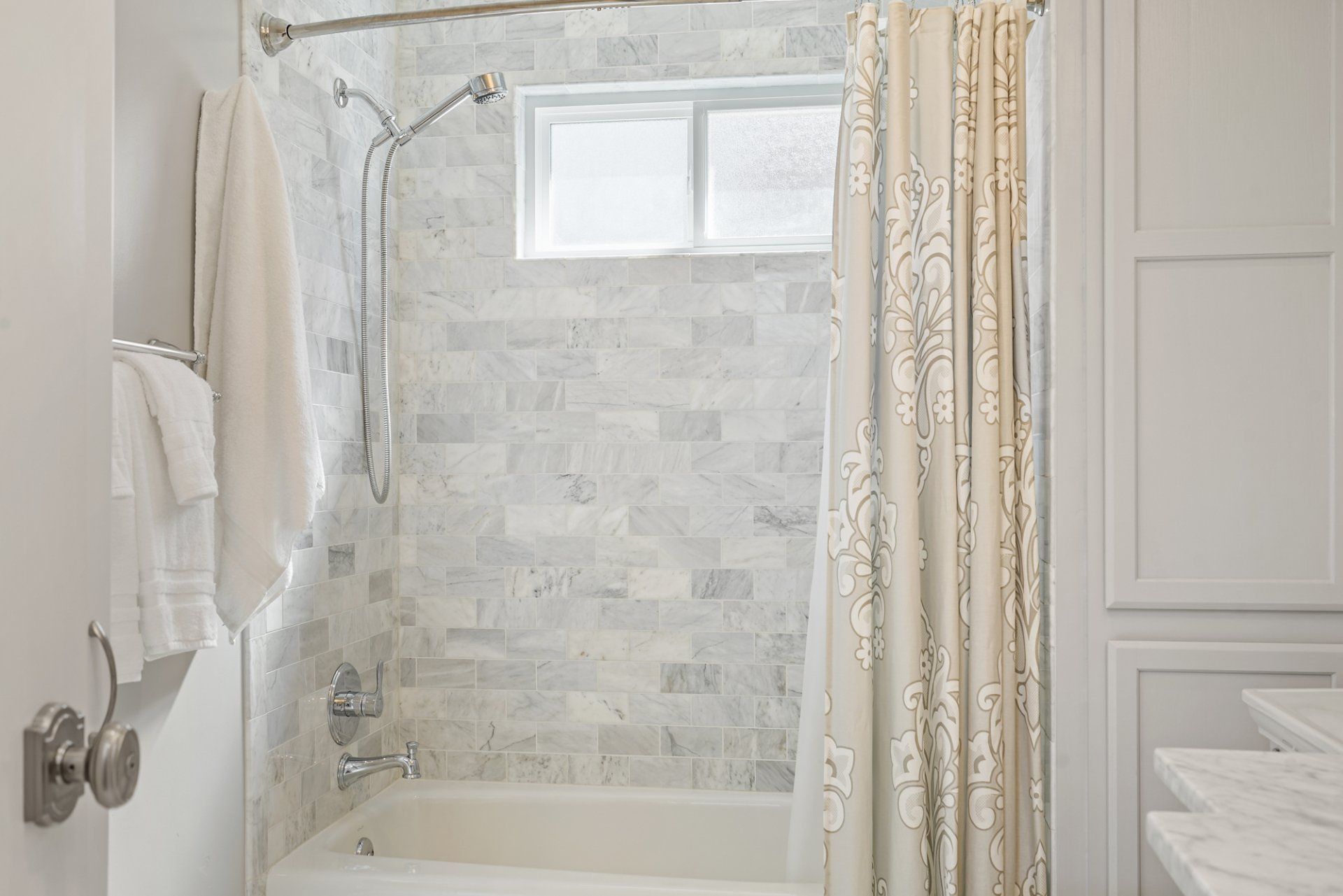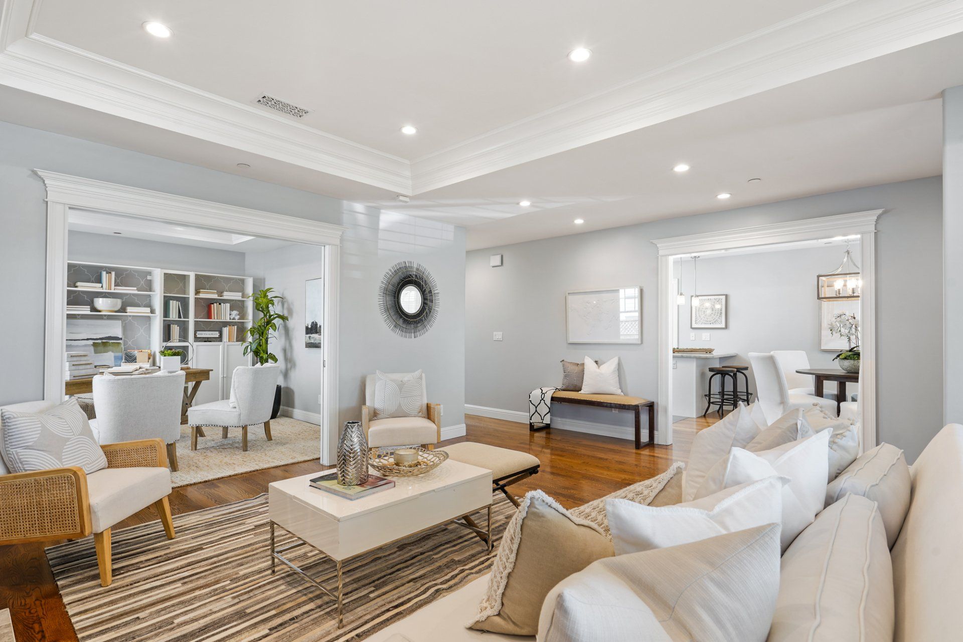 From the main living spaces a hallway, boasting extra closet and storage space as well as a skylight, leads to the private quarters. The primary suite features a tray ceiling, windows on two sides providing ample light, a walk-in closet with built-ins, and a luxurious bath with a twin-sink vanity and frameless shower. The two other bedrooms are each generously sized with plush gray carpets, and share the hallway bath that has been renovated with honeycomb floor tile and a marble vanity top.