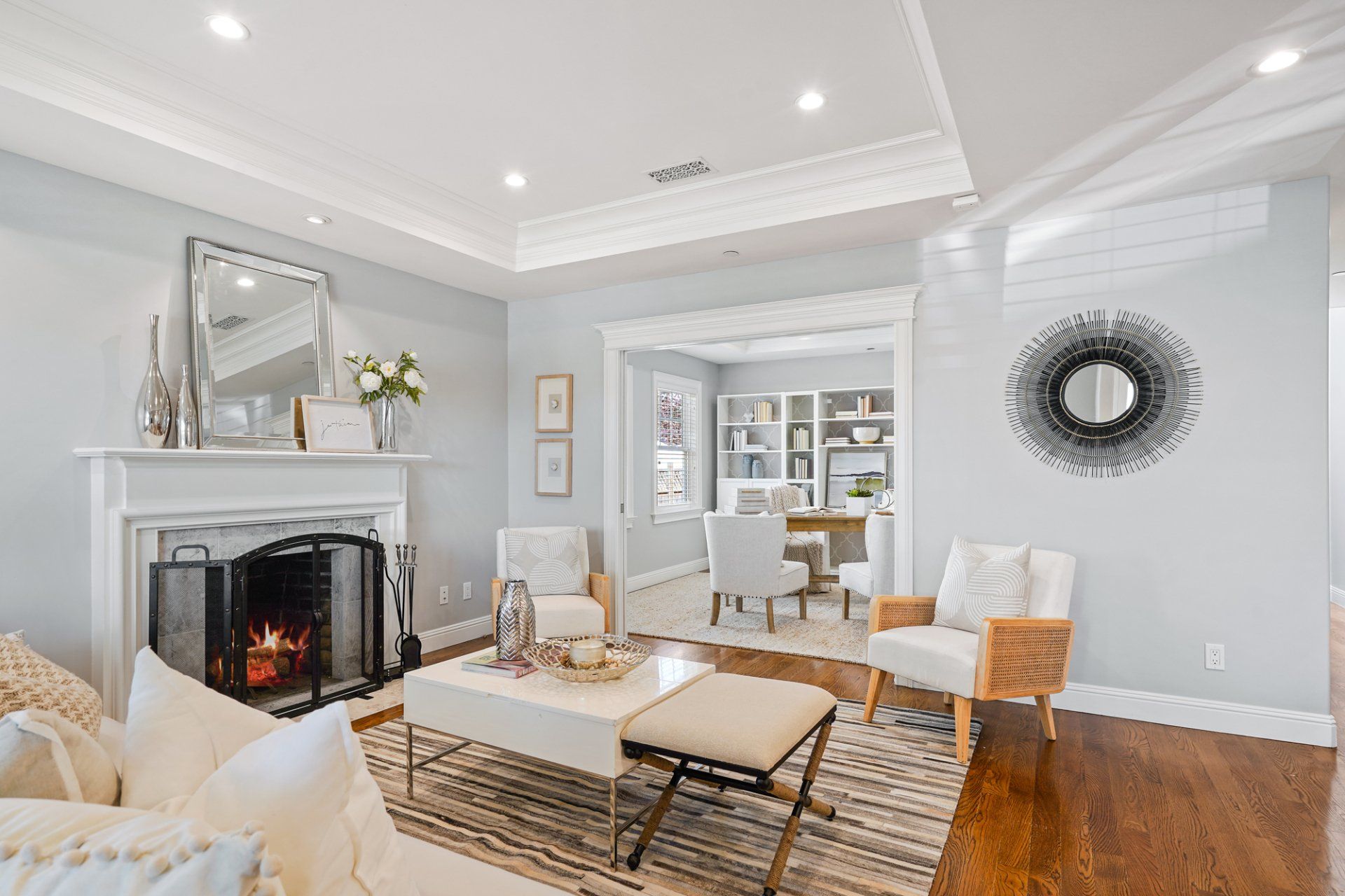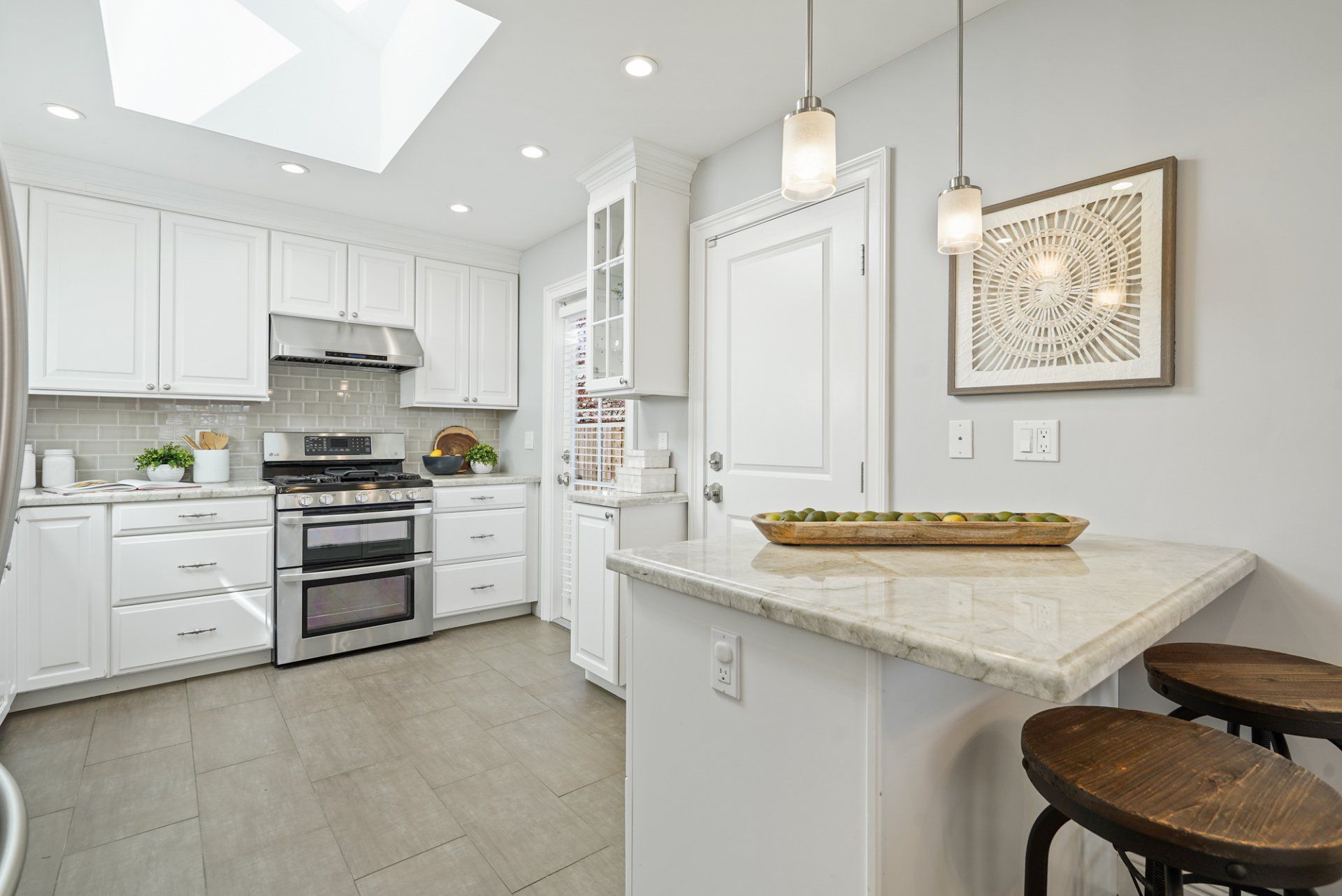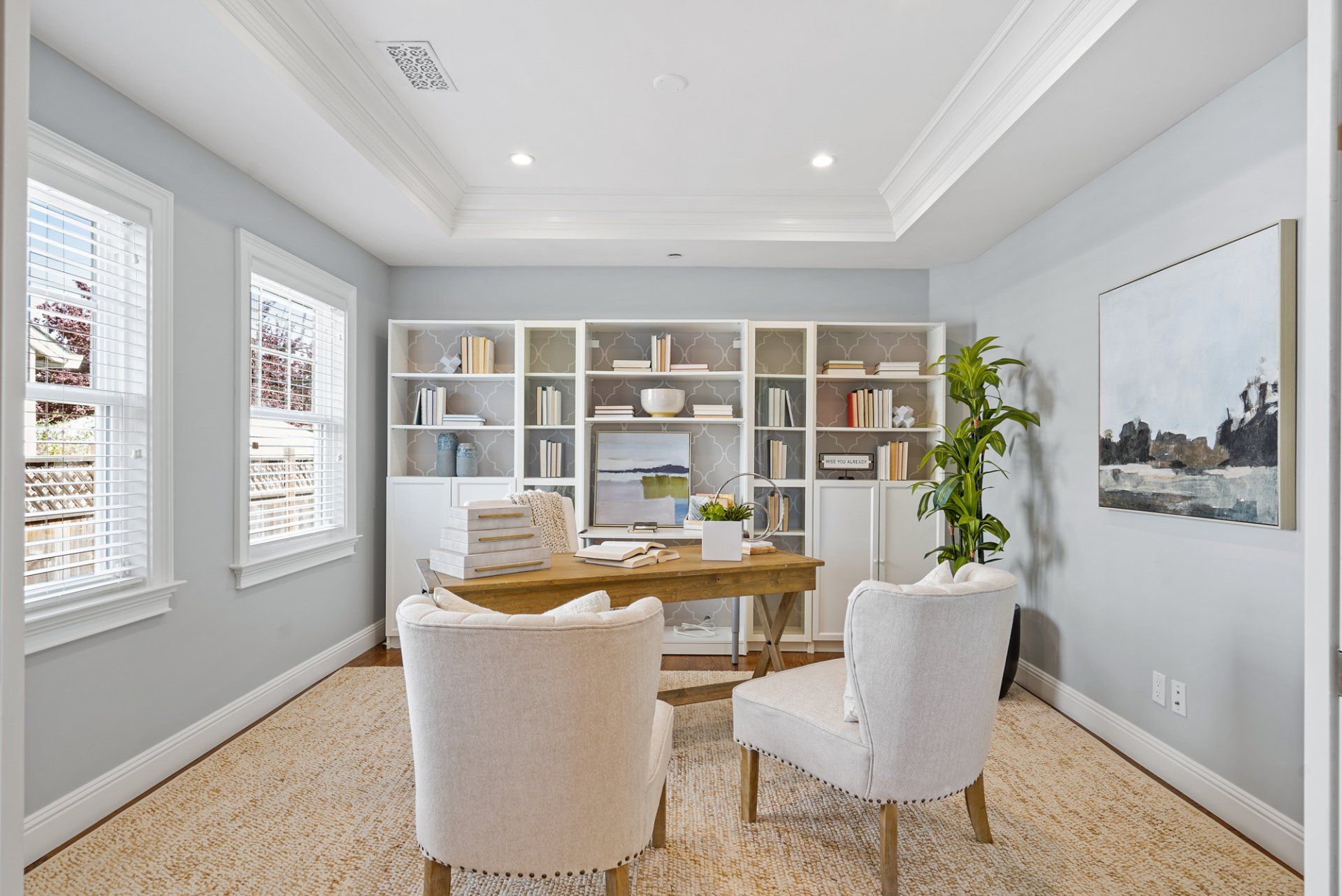 The entire front of the house is bright and open, with dramatic tray ceilings and an exceptional amount of natural light. The large living room area offers sunny exposures on two sides and a lovely wood-burning fireplace. An extra-wide entry with pocket doors segues to a delightful bonus room that could serve as a work-from-home office, media room, or guest space. The large dining area with its front-facing windows is connected to a gourmet kitchen boasting a skylight, quartz counters, stainless steel appliances, white cabinets and a gray tile backsplash. From the kitchen, you have access to both the backyard and the garage.