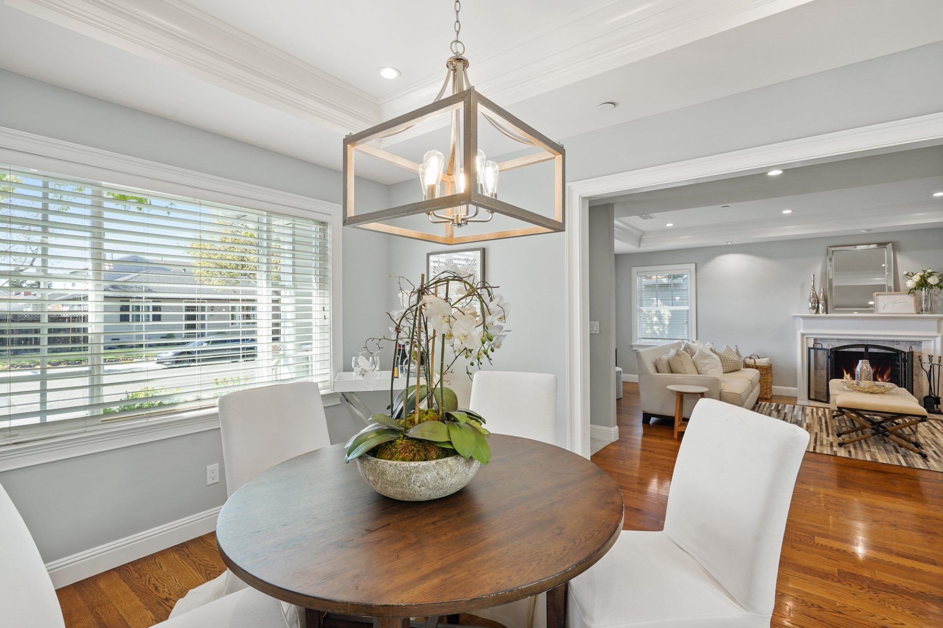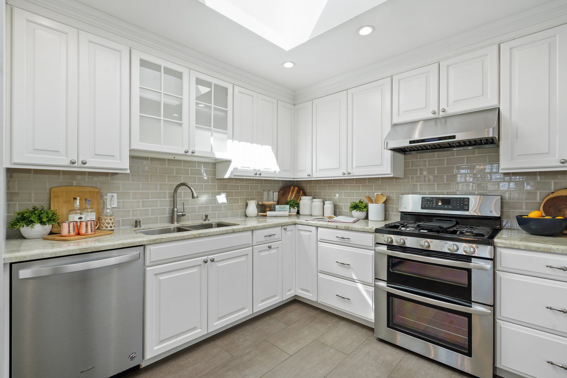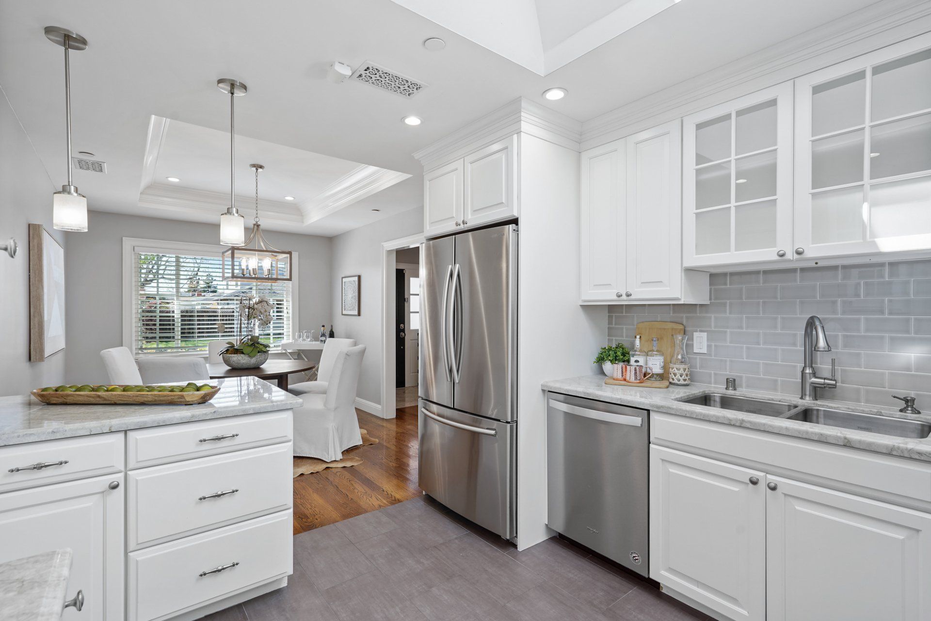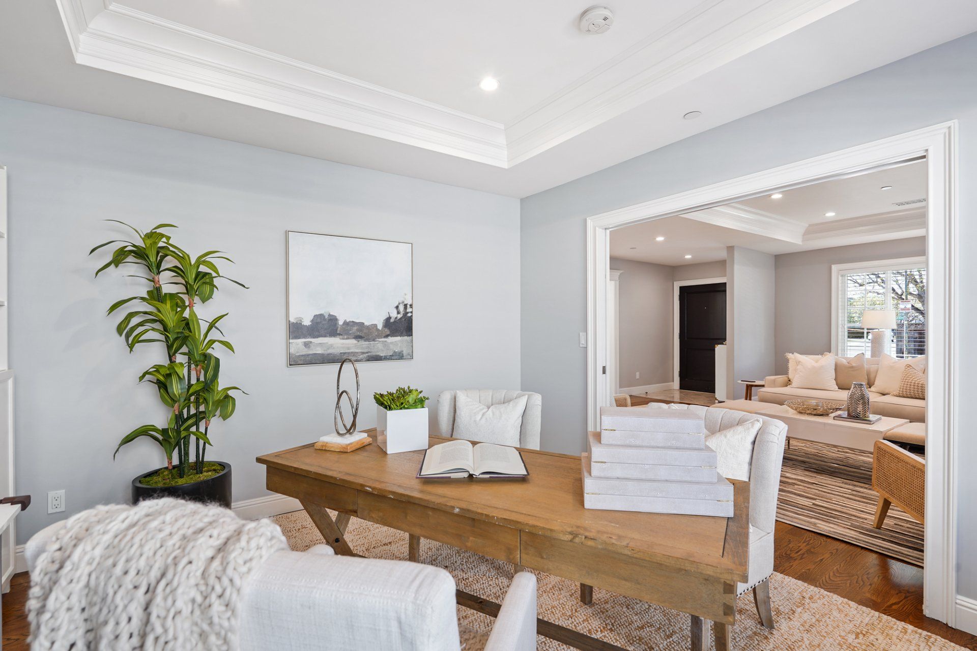 The entire front of the house is bright and open, with dramatic tray ceilings and an exceptional amount of natural light. The large living room area offers sunny exposures on two sides and a lovely wood-burning fireplace. An extra-wide entry with pocket doors segues to a delightful bonus room that could serve as a work-from-home office, media room, or guest space. The large dining area with its front-facing windows is connected to a gourmet kitchen boasting a skylight, quartz counters, stainless steel appliances, white cabinets and a gray tile backsplash. From the kitchen, you have access to both the backyard and the garage.