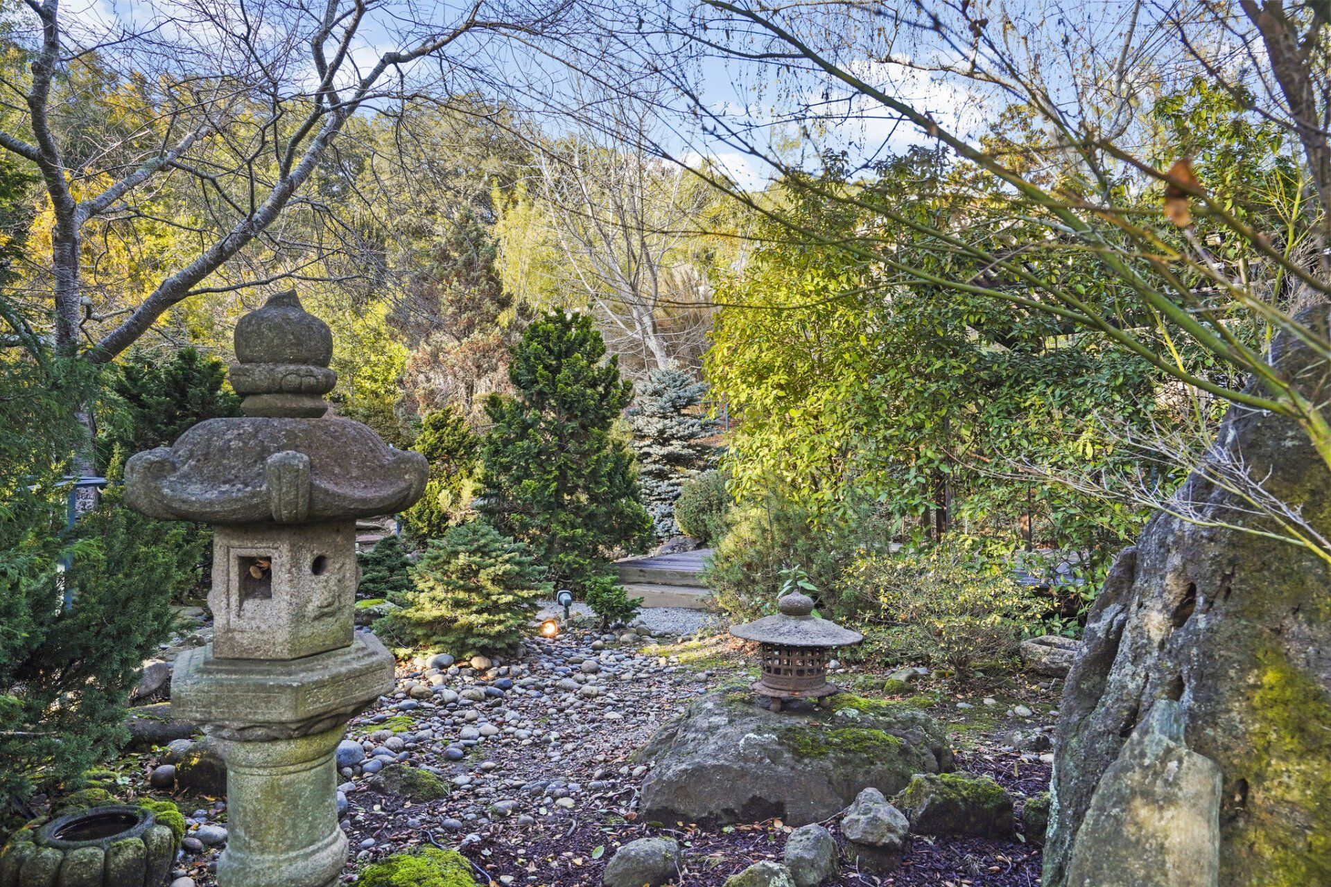 As if the interior wasn’t dreamy enough, the backyard is an enchanting oasis. This stunning Japanese style garden was imagined by the previous owner, Dr. Werner Rosenau. From glass sliders, pea gravel and moss stone covered paths guide you on a tranquil journey through the garden to lovely vignettes filled with Japanese lanterns and an array of carefully selected plantings. In the rear corner of the garden, a pergola frames stunning views of both the garden and the sophisticated home, while tiered garden beds off the upper level offer a place for vegetables and herbs.