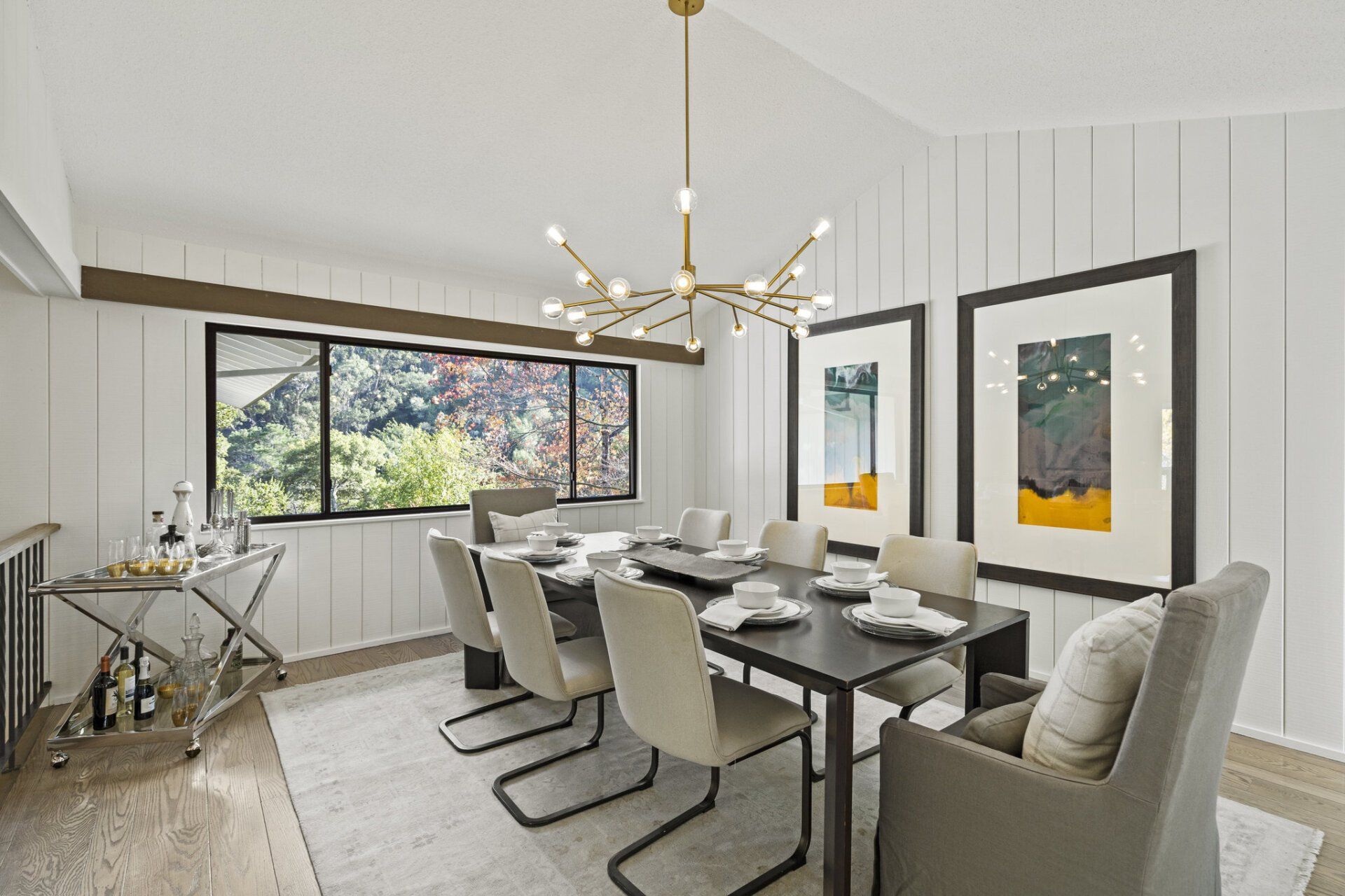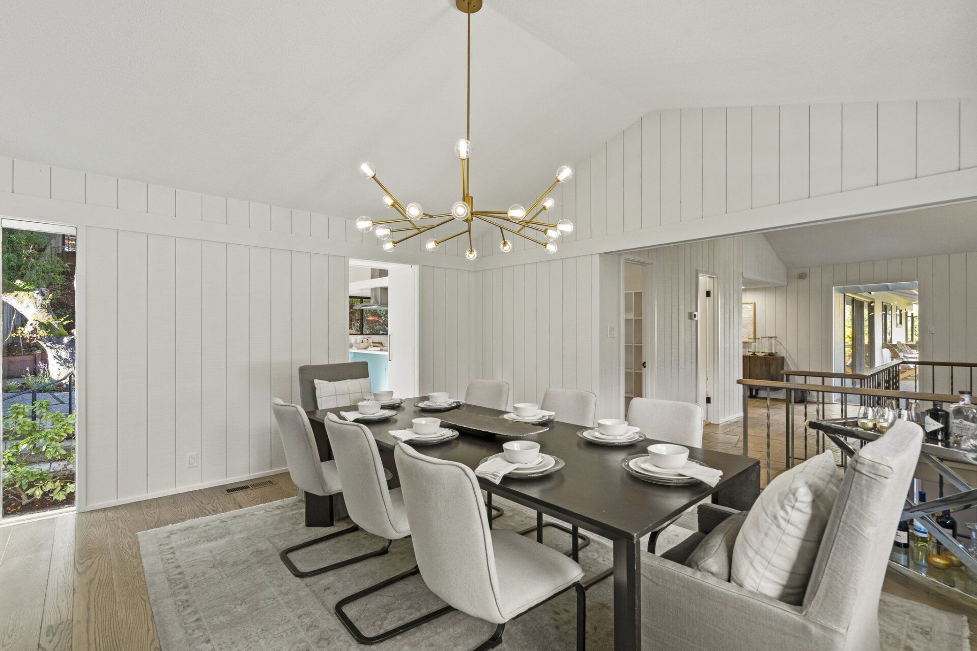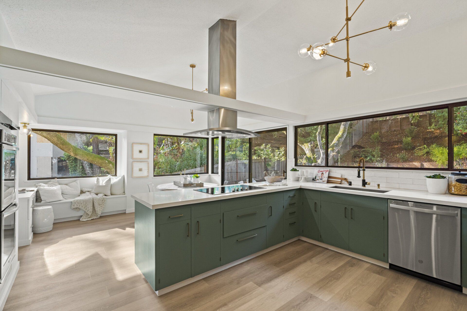 Drenched in natural light and offering views of the surrounding landscape, the formal dining room is connected to the freshly updated kitchen and offers an elegant space to share meals with family and friends. Boasting a full suite of stainless steel appliances, this chic kitchen incorporates sage cabinets finished with brass hardware, subway tile backsplash, and new stone countertops. Enjoy the added benefit of a wet bar, butler’s pantry, breakfast nook and glass sliders that flow out to the front patio for al-fresco dining.