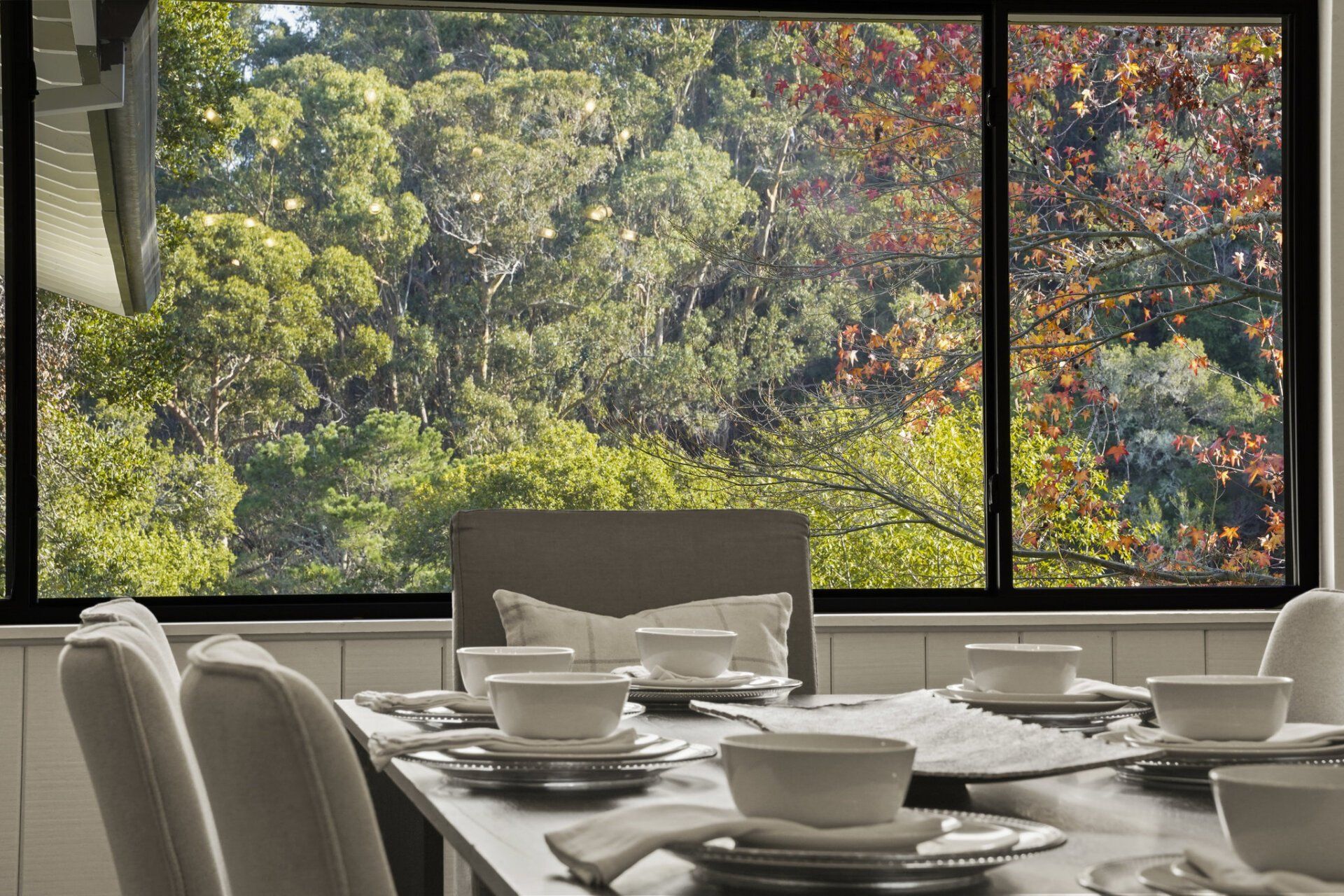 Sweeping double doors open to the impressive entry, where a chic chandelier is anchored in the high vaulted ceiling, and slate tile expands out ahead. Beyond the foyer, make your way to the large living room equipped with a stone-clad fireplace and a soaring, beamed ceiling. This excellent entertainment space is filled with light from windows and glass sliding doors that open to the expansive, newly refinished deck which provides a view of the Japanese garden below.